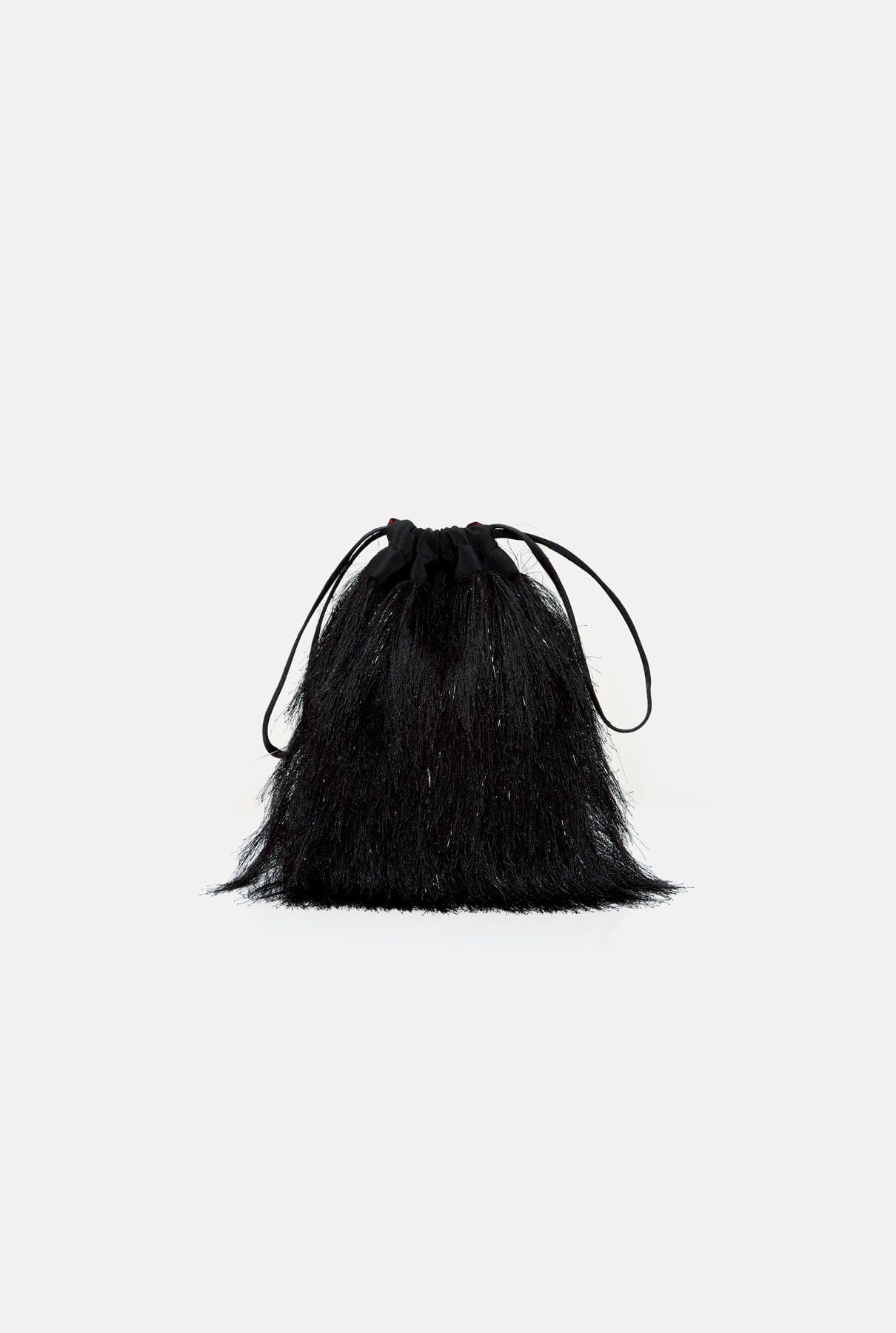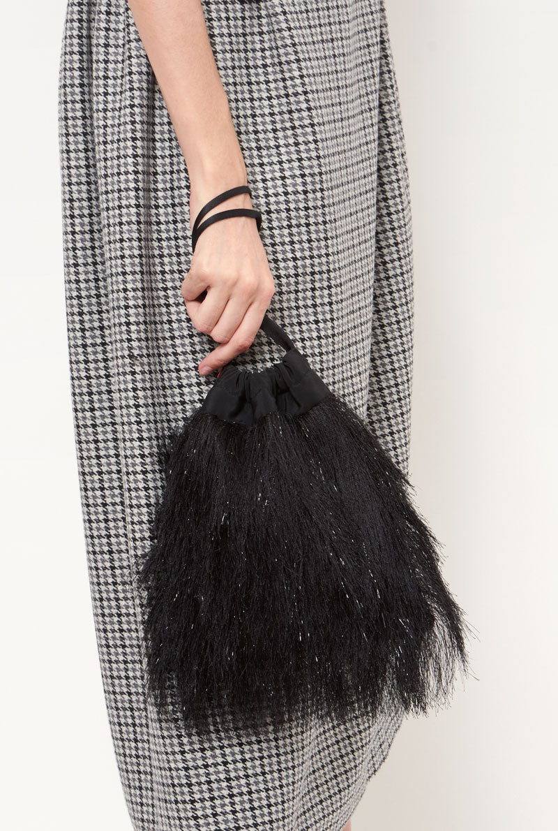 This bolsito embellished with delicate black fringe fabric has a soft feel and effortless shape with drawstring closure for easy fastening. It is the perfect touch for your evening events. Designed by Laia Alen.