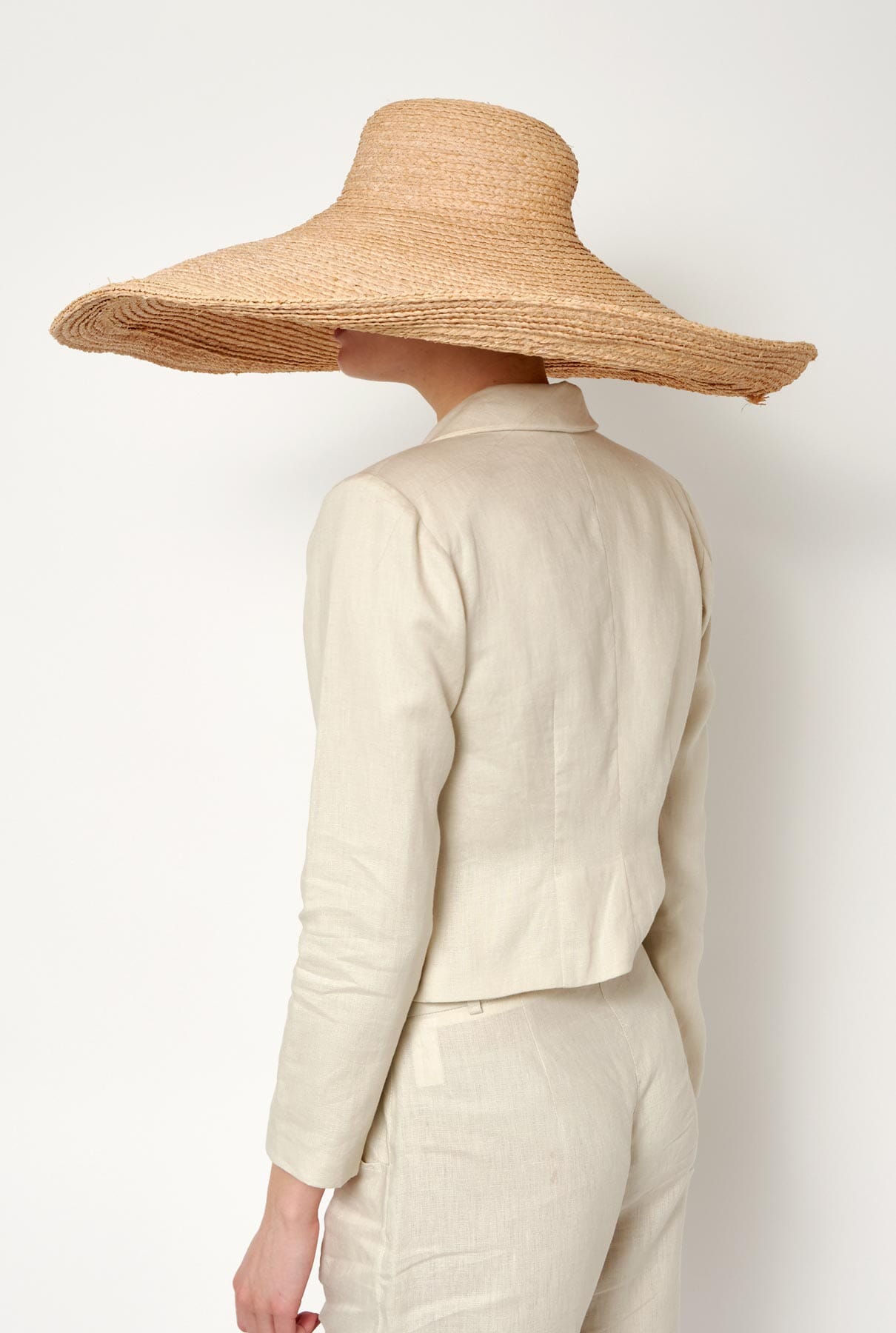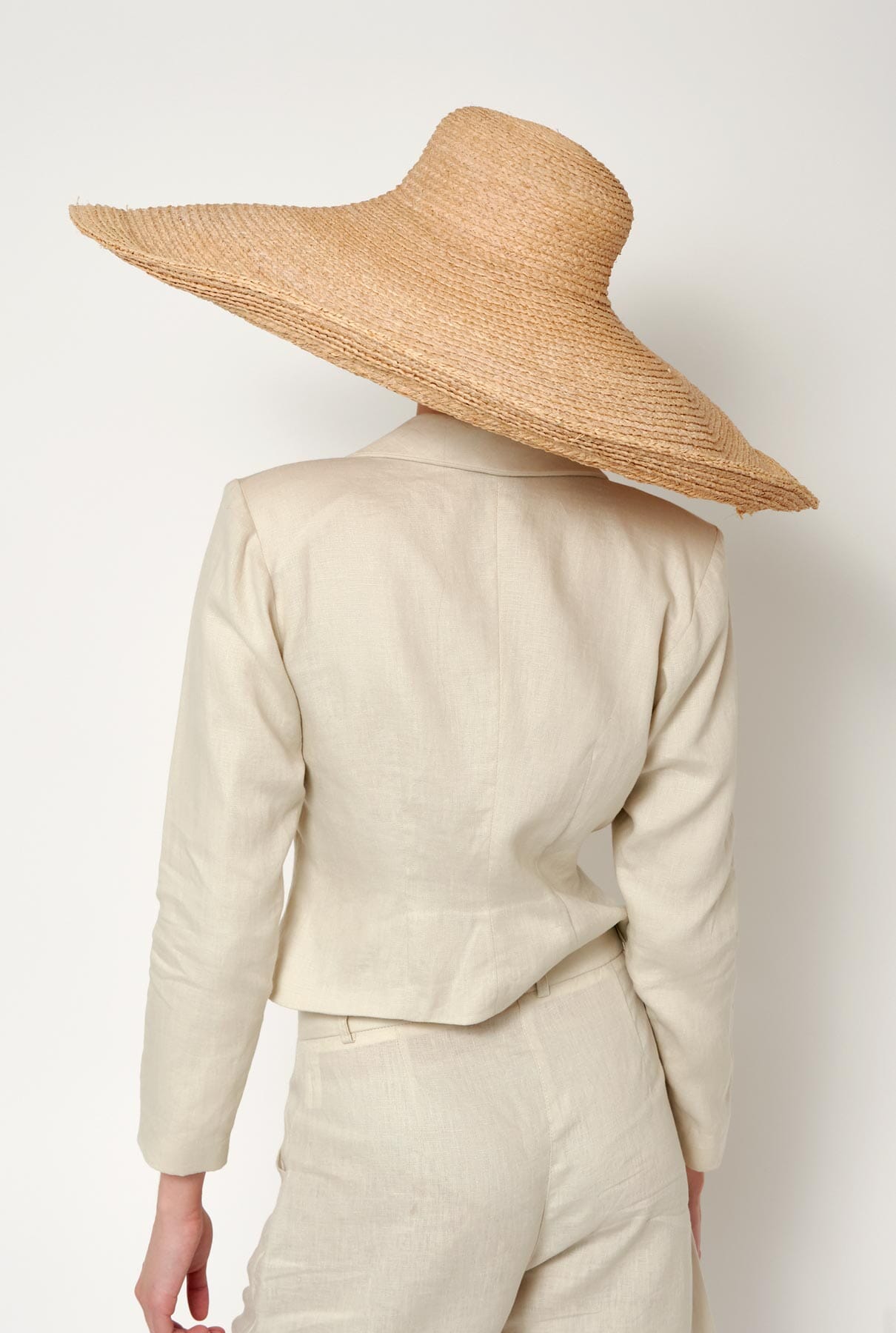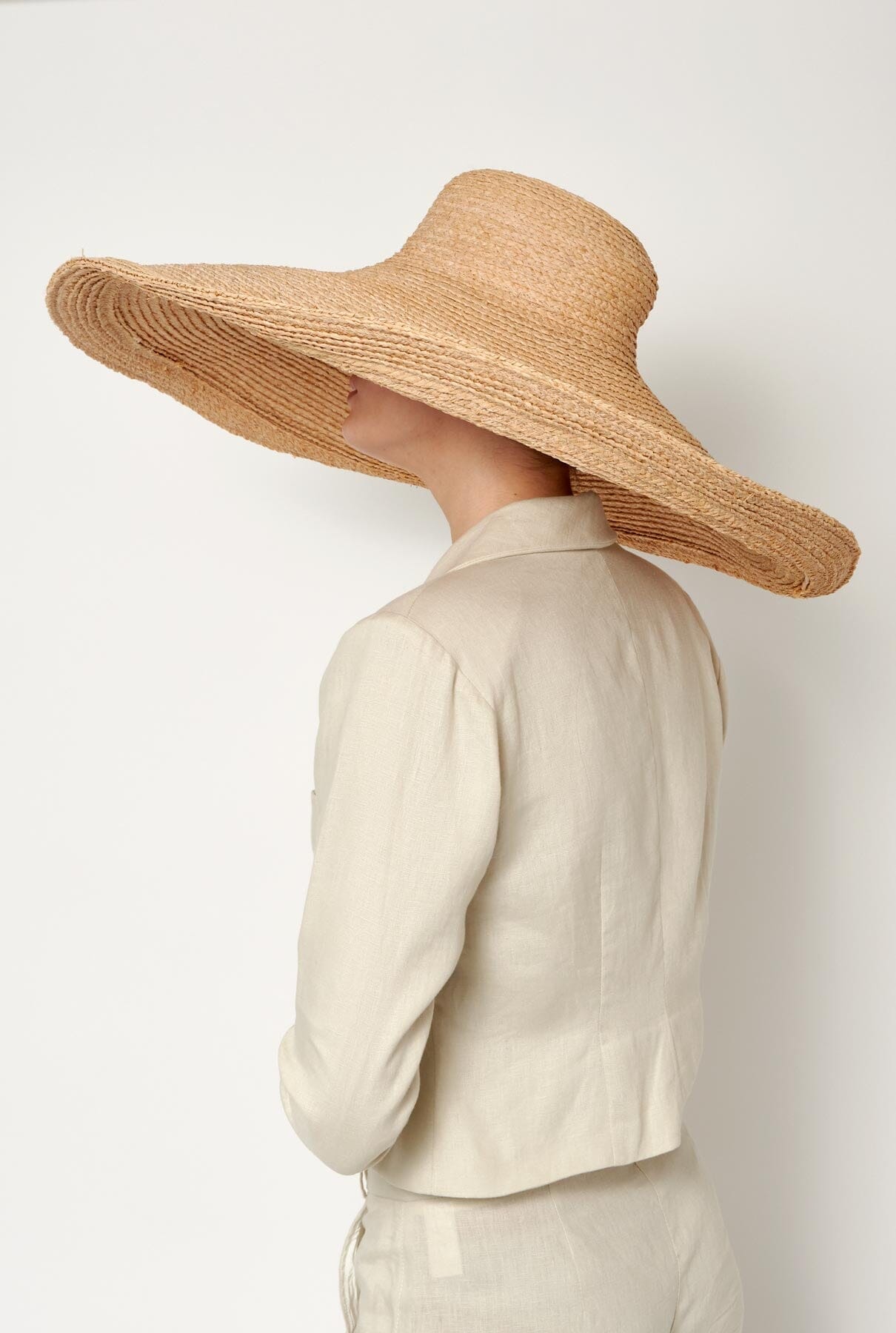 The mini-maxi pamela is made of raffia. It measures 70cm in diameter and the brim measures 25cm. Within the maxi pamela sizes the mini-maxi pamelas are the most wearable.