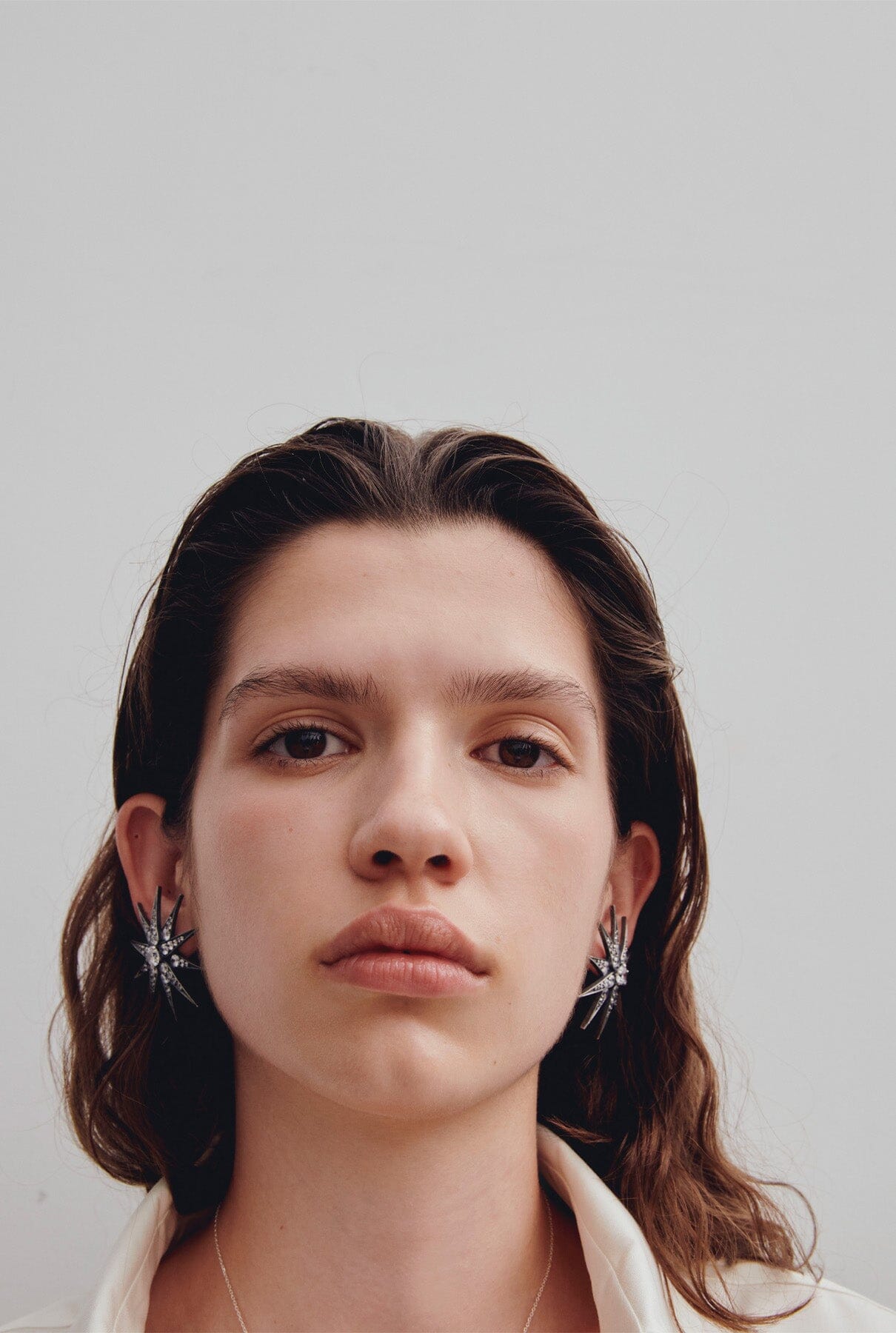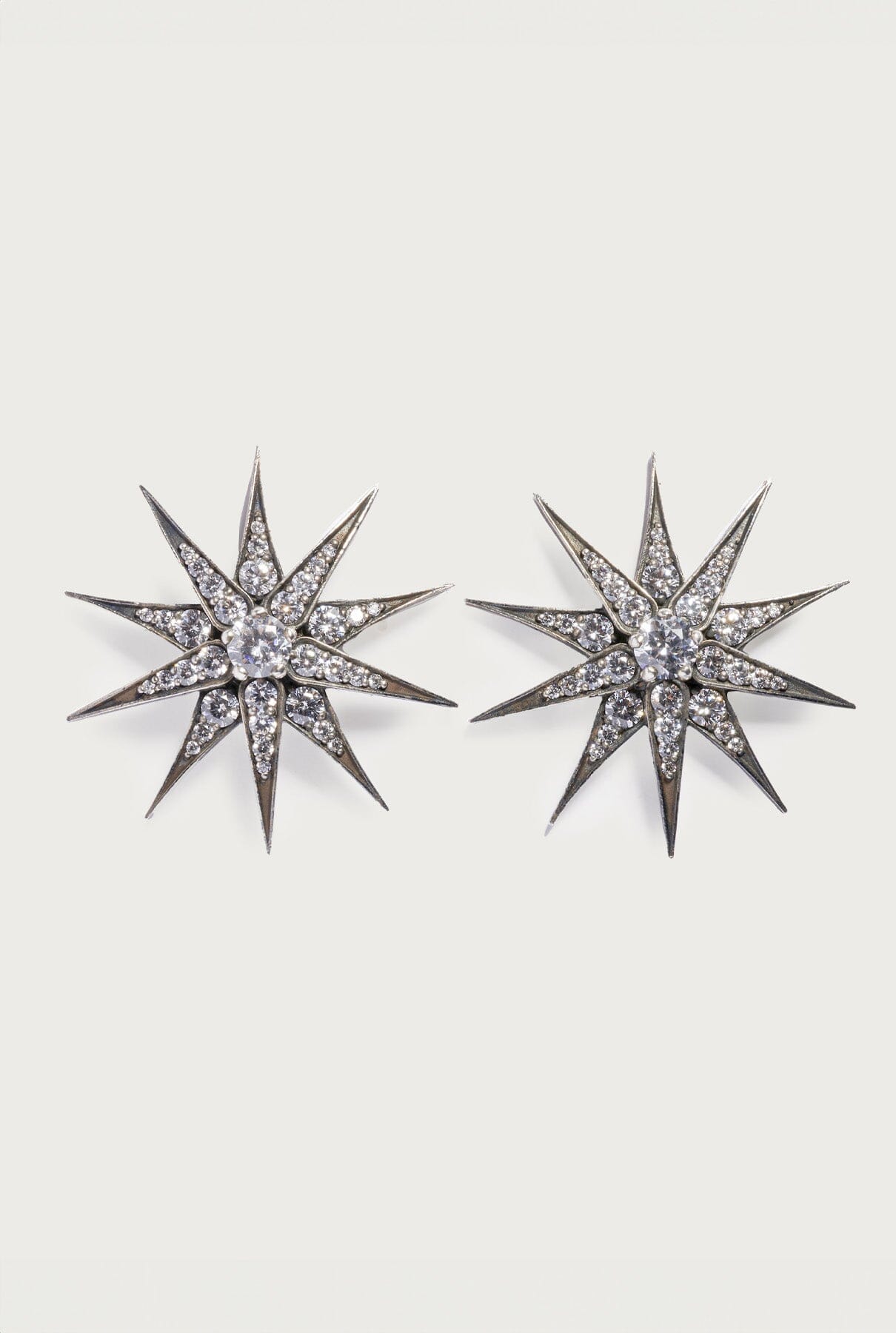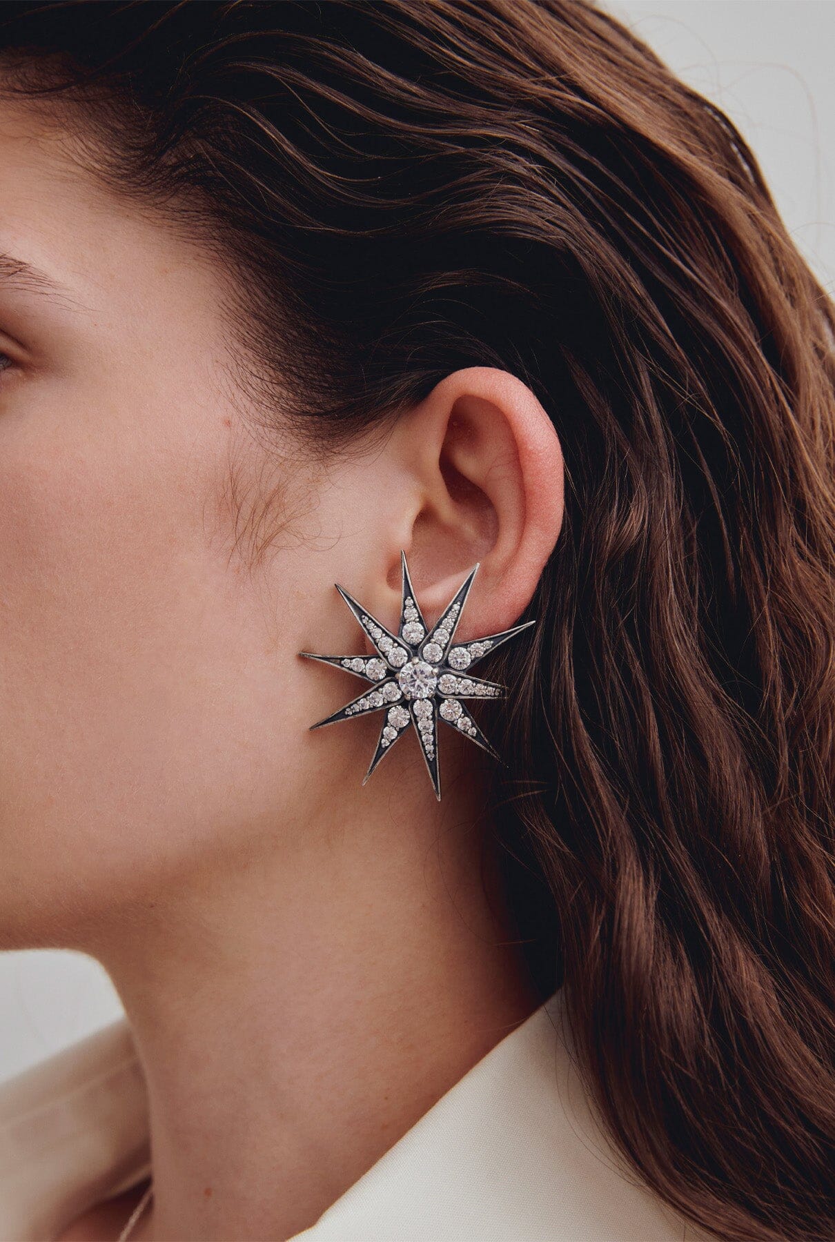 Earrings from the ‘Stars’ collection, small size. Silver and zircons. Two earrings. Ten-pointed star of 2,5cm, 3,5cm and 4,5cm, wide, full of zircons at the height of the ear lobe. Silver studs.