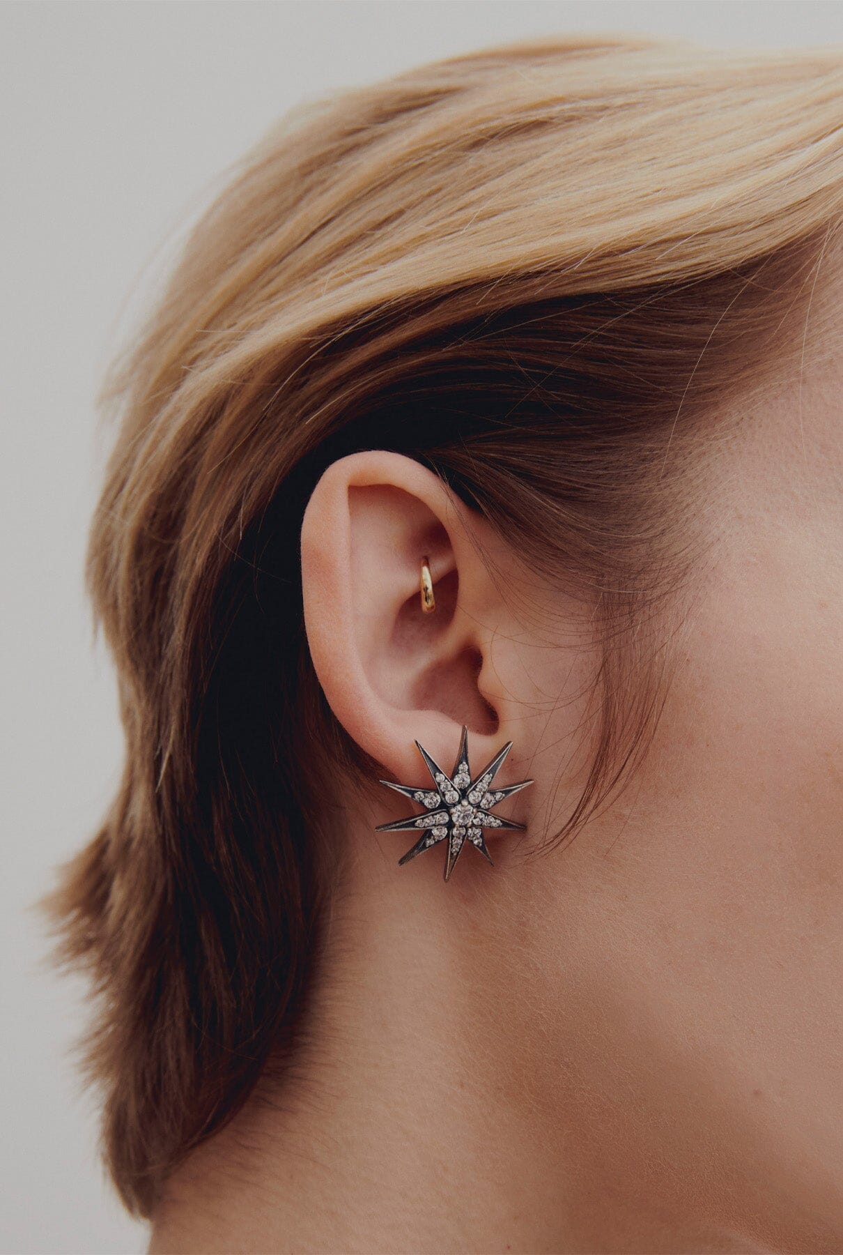 Earrings from the ‘Stars’ collection, small size. Silver and zircons. Two earrings. Ten-pointed star of 2,5cm, 3,5cm and 4,5cm, wide, full of zircons at the height of the ear lobe. Silver studs.