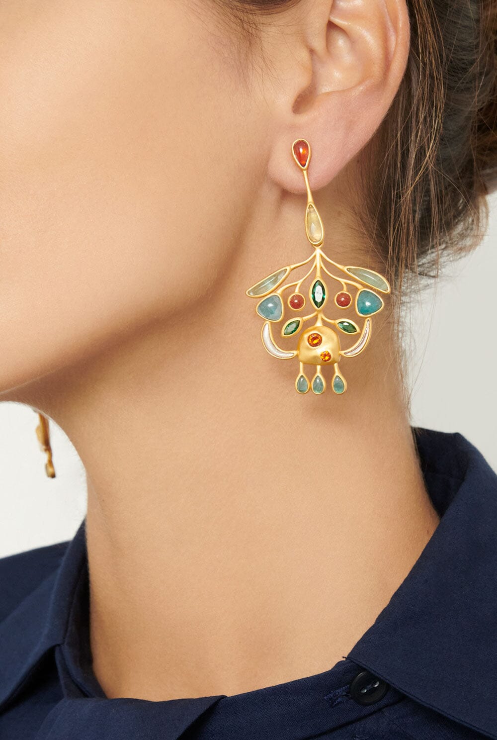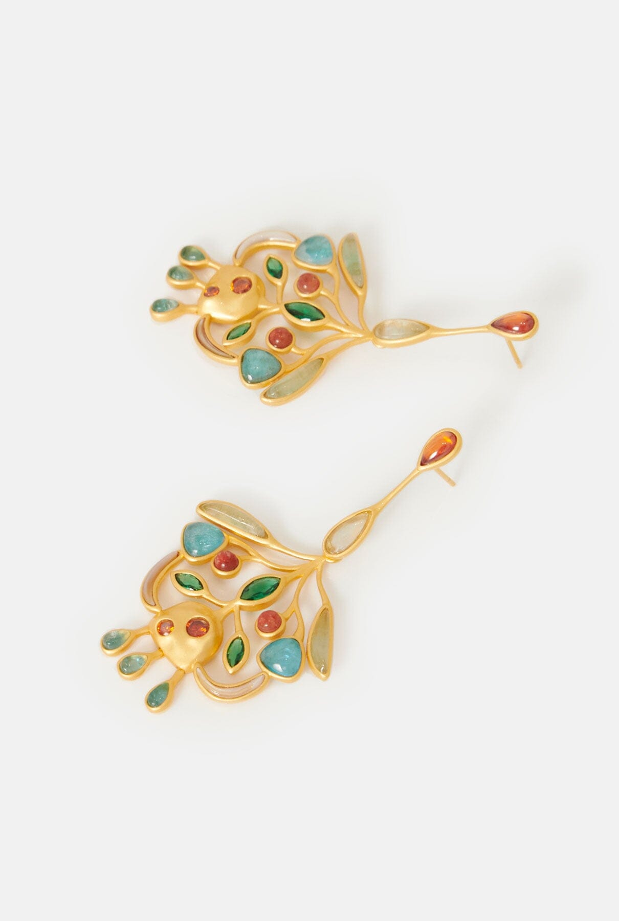 18k champagne gold plated 925 silver with emerald zircon and garnet and different natural stones, including red coral, green fluorite, blue apatite and pink mother-of-pearl. This jewellery is detachable, you can separate the earrings from their pendants.