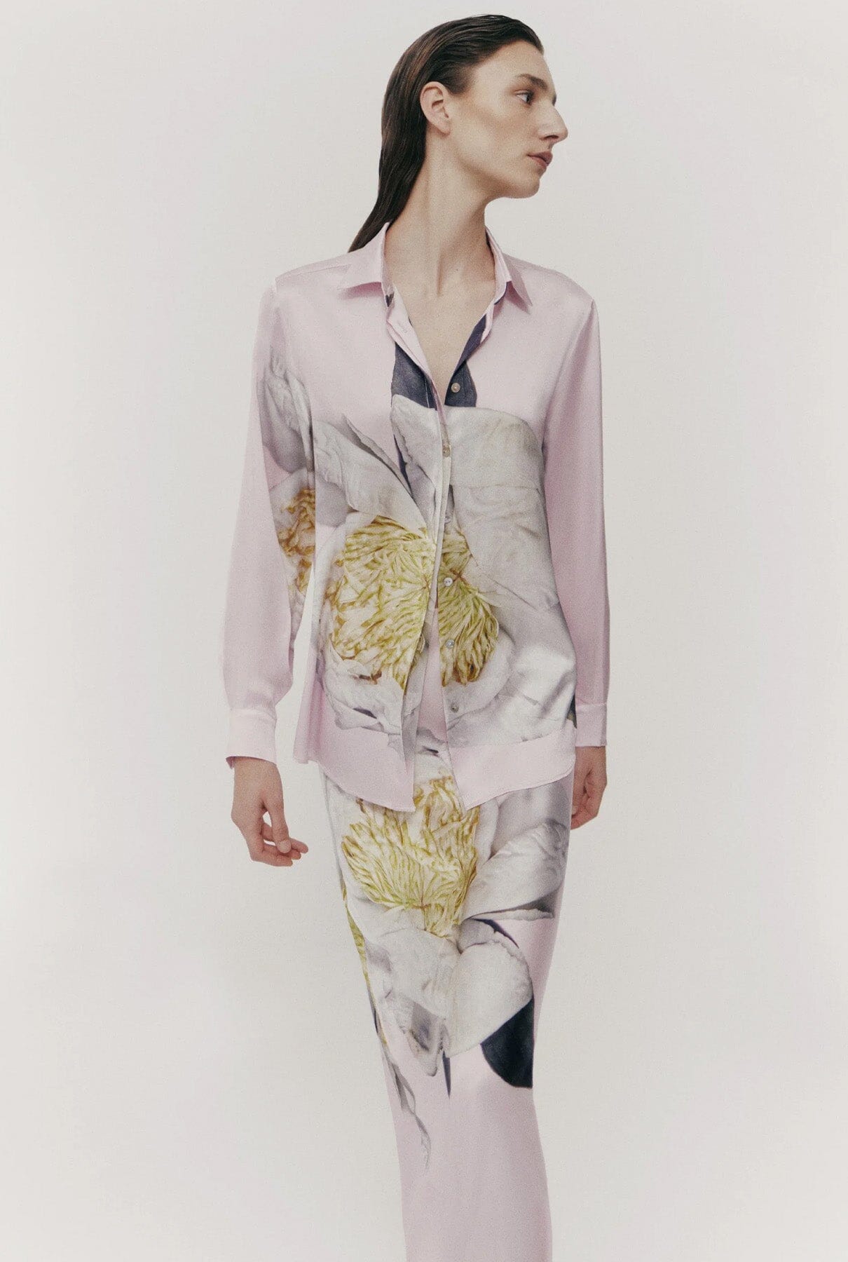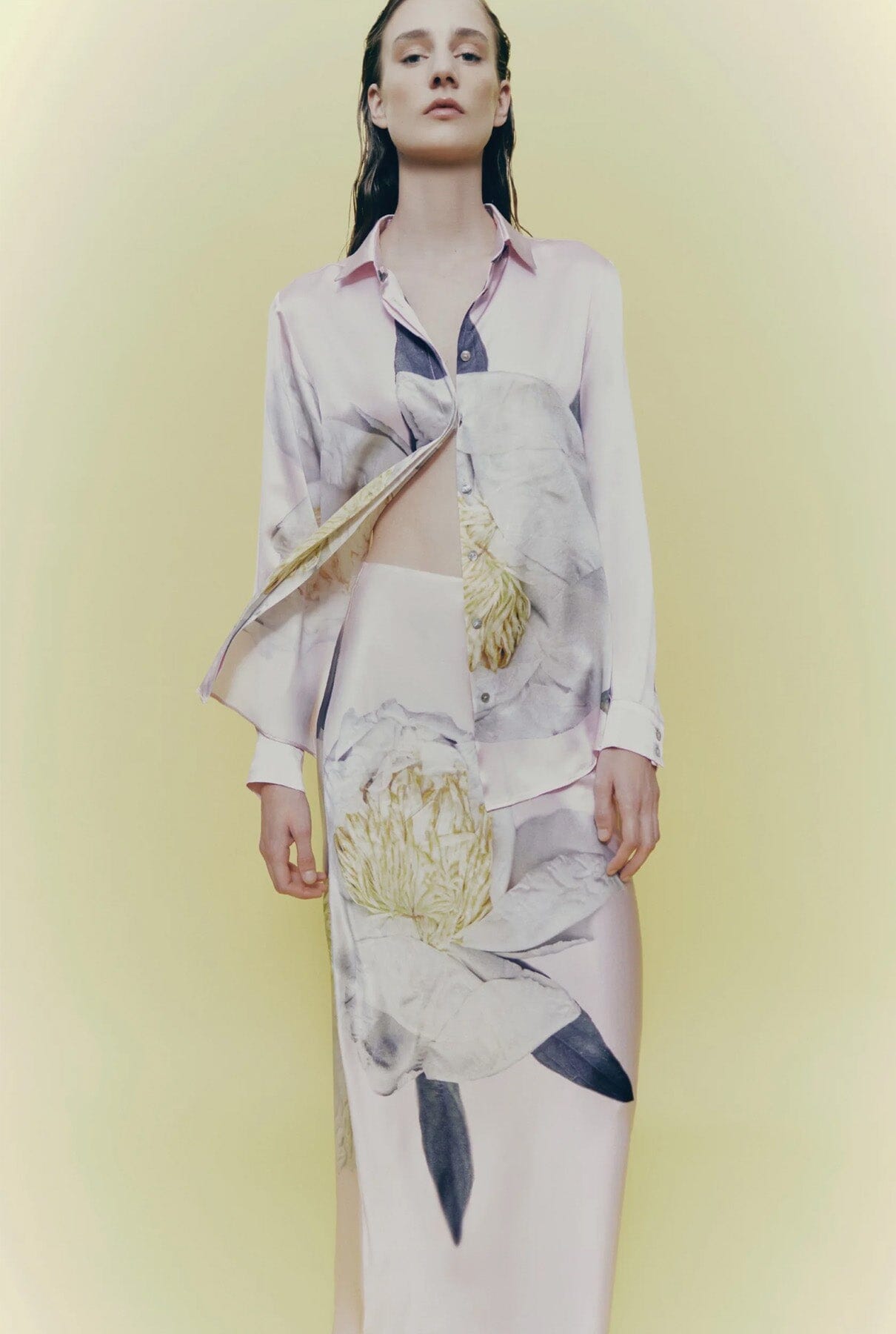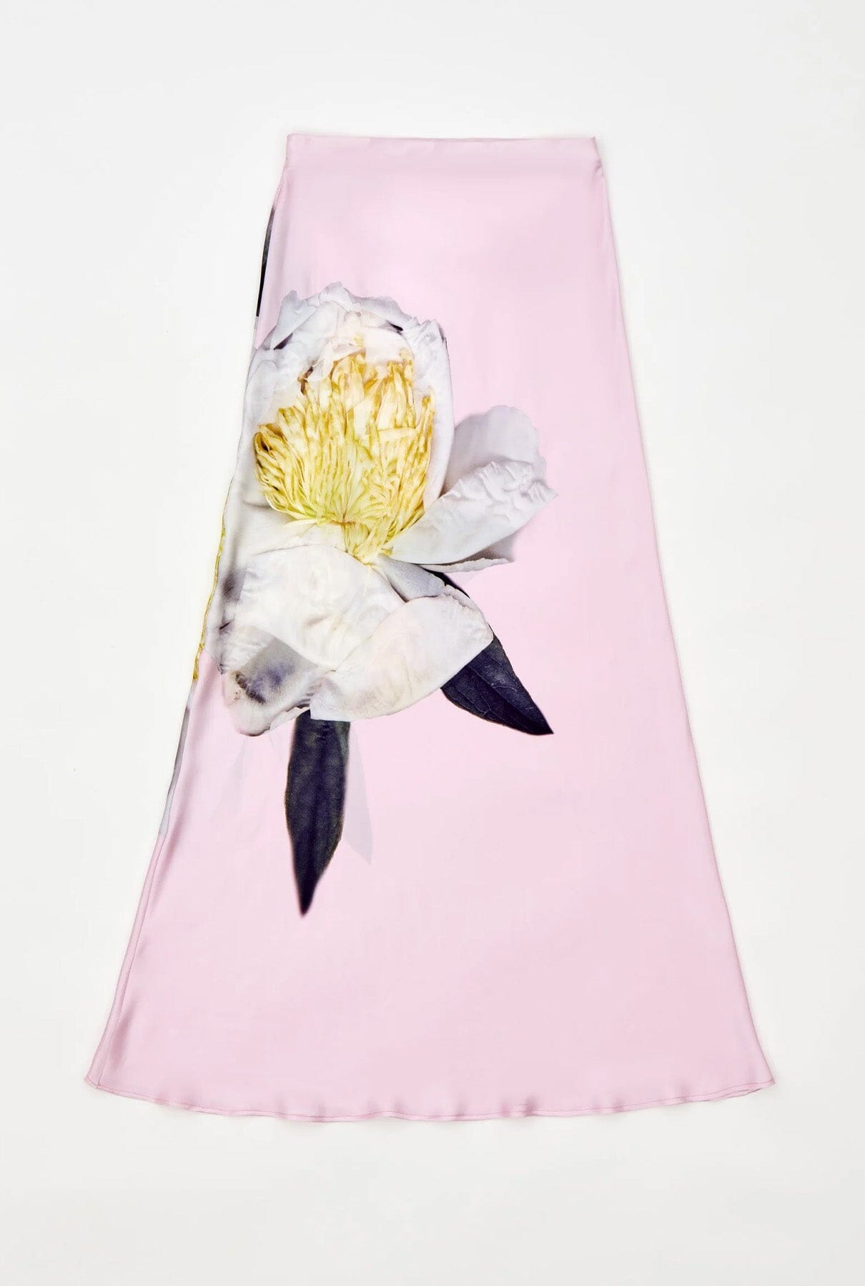 BIAS CUT LINGERIE SKIRT, LONG, WITH ELASTIC INNER WAISTBAND, POSITIONAL PEONY FLOWER PRINT.