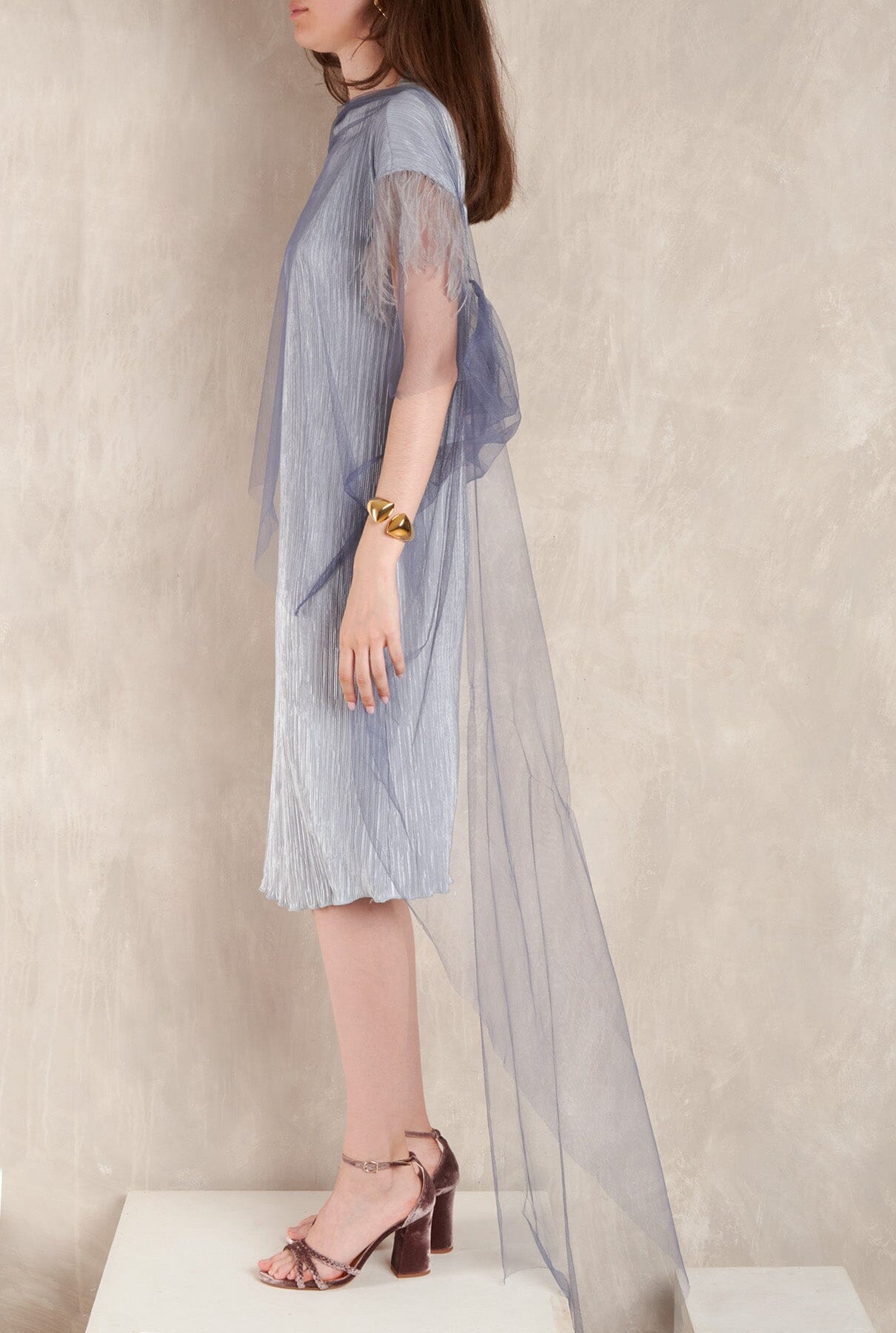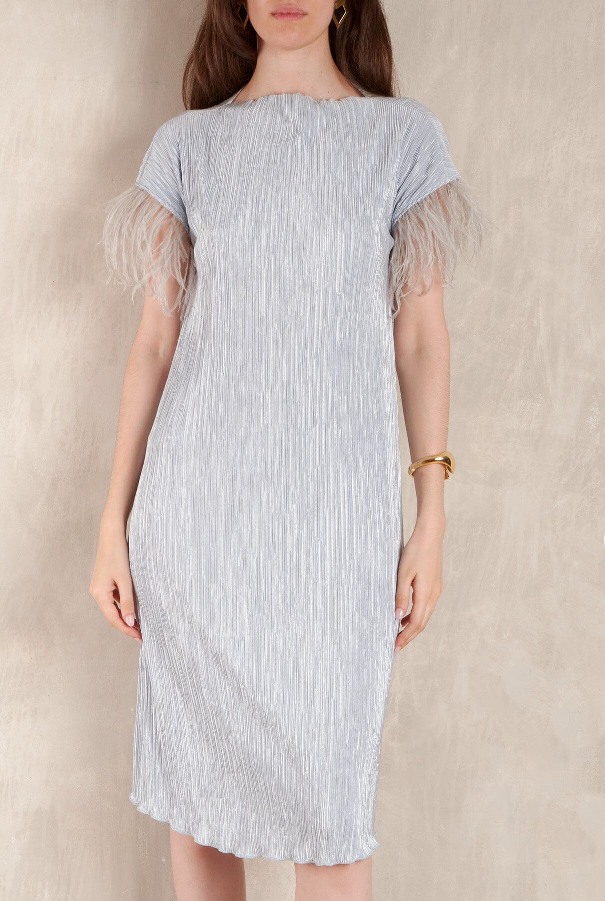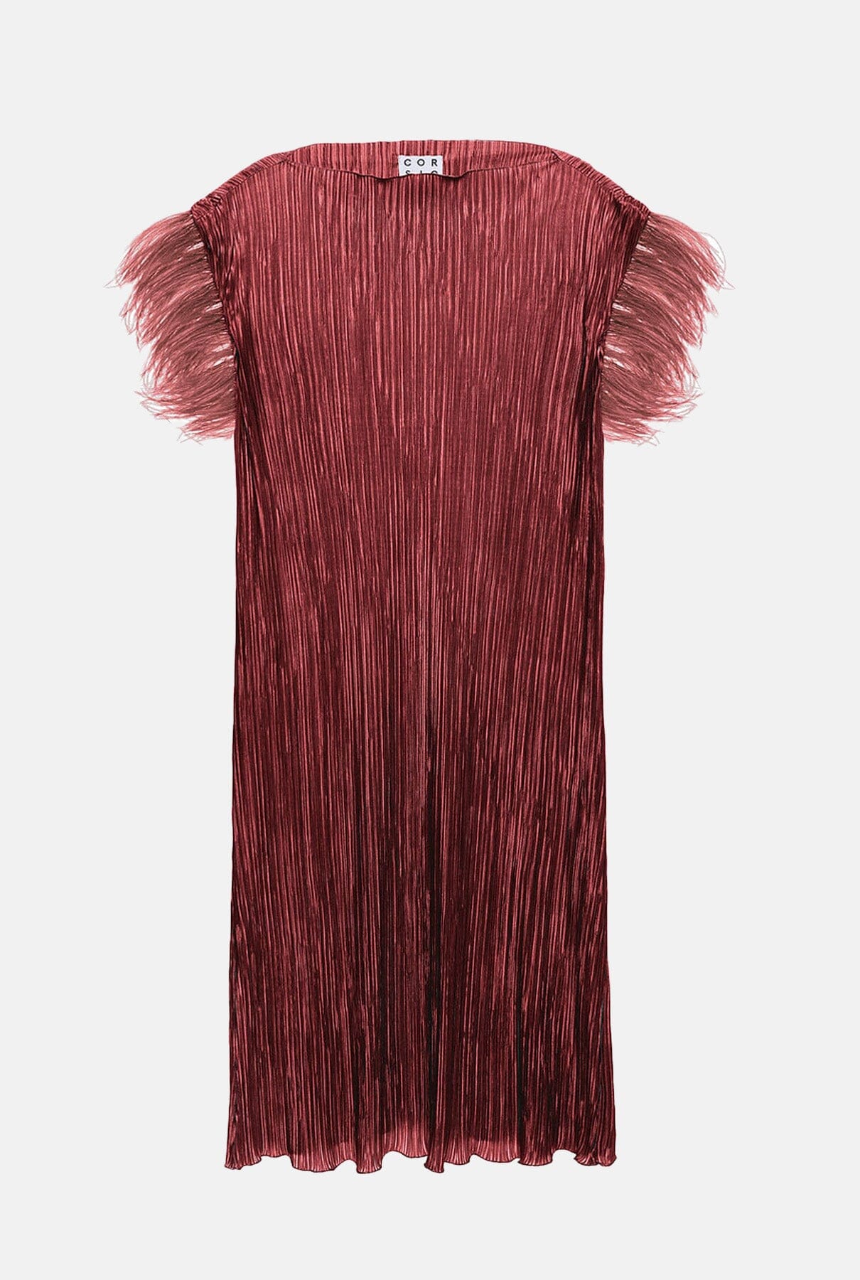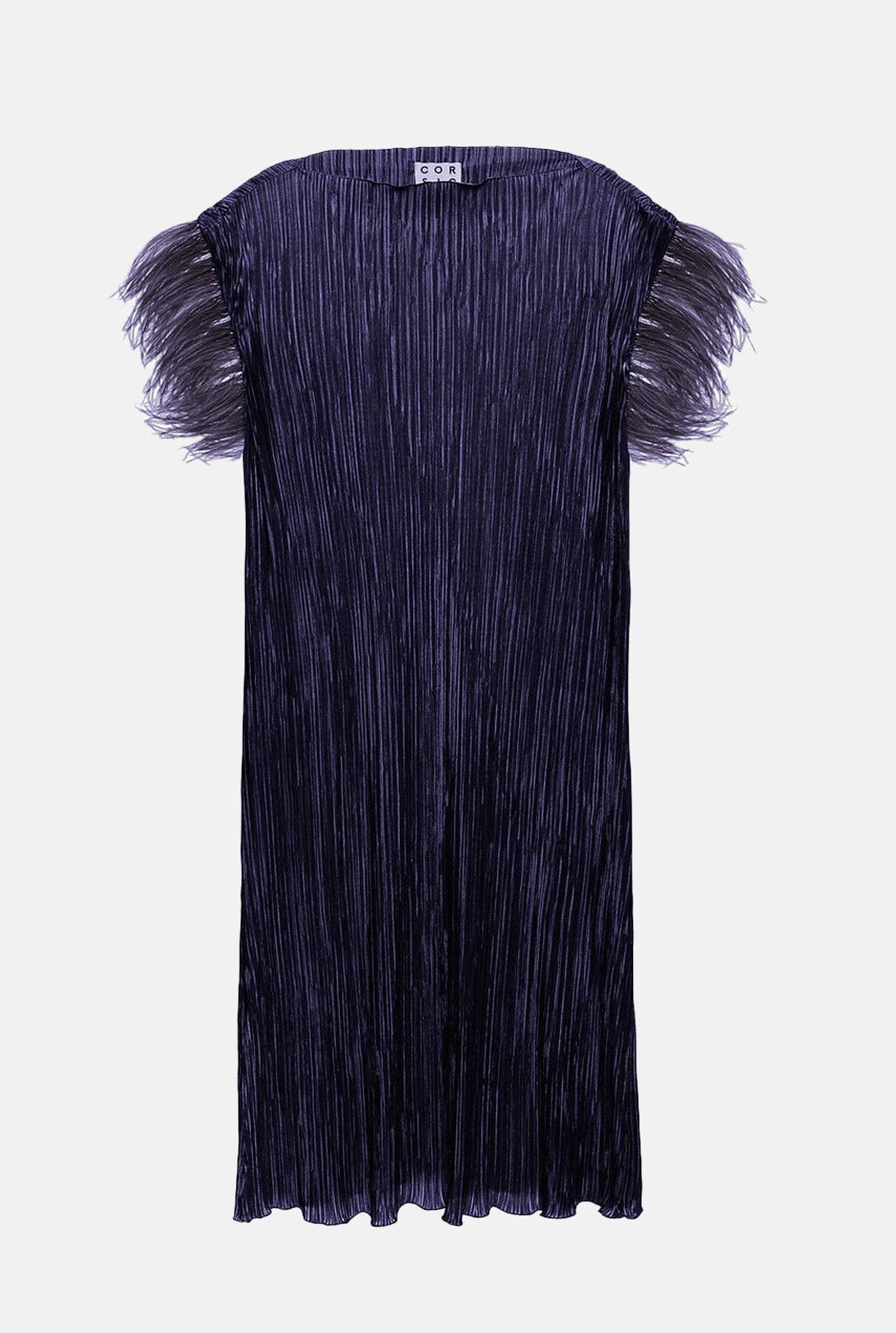 Pleated straight dress with detail made of real feathers. Boat shape collar. This style belongs to PREVIO x Corsicana. Our customizable collection of sartorial pieces. ¡Create yours!
