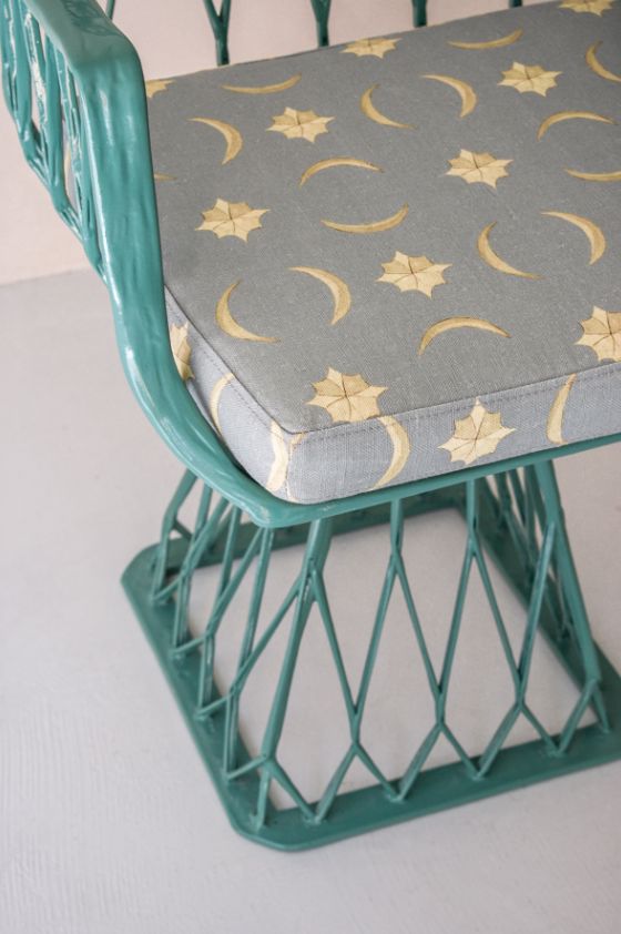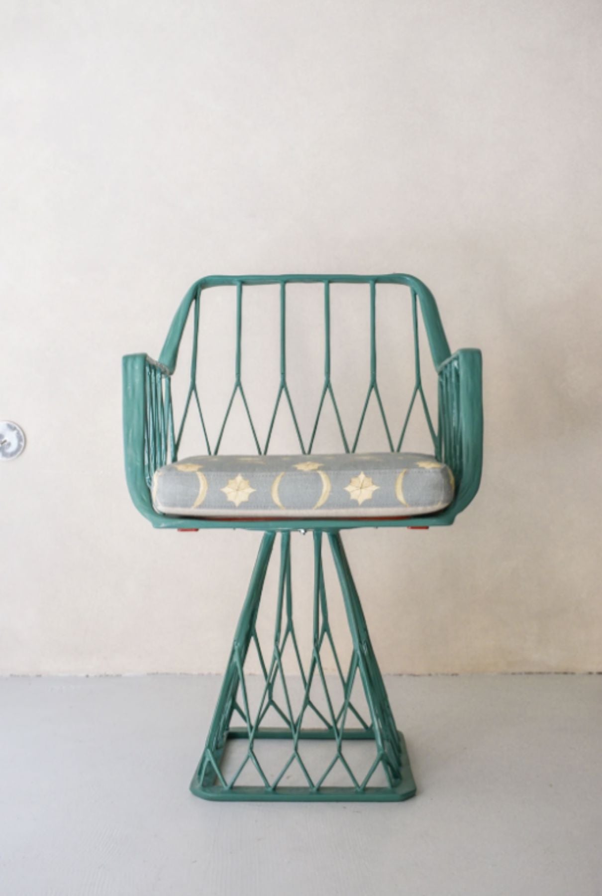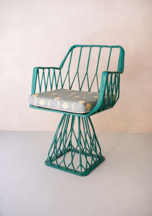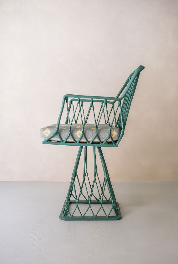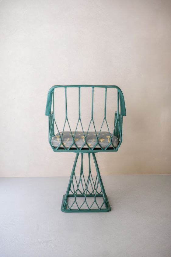 Chair with armrests and structure in turquoise fibreglass with cushion.