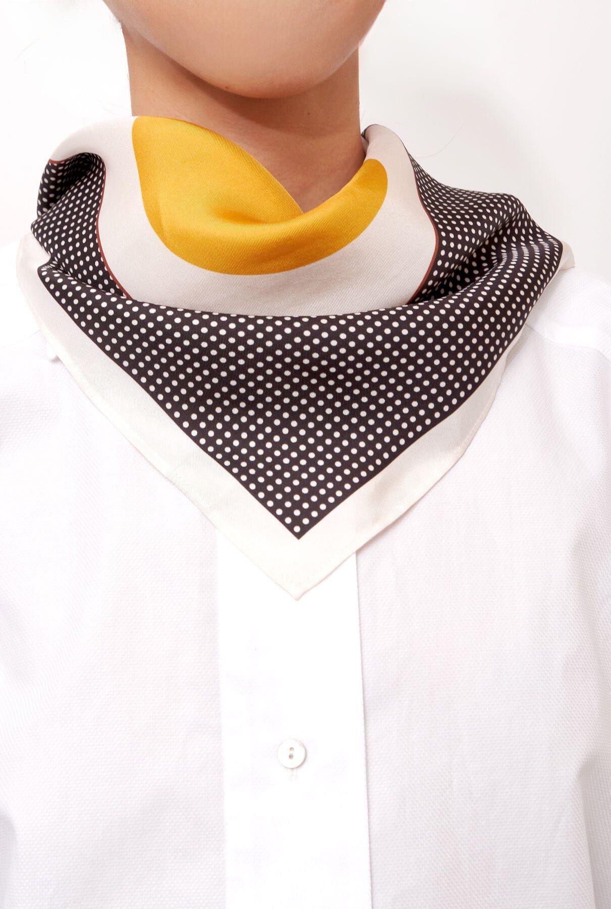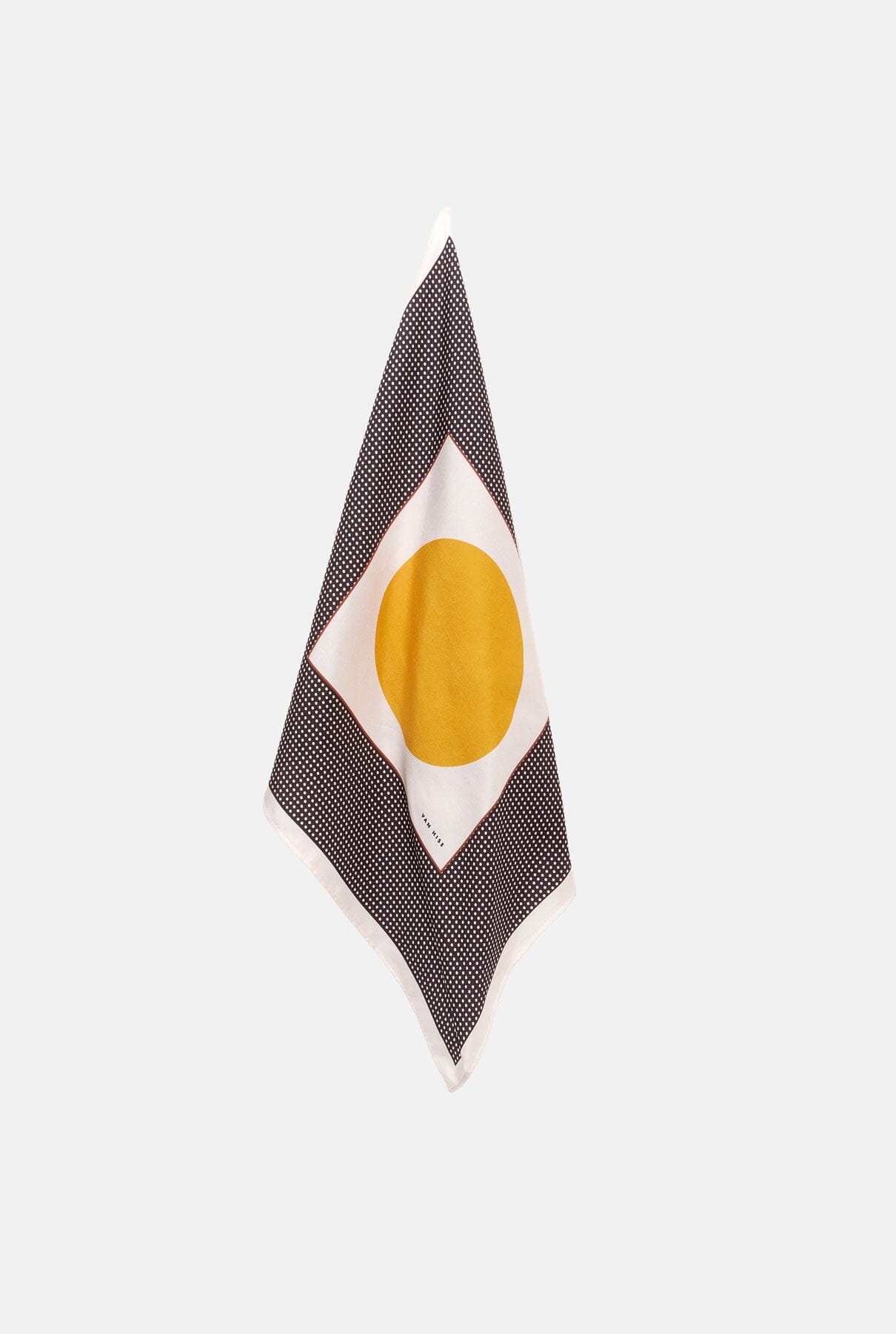 Limited Edition designed by Carrie Van Hise. Square silk scarf featuring polka dot design. The Sol bandana can be worn around the neck, as a head scarf, or hung from your favorite bag. Made in Spain. Hand rolled edges.