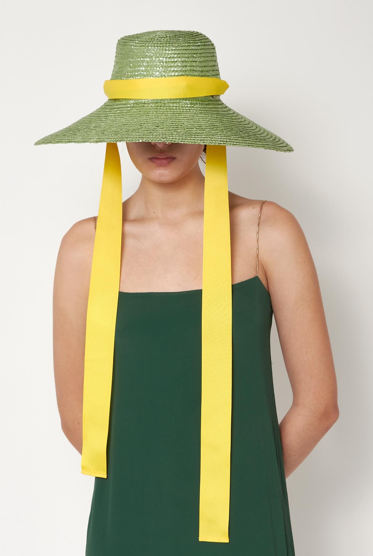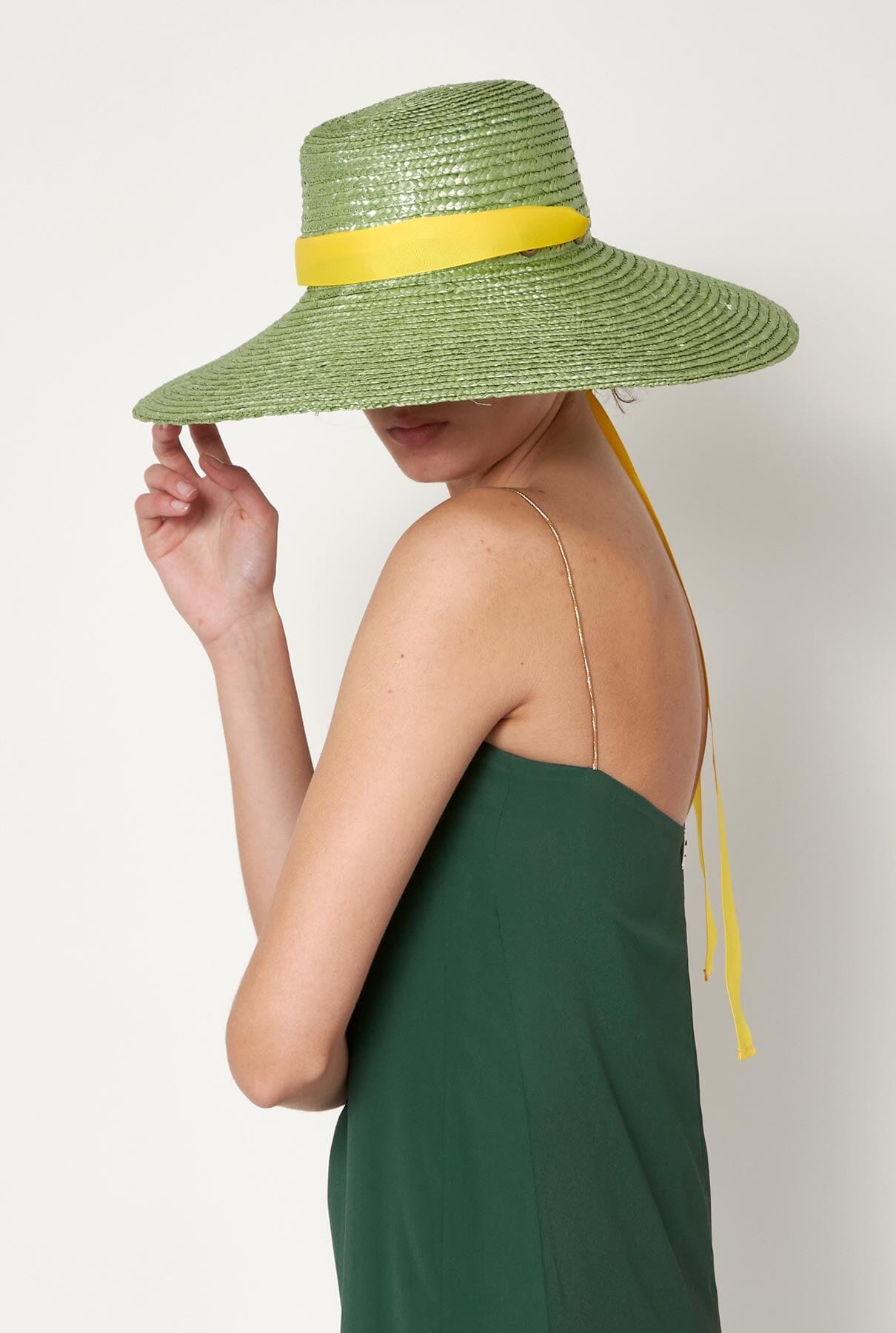 The cuchi flow hat is a very romantic hat for everyday use as well as for any event. It is made of pistachio coloured straw. The ribbon is multifunctional as you can wear it tied under the neck, tie it around the crown or change the ribbon for another colour.