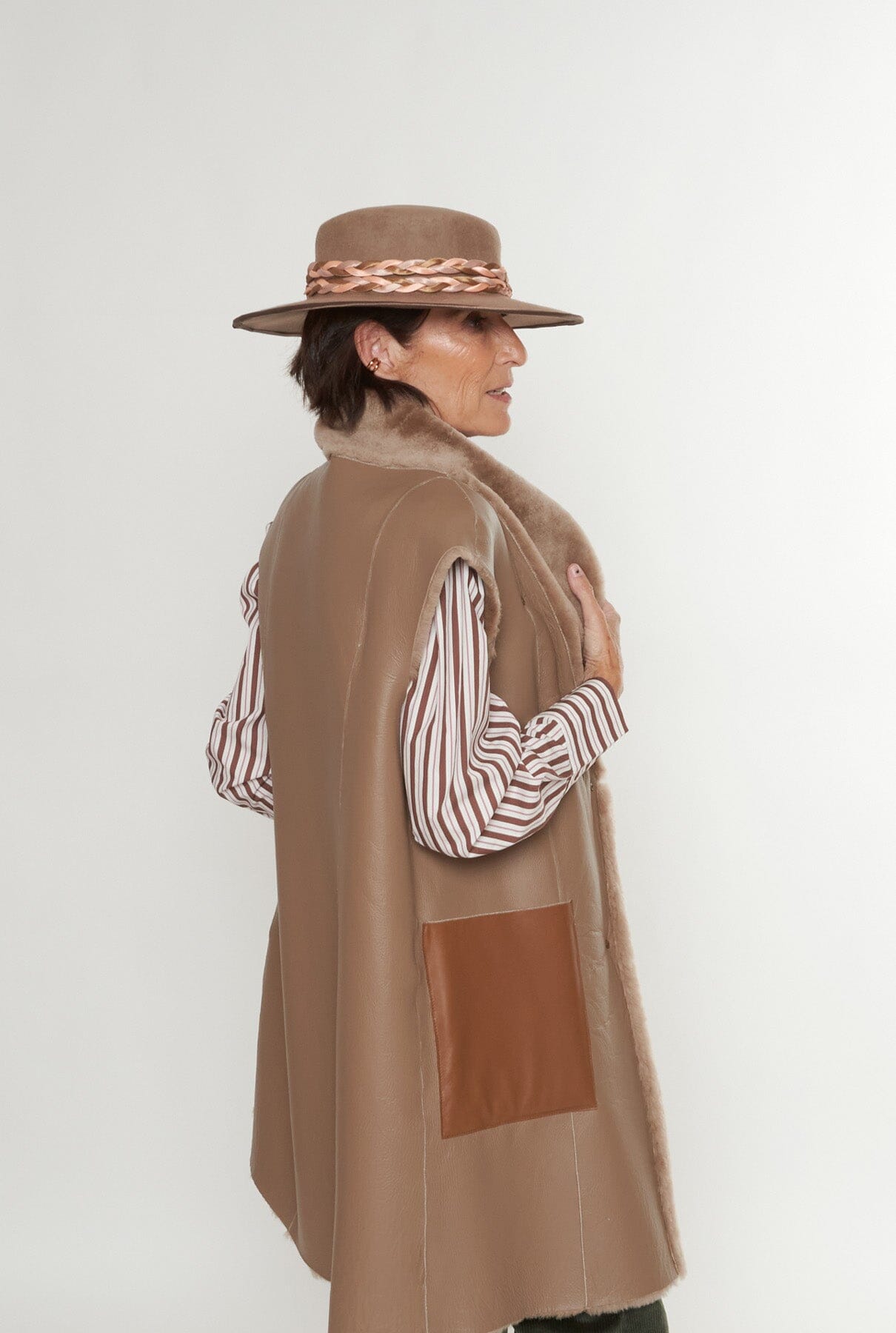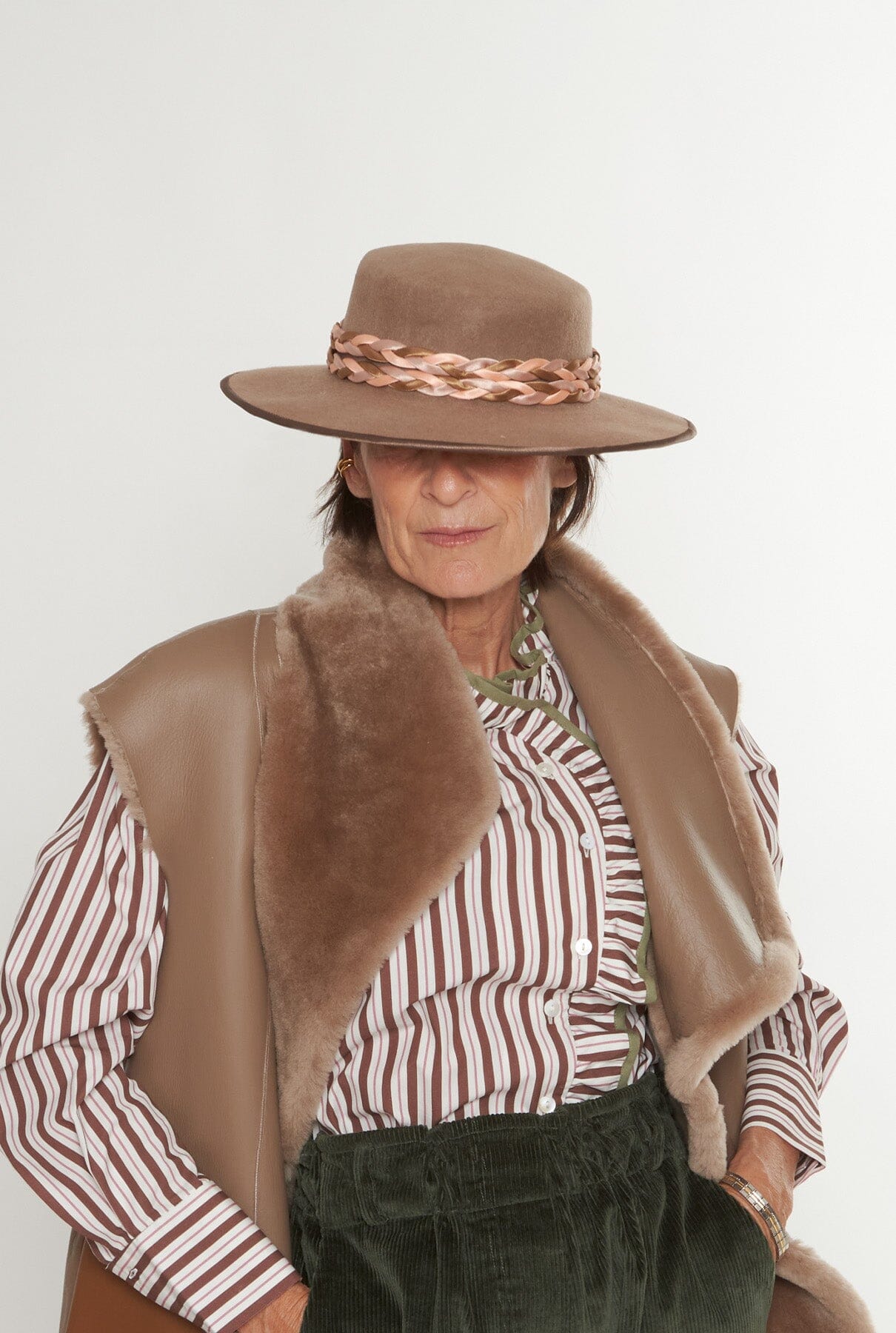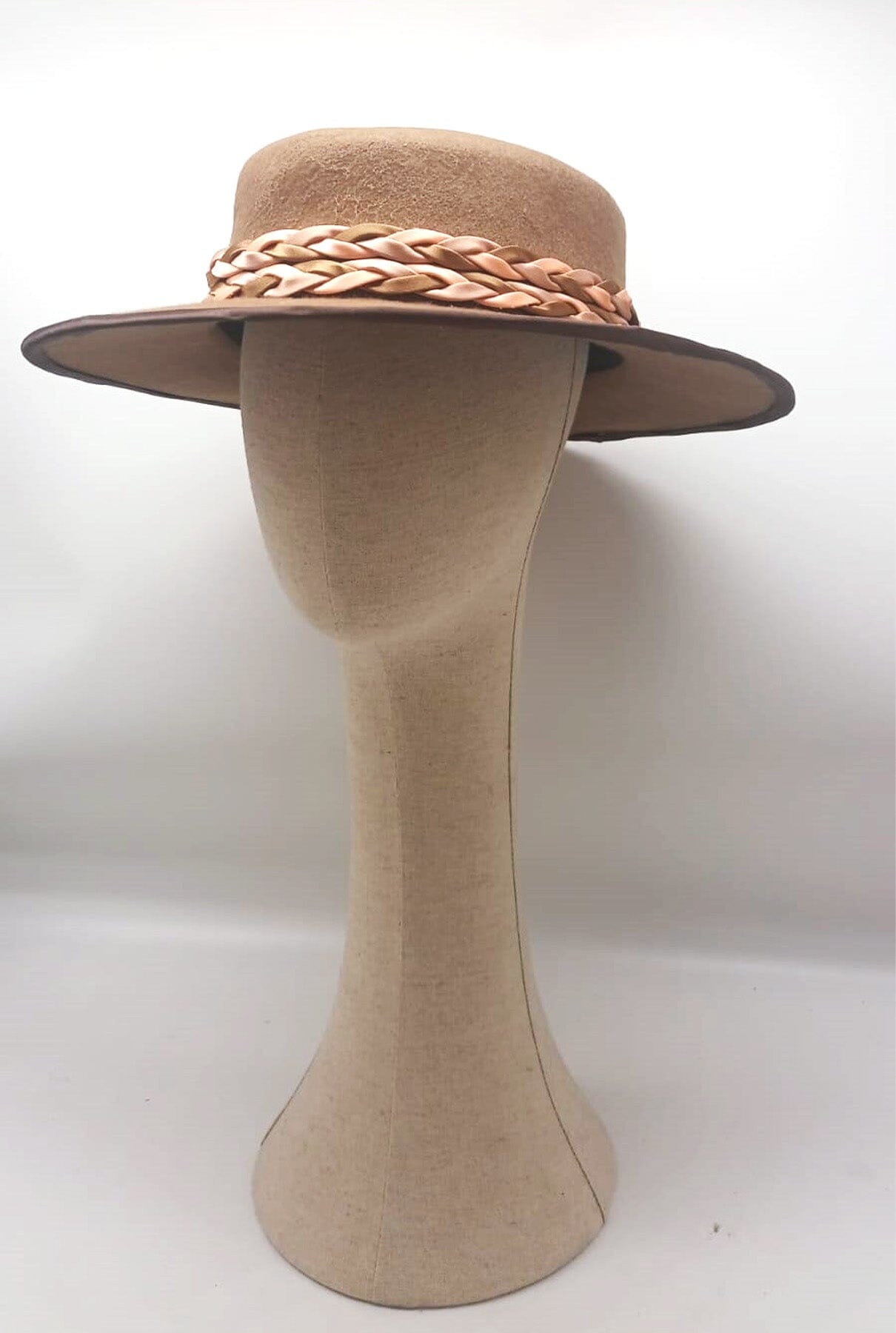 Hand-wired and hand-stitched taupe felt hat, trimmed with satin bias binding and braided details in shades of pink. Finished with high quality millinery.