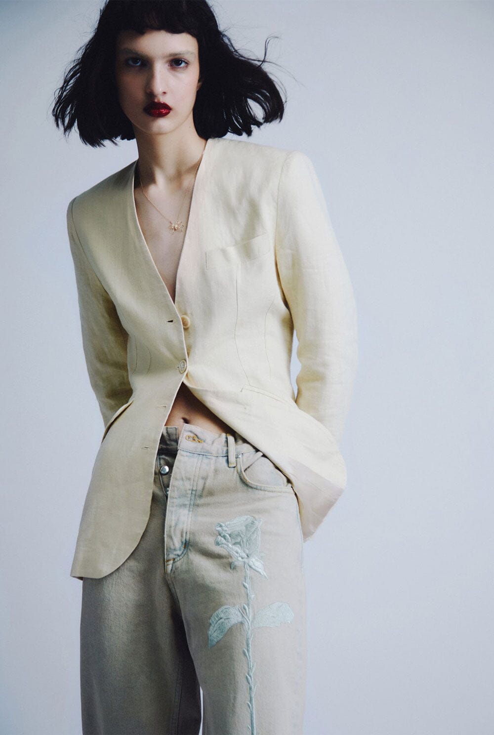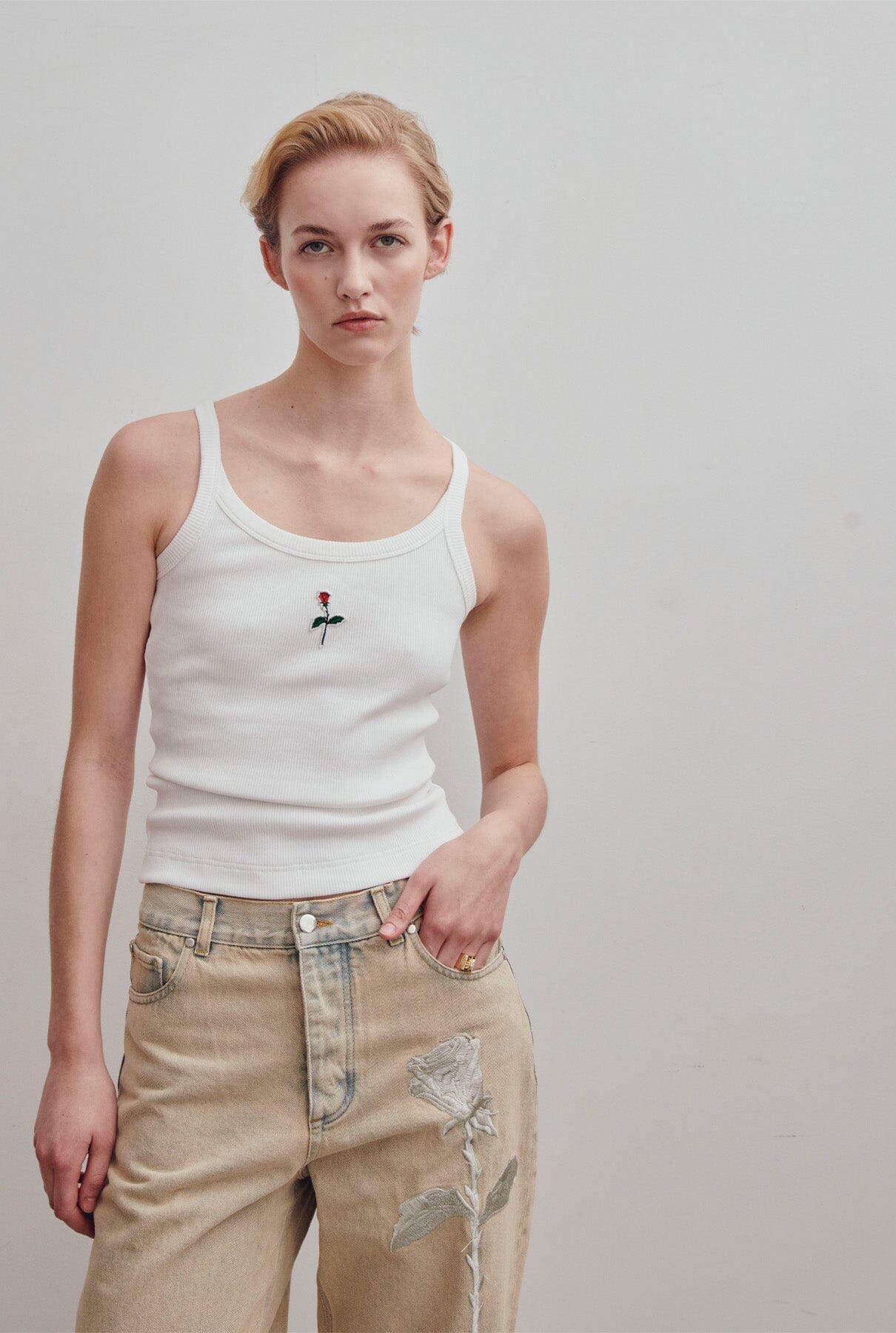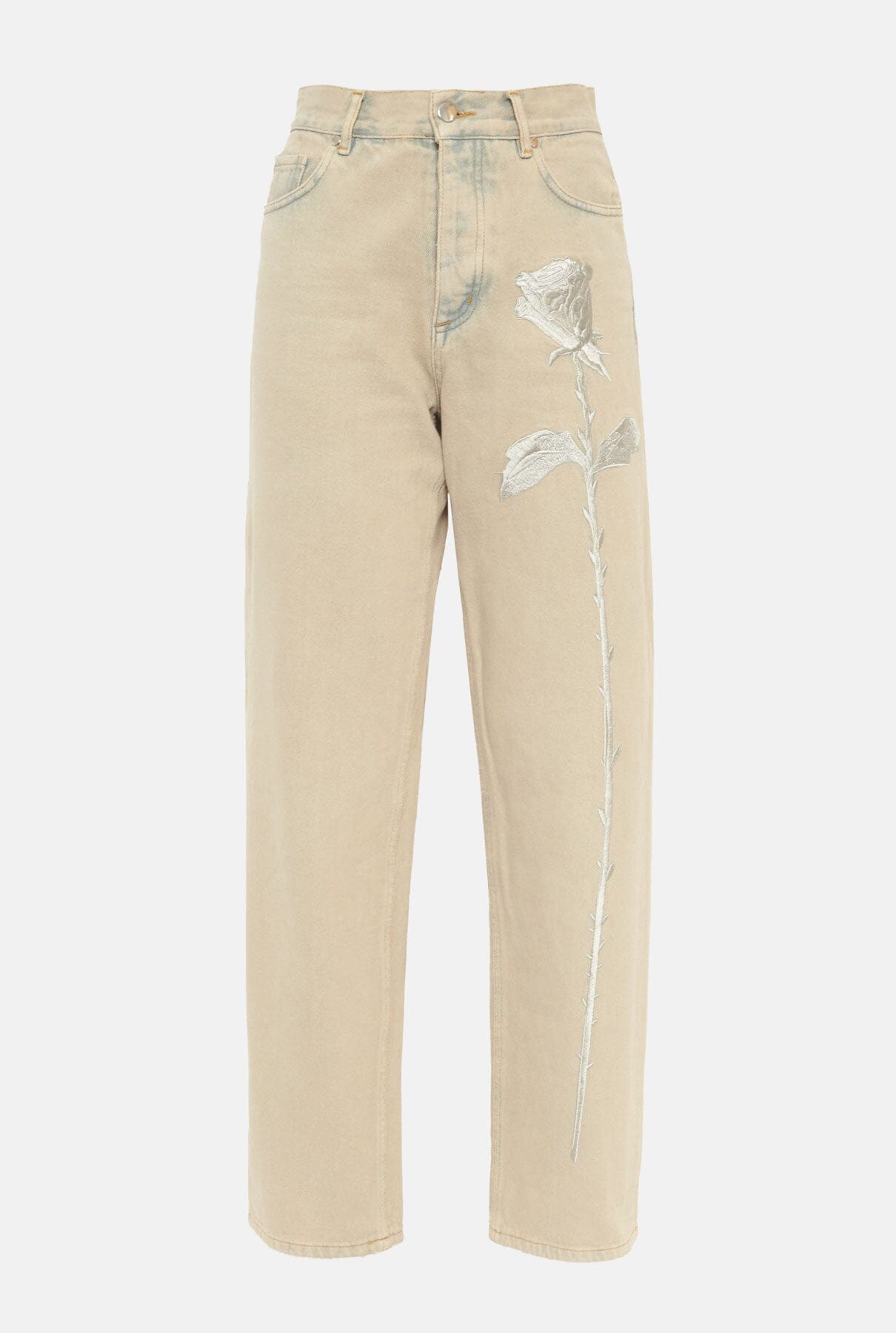 Our iconic rose embroidered on the front leg. Fly zip with metallic buttons.