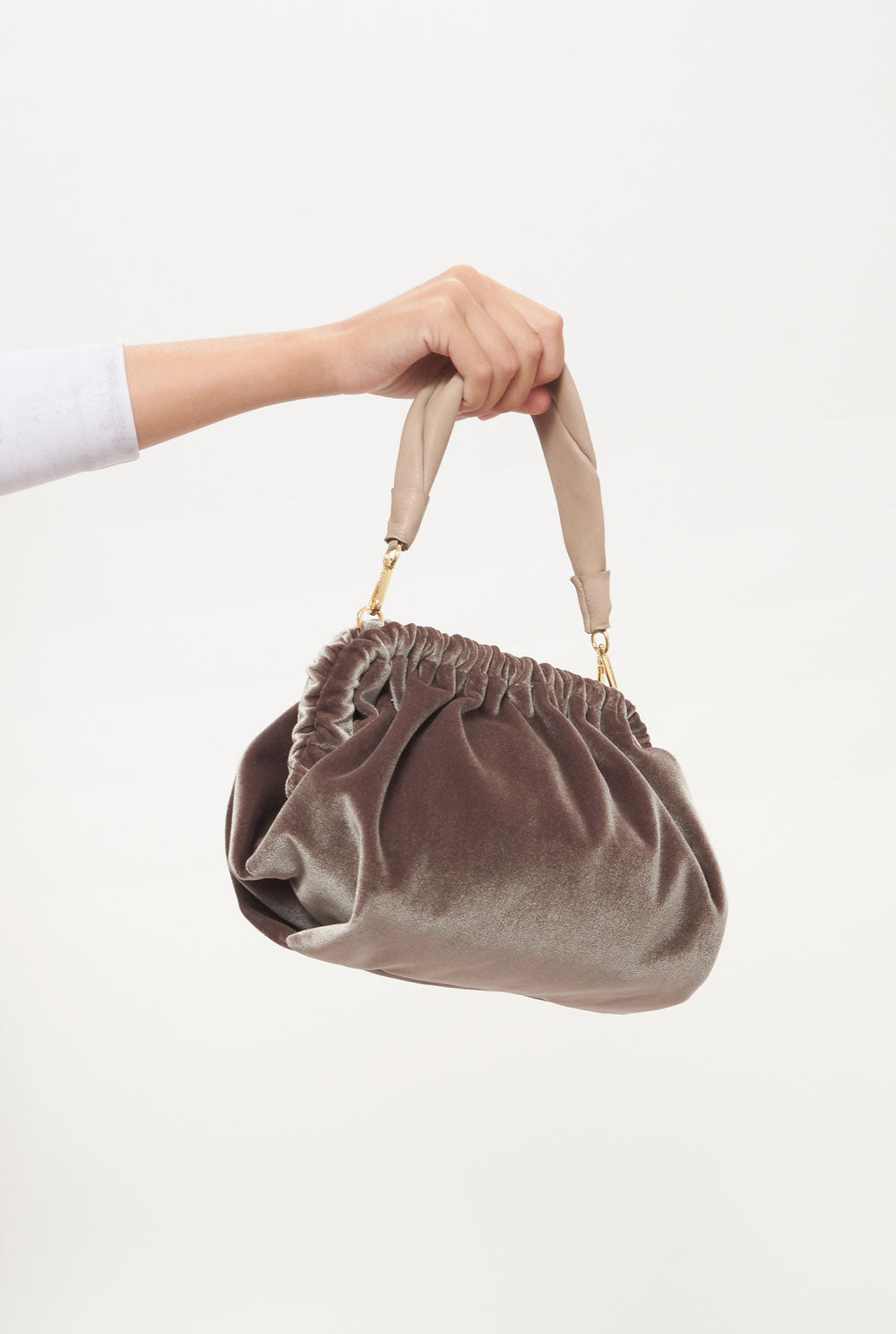 Handcrafted soft bag made with Velvet. Inside pocket and snap closure. Detachable golden chain with 2 hooks. Designed by The Bag Lab.