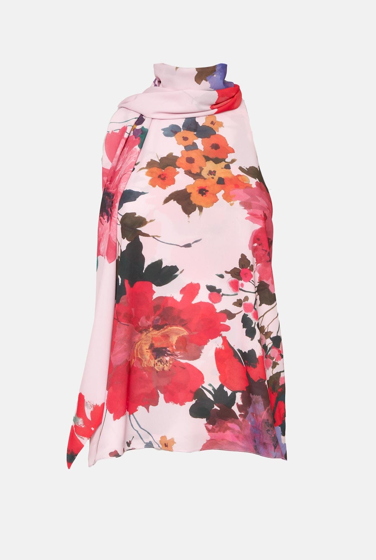 Asymmetrical halter top, longer at the back than at the front with lacing, made of watercolour floral fabric.