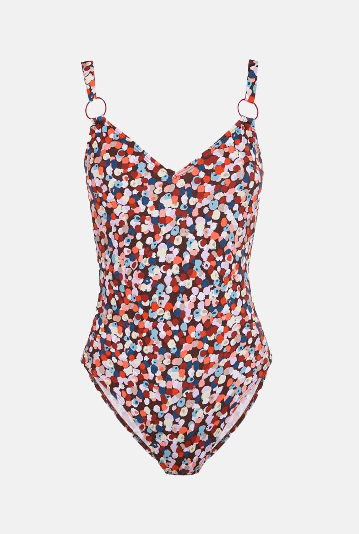 The Salitre Print Swimsuit is a celebration of nature and summer with its playful and fun multicolored print. Its V-neckline and metallic underwire straps enhance the shoulders and add a modern detail that complements its clean, flattering cut. Lined inside and with removable cups, it offers the perfect combination of comfort and support, adapting to different types of breasts. Its slim silhouette and soft fabric make it a must-have for your beach days.