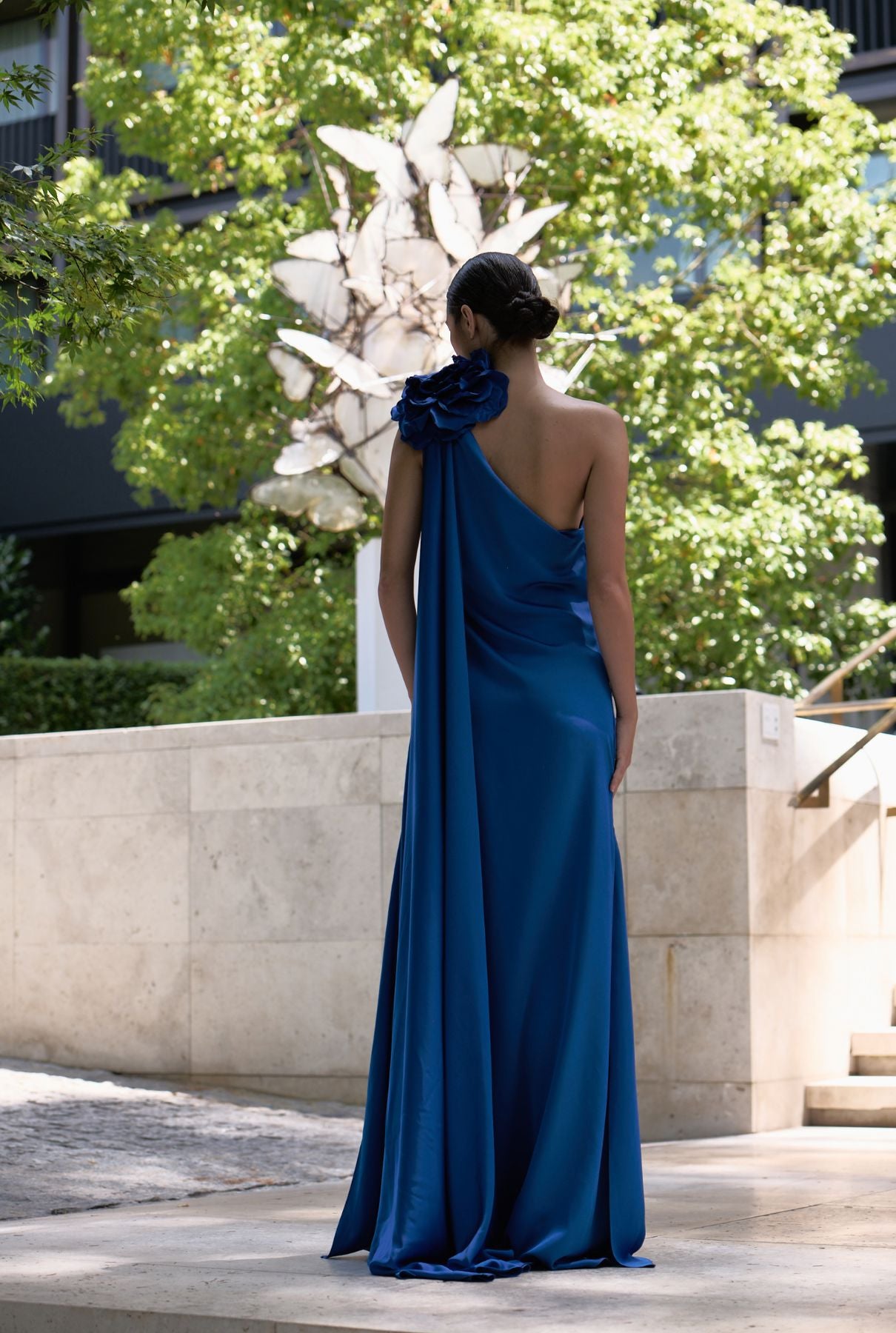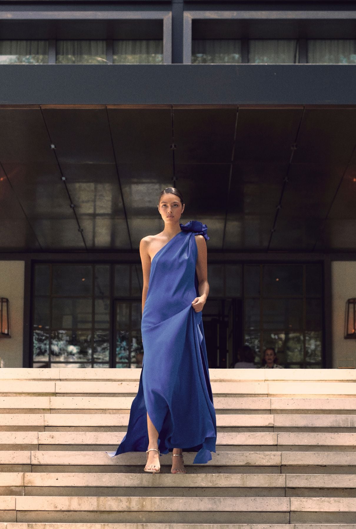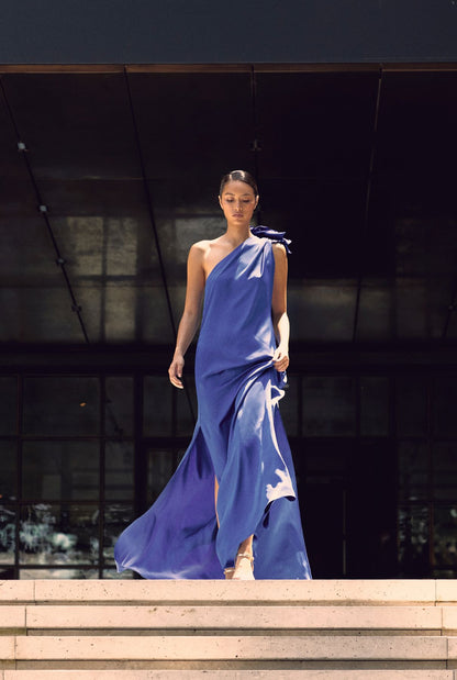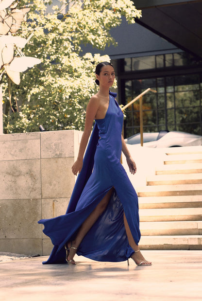 Floor-length crepe dress with side slit, asymmetric neckline, slightly gathered, with cape and handmade flower detail on the shoulder.