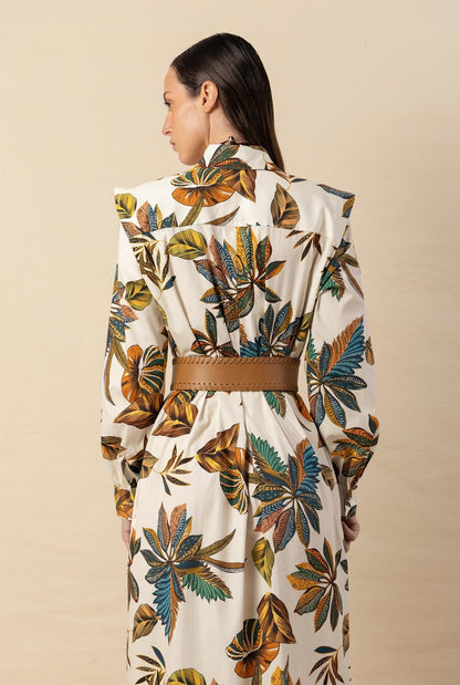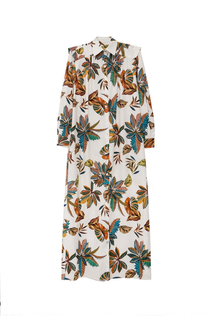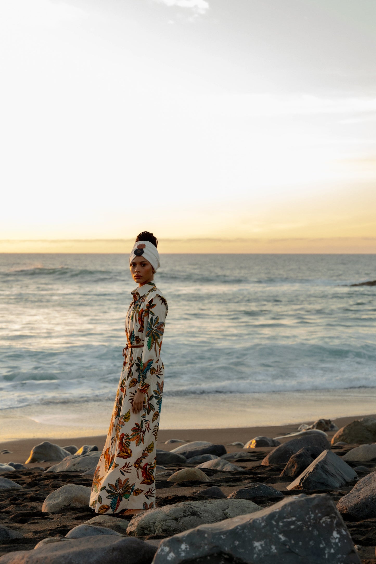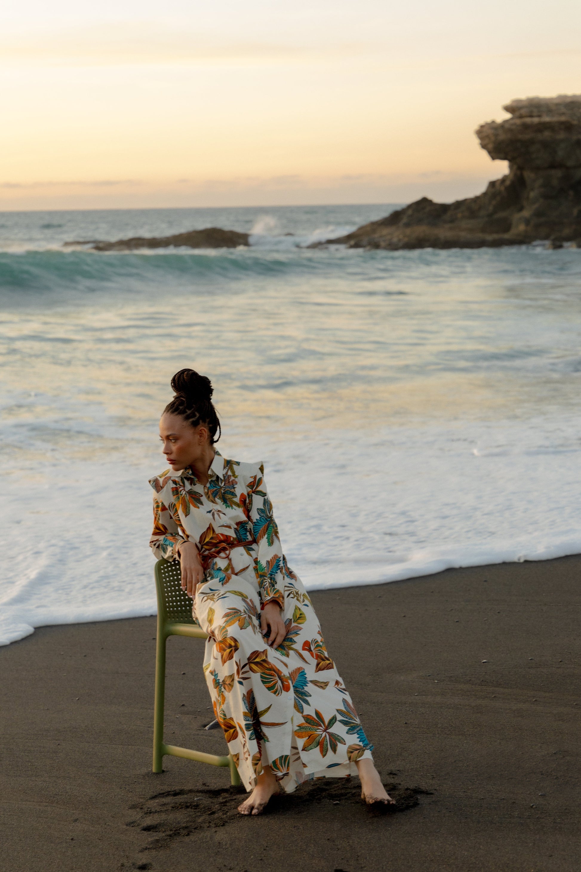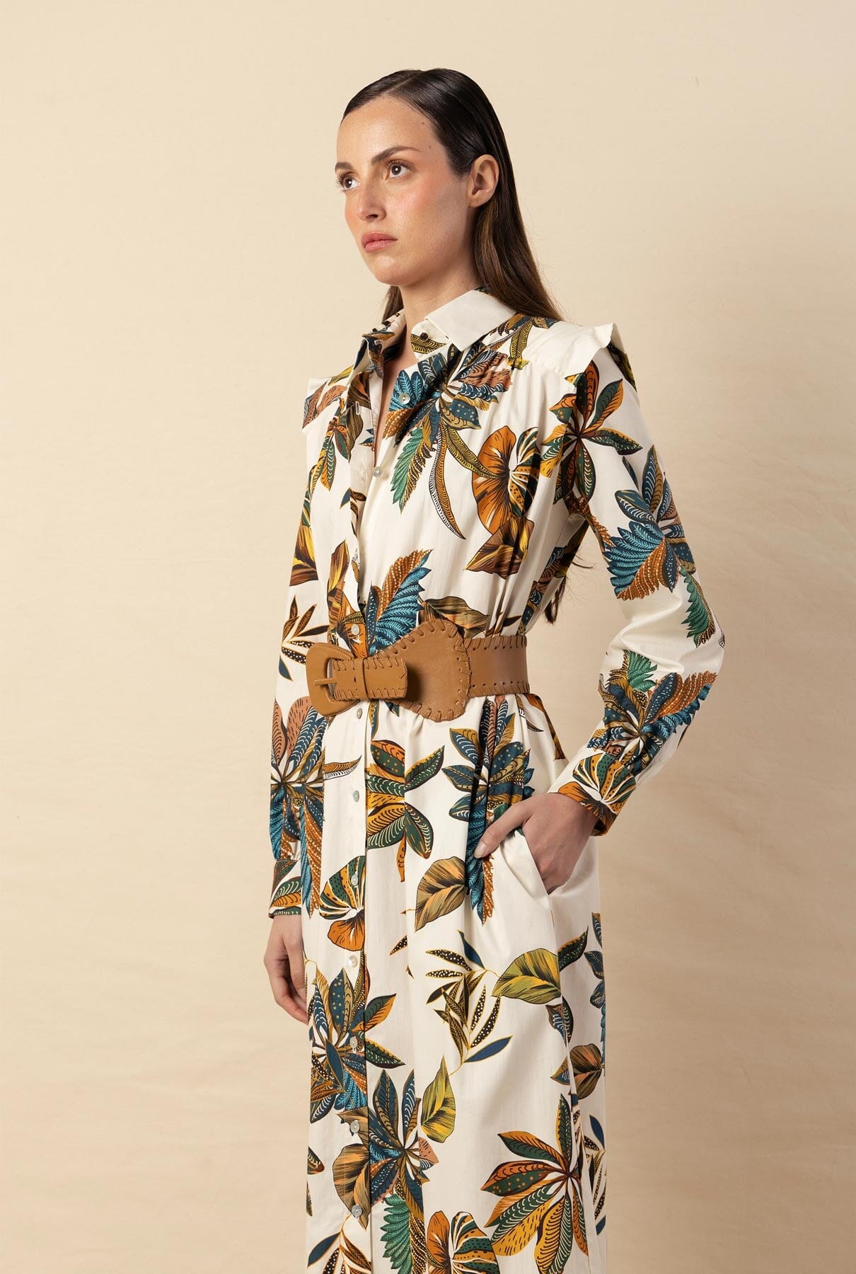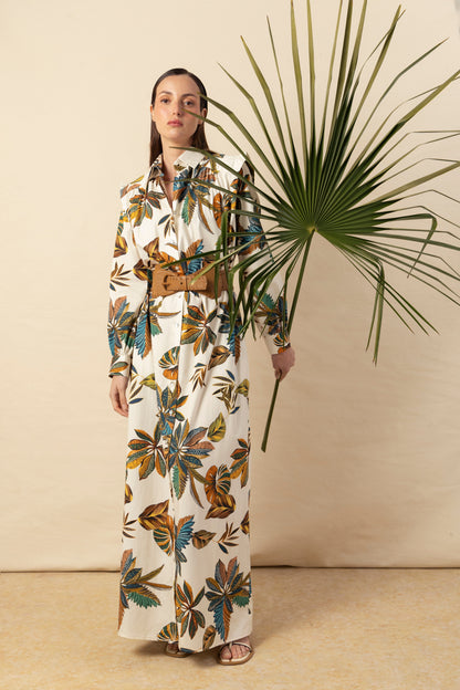 Long dress that comes from our iconic Marieta shirt but without shoulder pads turning it into a summer kaftan dress. The fabric is cotton and beige background with an ideal palm tree print. The mother-of-pearl buttons go to the knee on the front and it has the traditional gold metallic button of Julise Magon shirts on the collar and cuffs. It has the ruffle detail on the shoulder as in the shirt. It is ideal for the beach and also for everyday wear with a flat sandal.