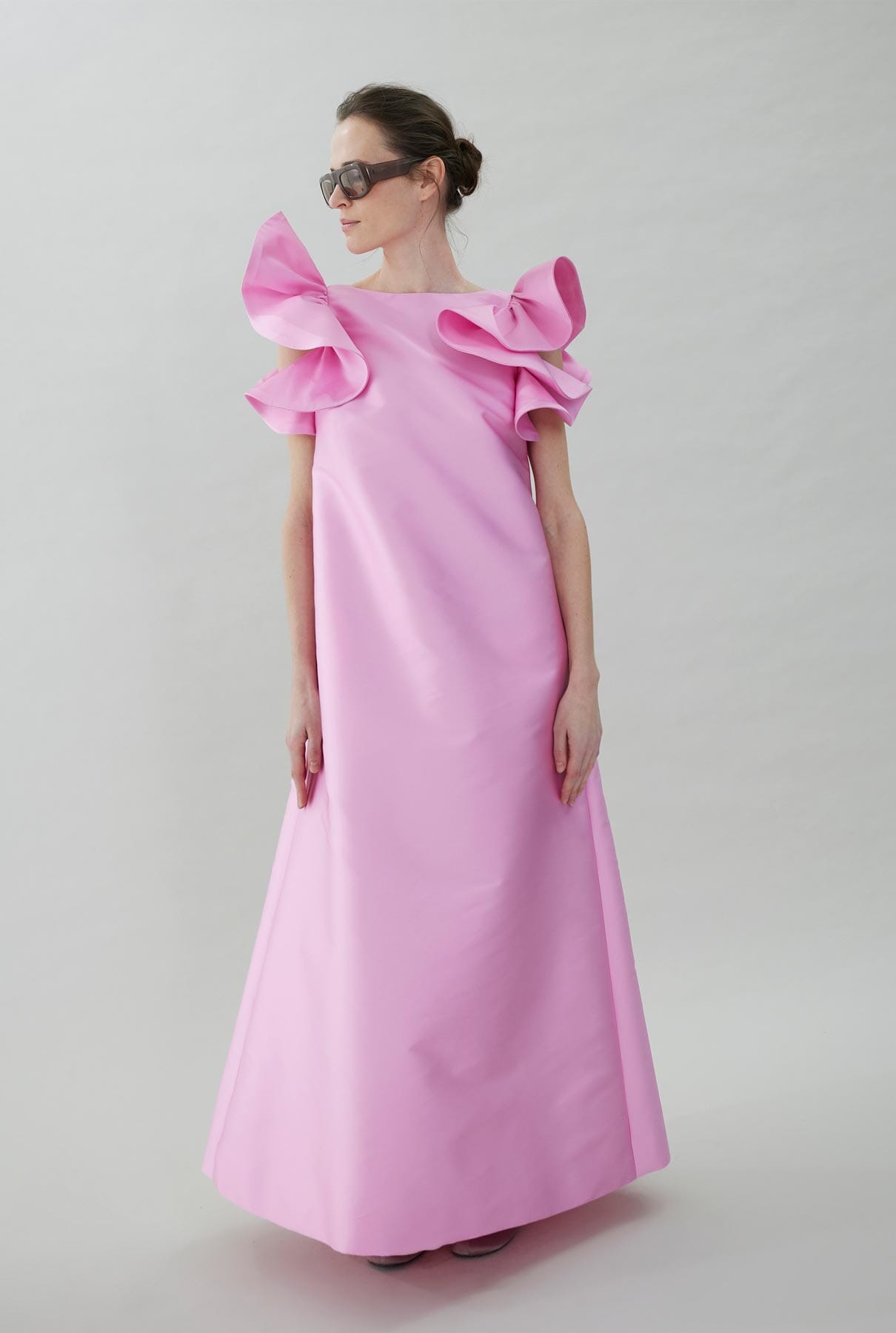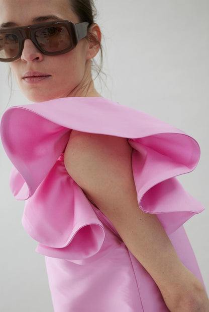 VESTIDO DE SATÉN DE CORTE A CON VOLANTES EN LAS MANGAS