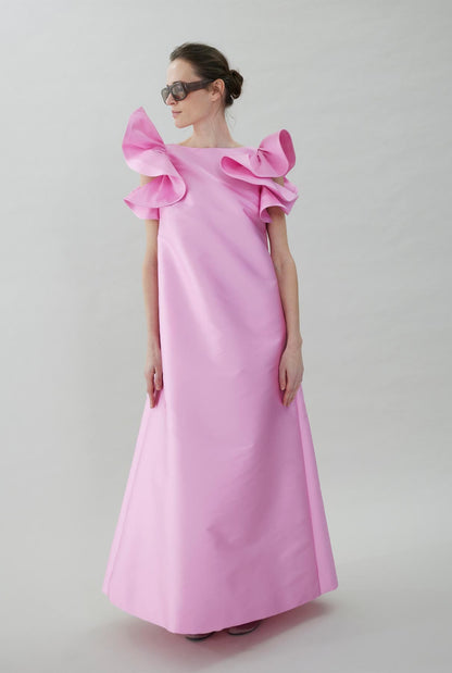Romántico vestido de satén rosa de corte A con delicados volantes y una silueta elegante, perfecto para ceremonias y ocasiones elegantes.