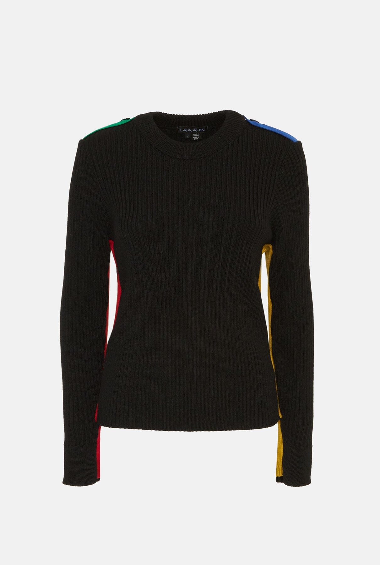 El suéter de punto acanalado Alejandra es un suéter clásico de cuello redondo en color negro con parches multicolores en los hombros y cierres con botones. Tiene elegantes mangas rectas y textura acanalada. Llévalo con todo, desde jeans hasta faldas lenceras, especialmente con su falda Alejandra a juego.