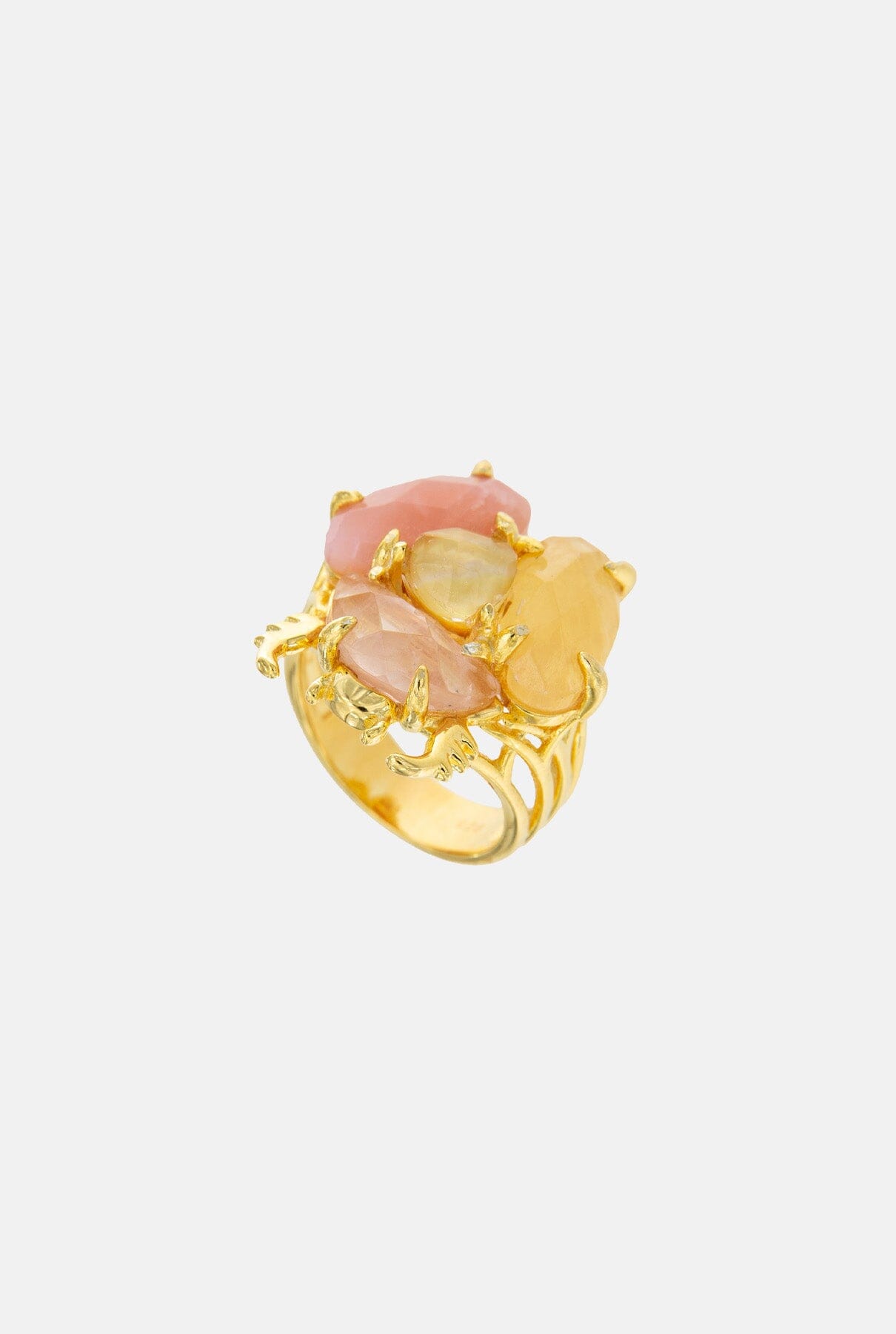 Plata de 925ms con baño de oro champagne de 3 micras, con ópalo rosa, cuarzo rosa, calcita melocotón y nácar dorado.