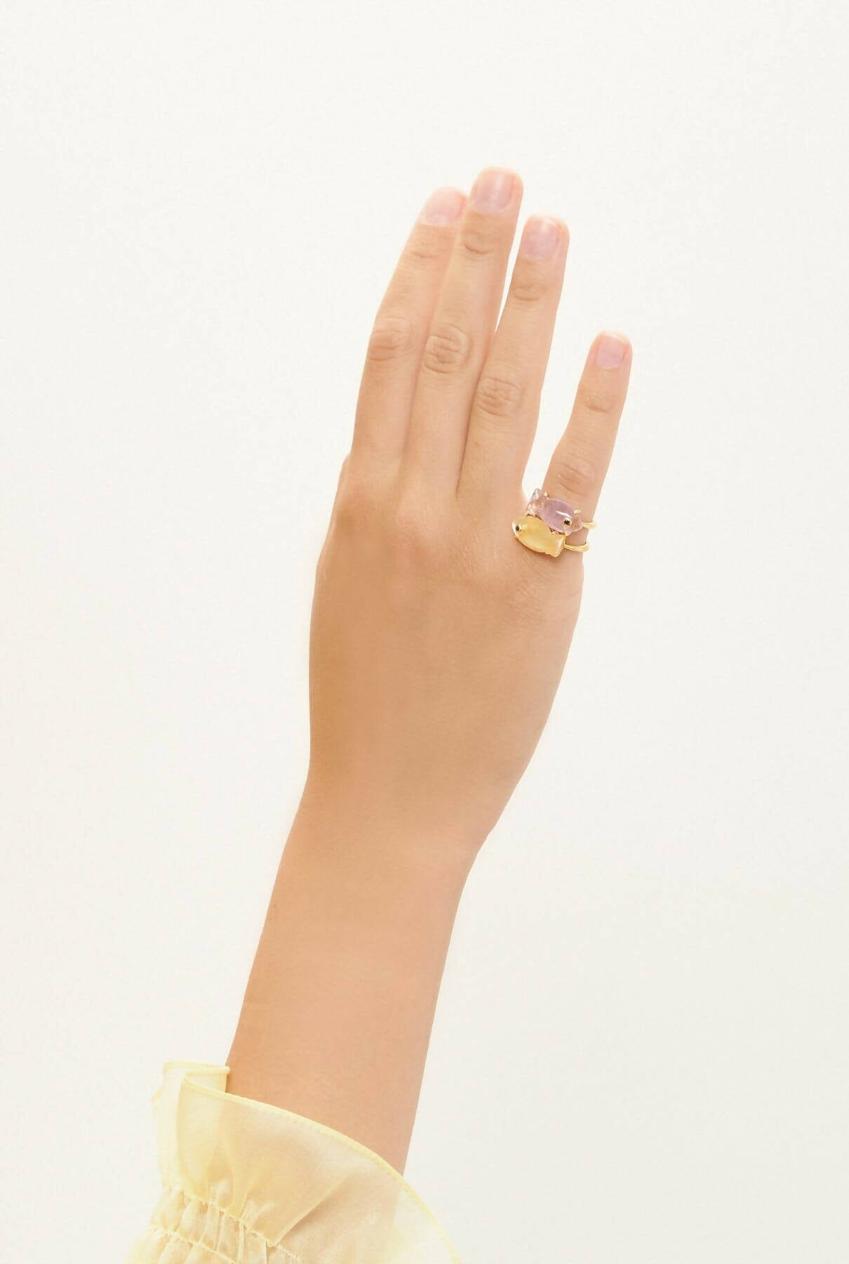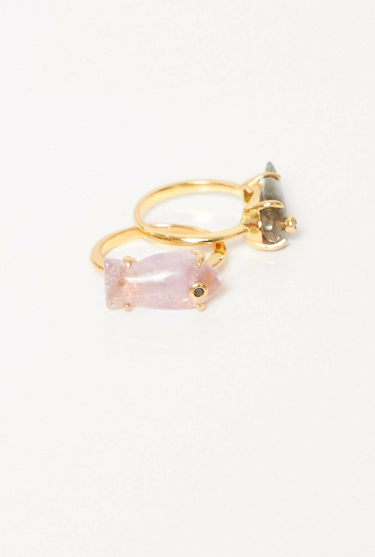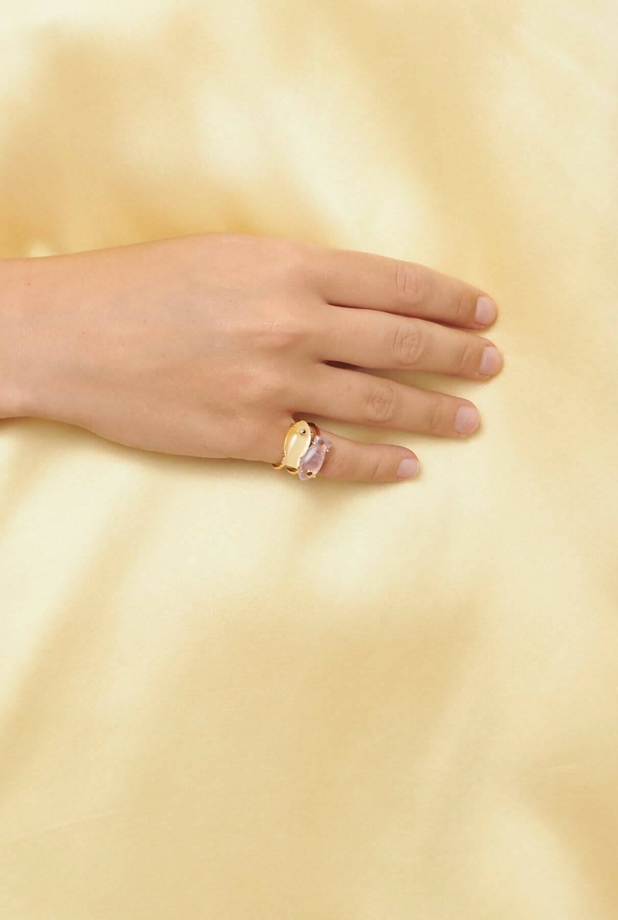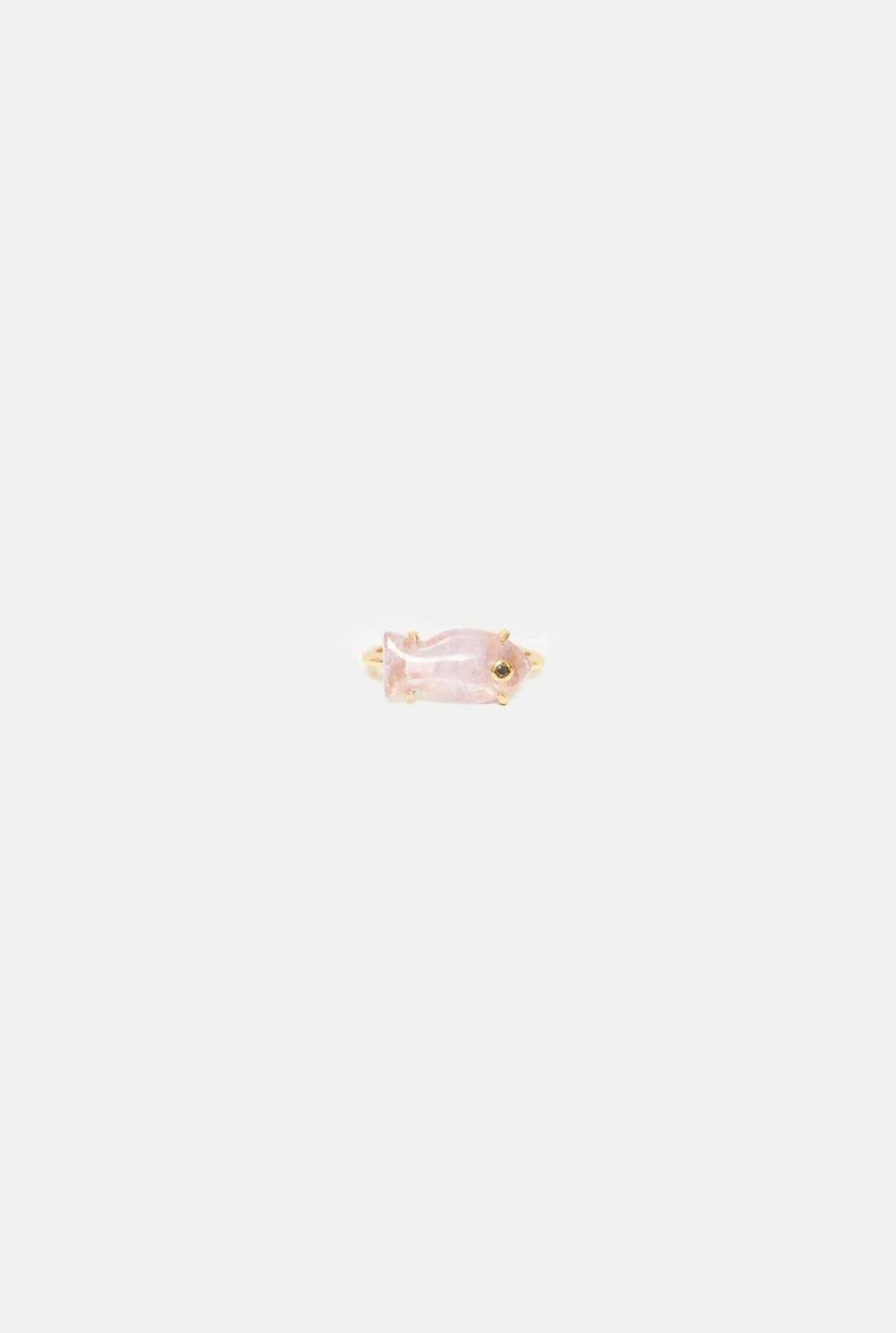 Fino anillo en oro champagne y piedras naturales talladas a mano en forma de pez con detalle de circonitas. Una pieza cuyos tonos cambiantes y movimiento te transportarán a las profundidades del mar Mediterráneo. Diseñado por Coolook.