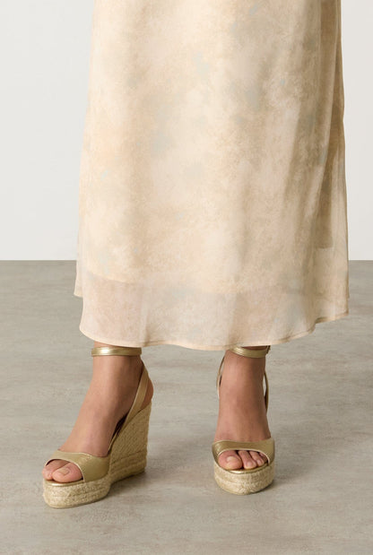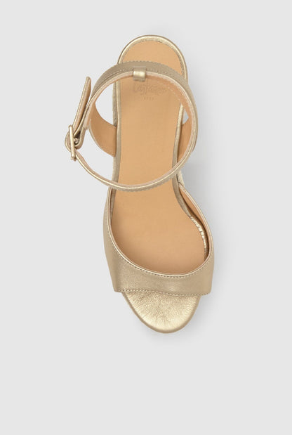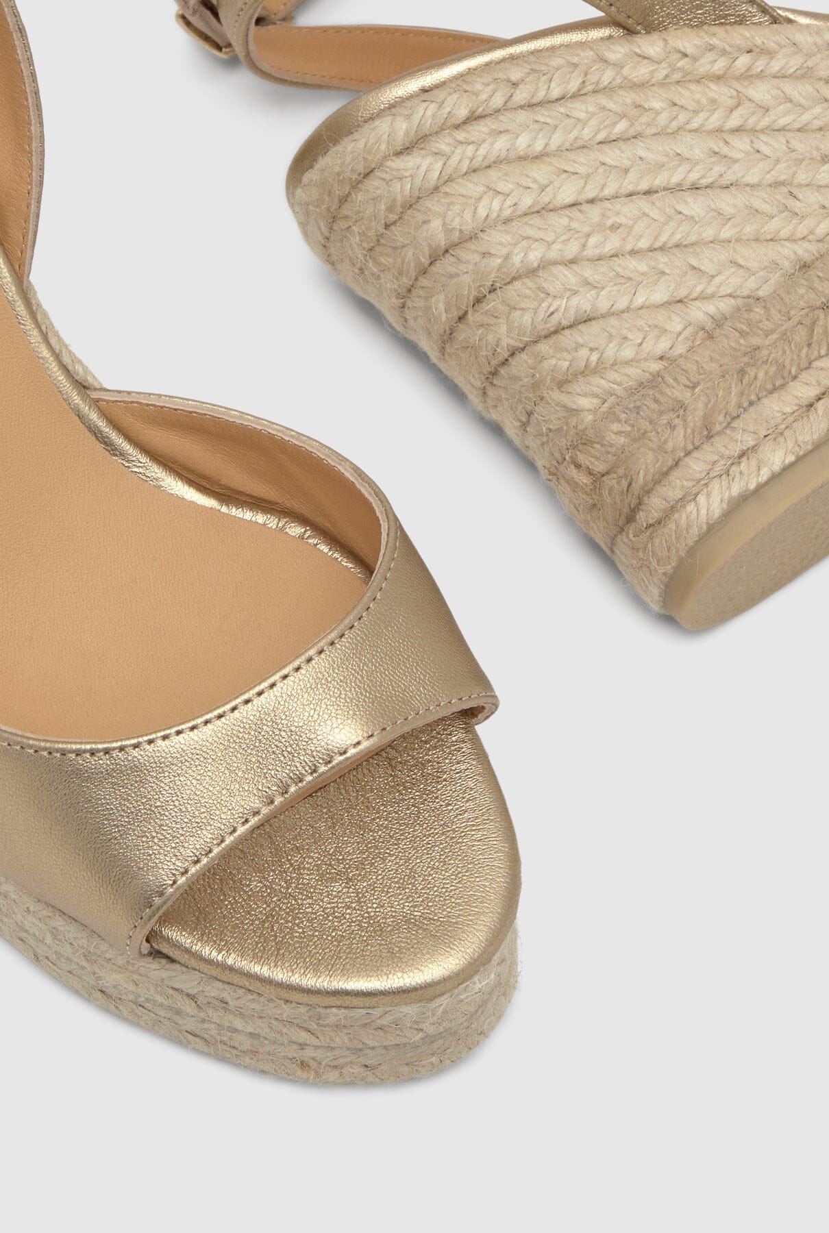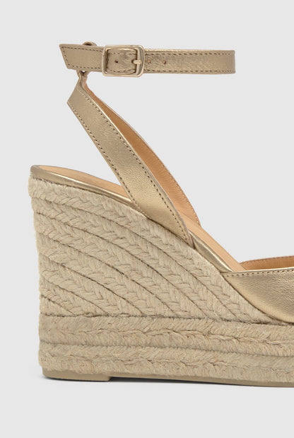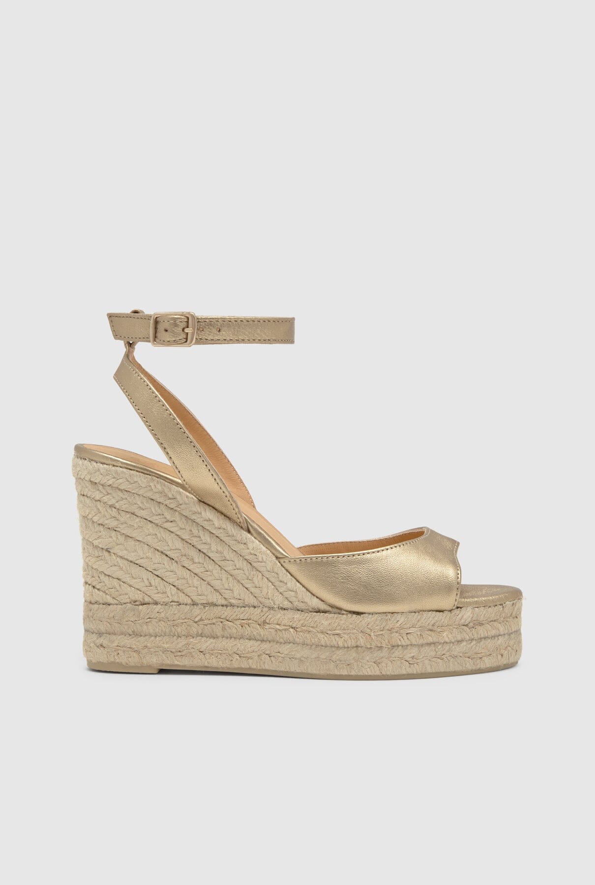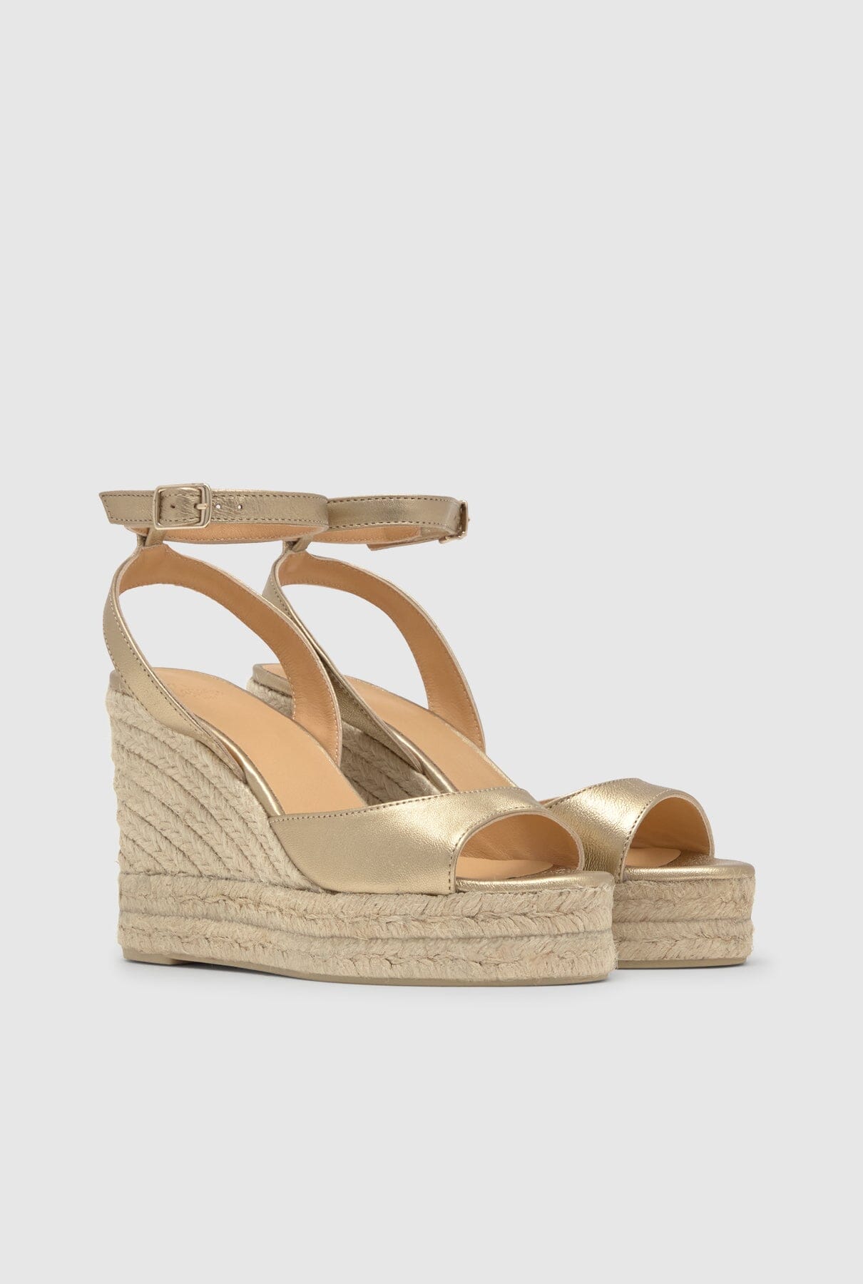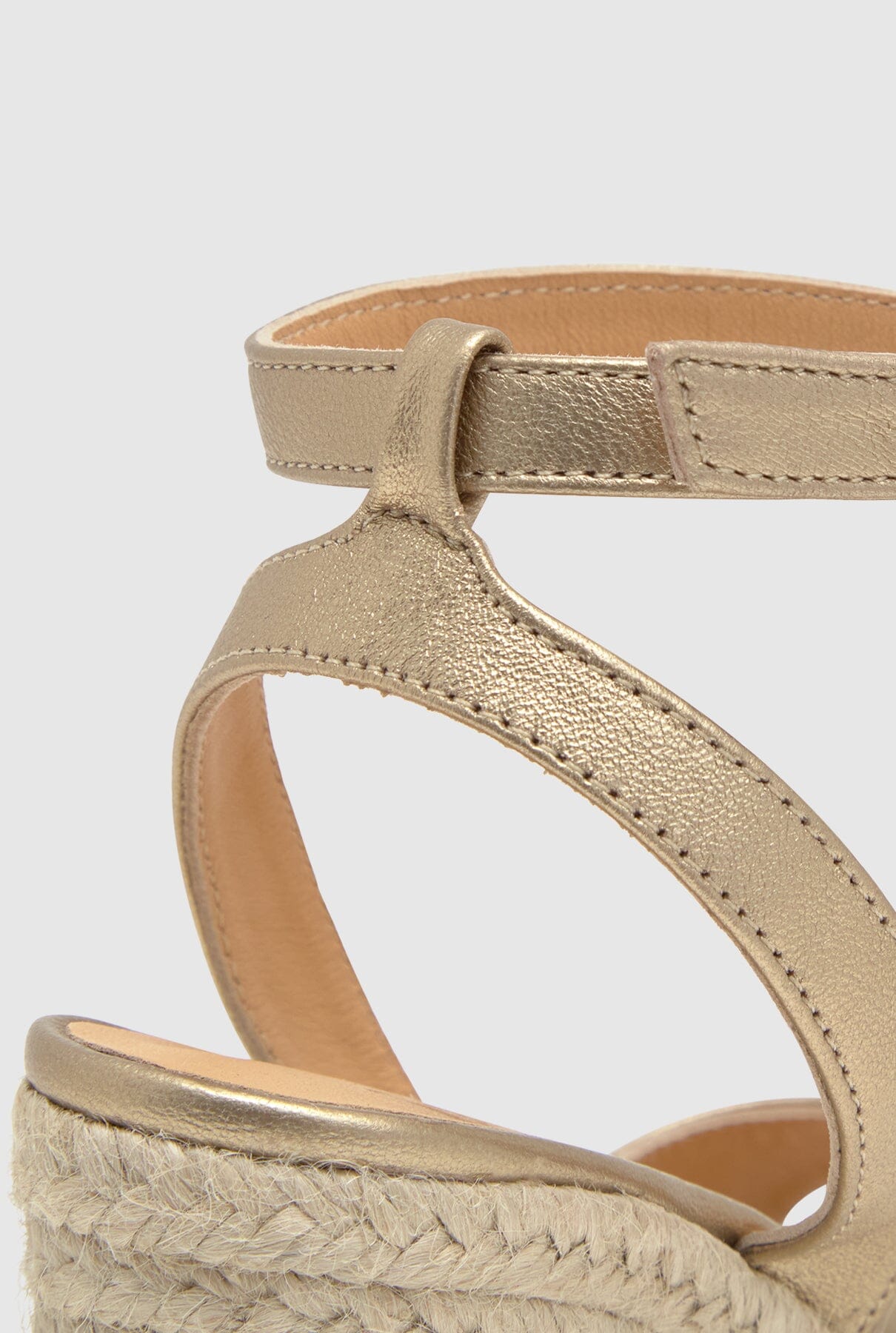 Sandalia Blair realizada en piel metalizada, con cierre de pulsera, planta acolchada y tacón de yute de 11cm con doble plataforma. Tallaje real.
