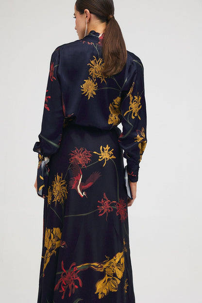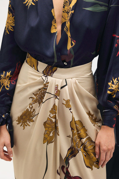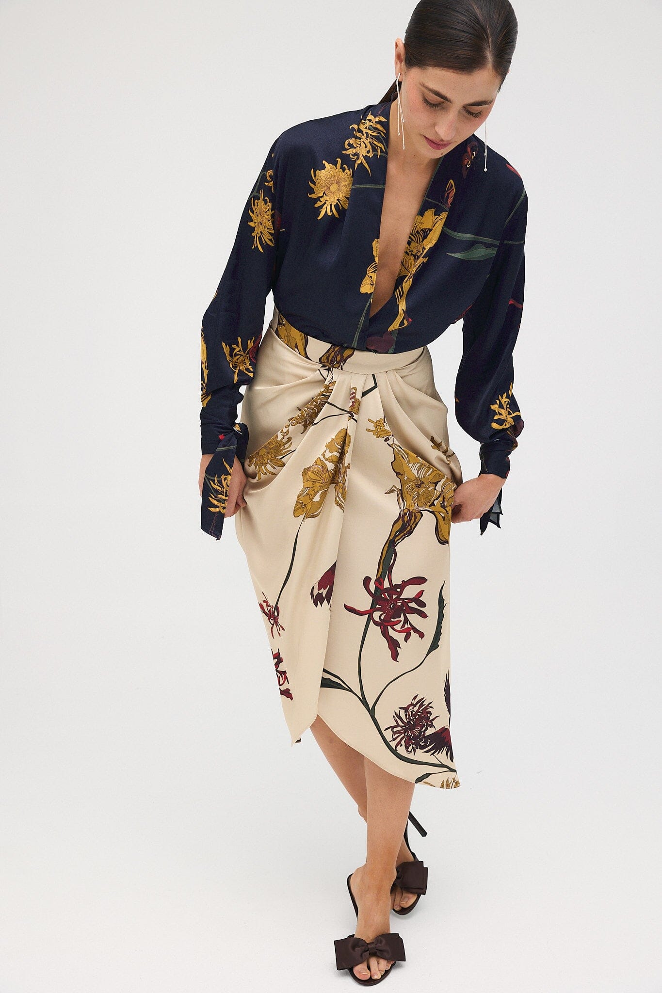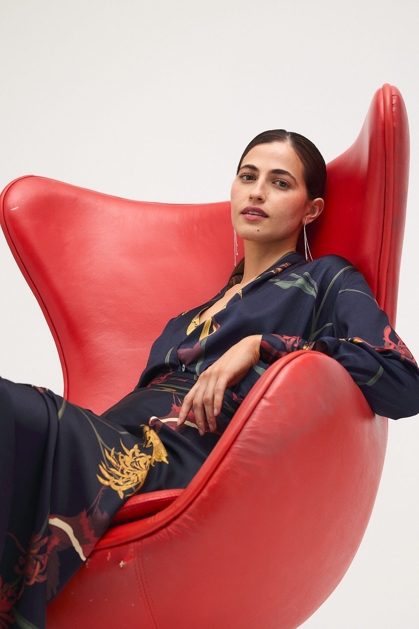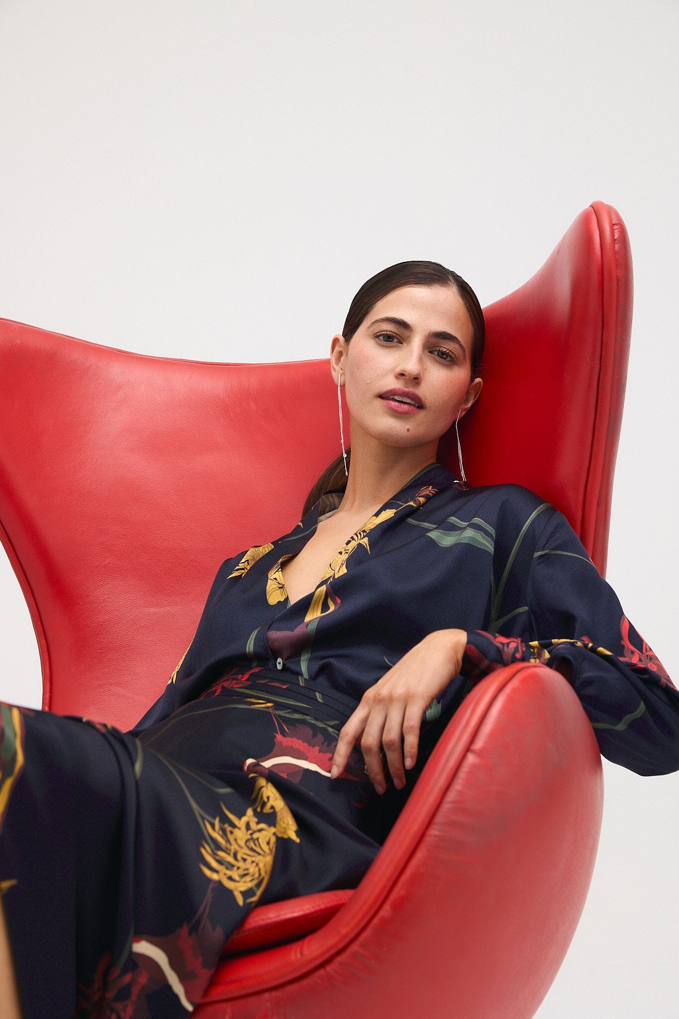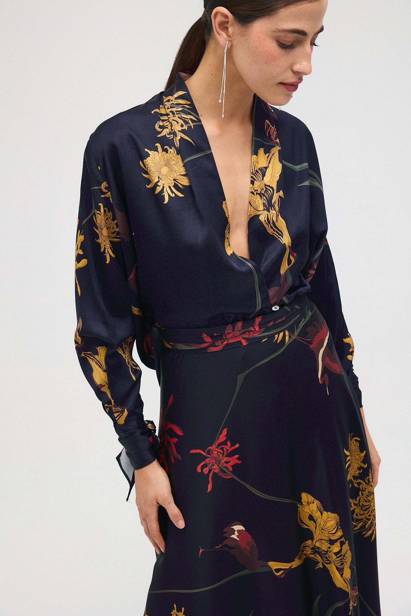 Blusa cruzada. Se abrocha con dos botones de nácar, uno interior y otro exterior. Es escotada, pero con un cuello alto en la parte trasera que favorece el cuello. Las mangas terminan en dos amplios lazos.