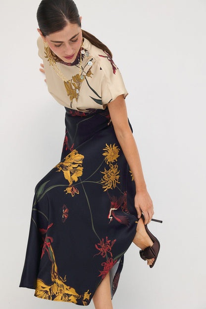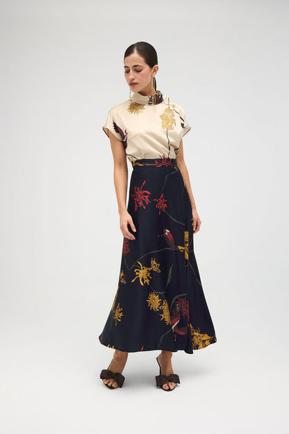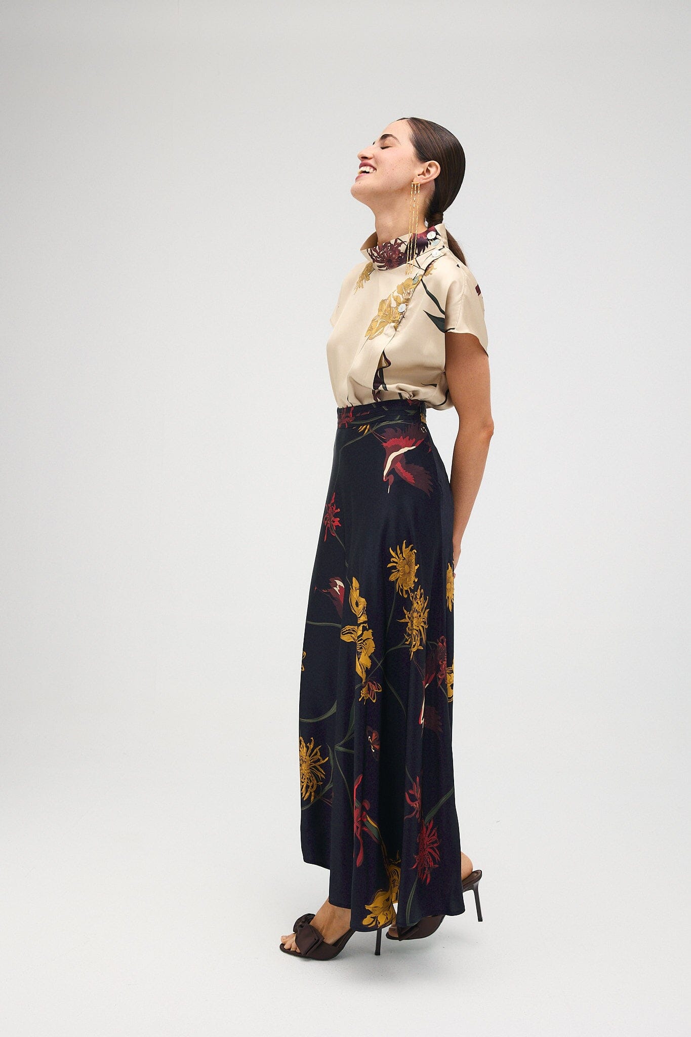 Blusa con hombro caído y cuello alto. Está confeccionada en un tejido de satén verde pato 100% viscosa. Se abrocha con botones de nácar en el lado izquierdo. Con la falda Ali a juego crea un look elegantísimo y un efecto visual de vestido. El vuelo y la caída del tejido hacen que resulte un look muy elegante.