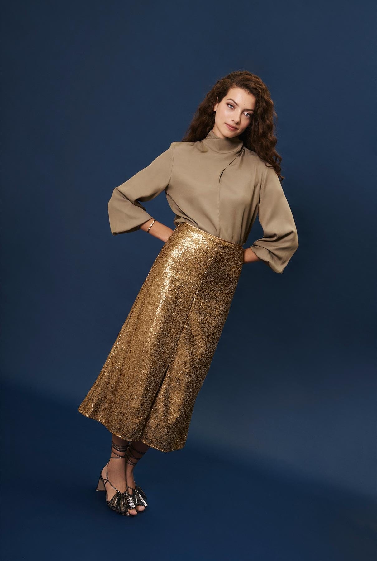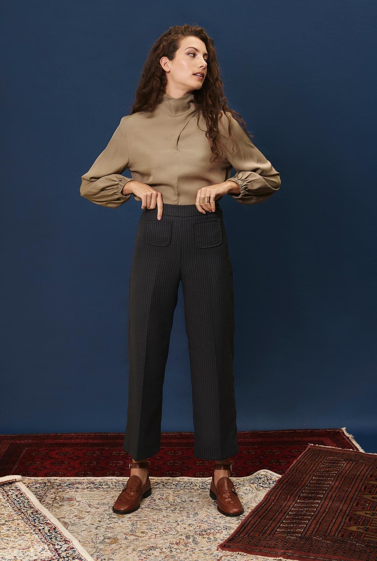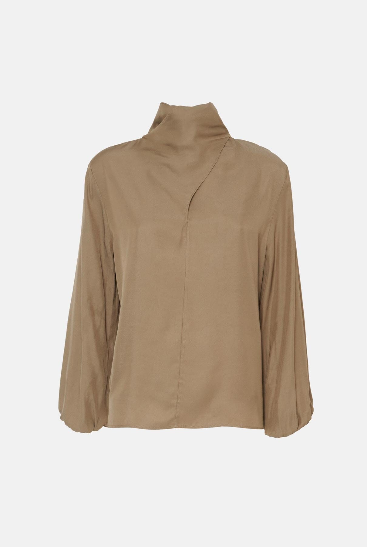 Blusa escote cruzado y cuello subido. Tiene una manga abullonada que cierra con goma por lo que se puede ajustar la altura a la que llevarla. Se abotona en centro espalda con dos botones donde tiene unos pliegues. Está confeccionada en un tejido fluido