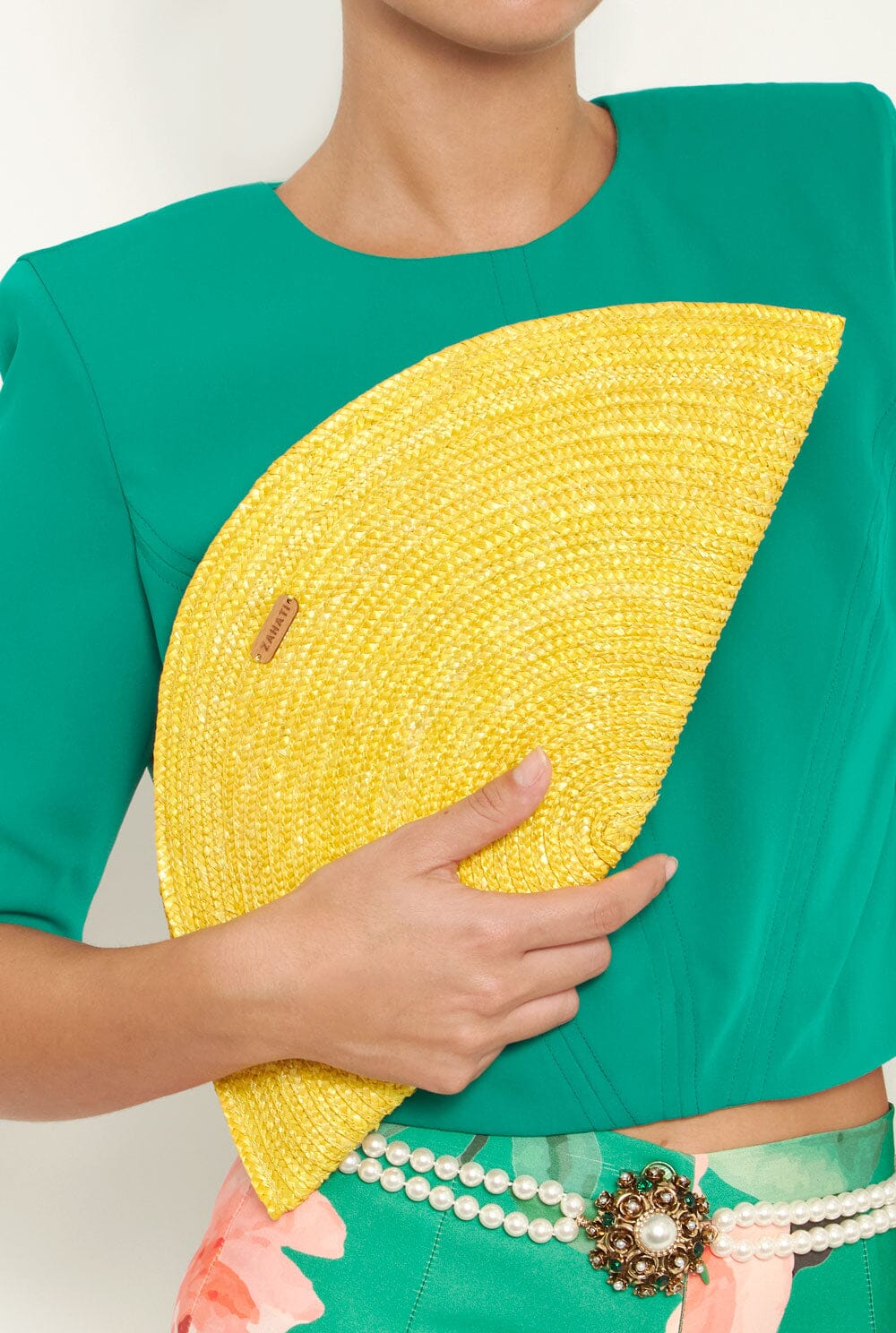 El bolso abanico es un bolso abanico creado con paja de trigo trenzada a mano. Un bolso llamativo y cómodo que llamará la atención en cualquier lugar. Bloqueo magnético.