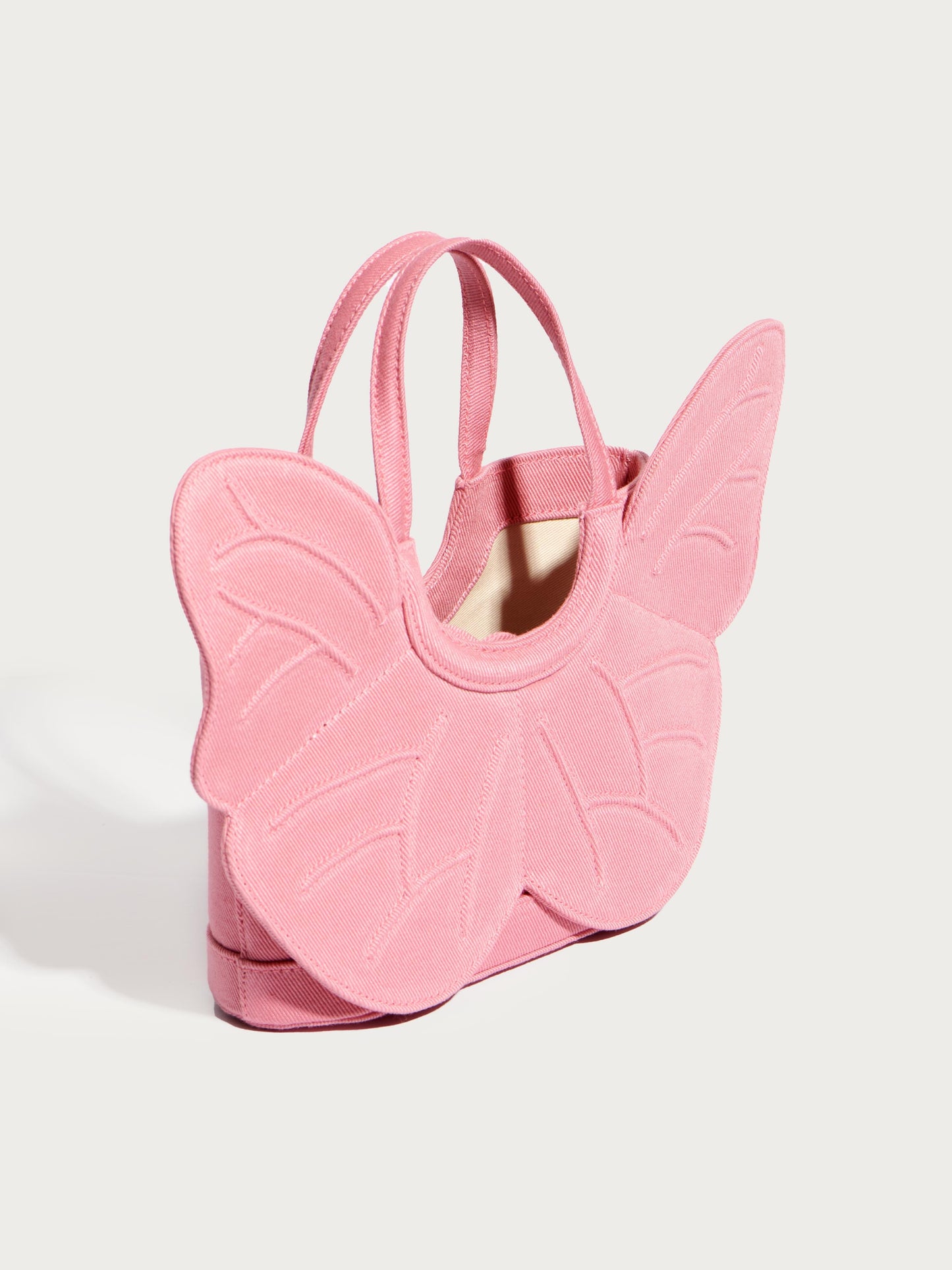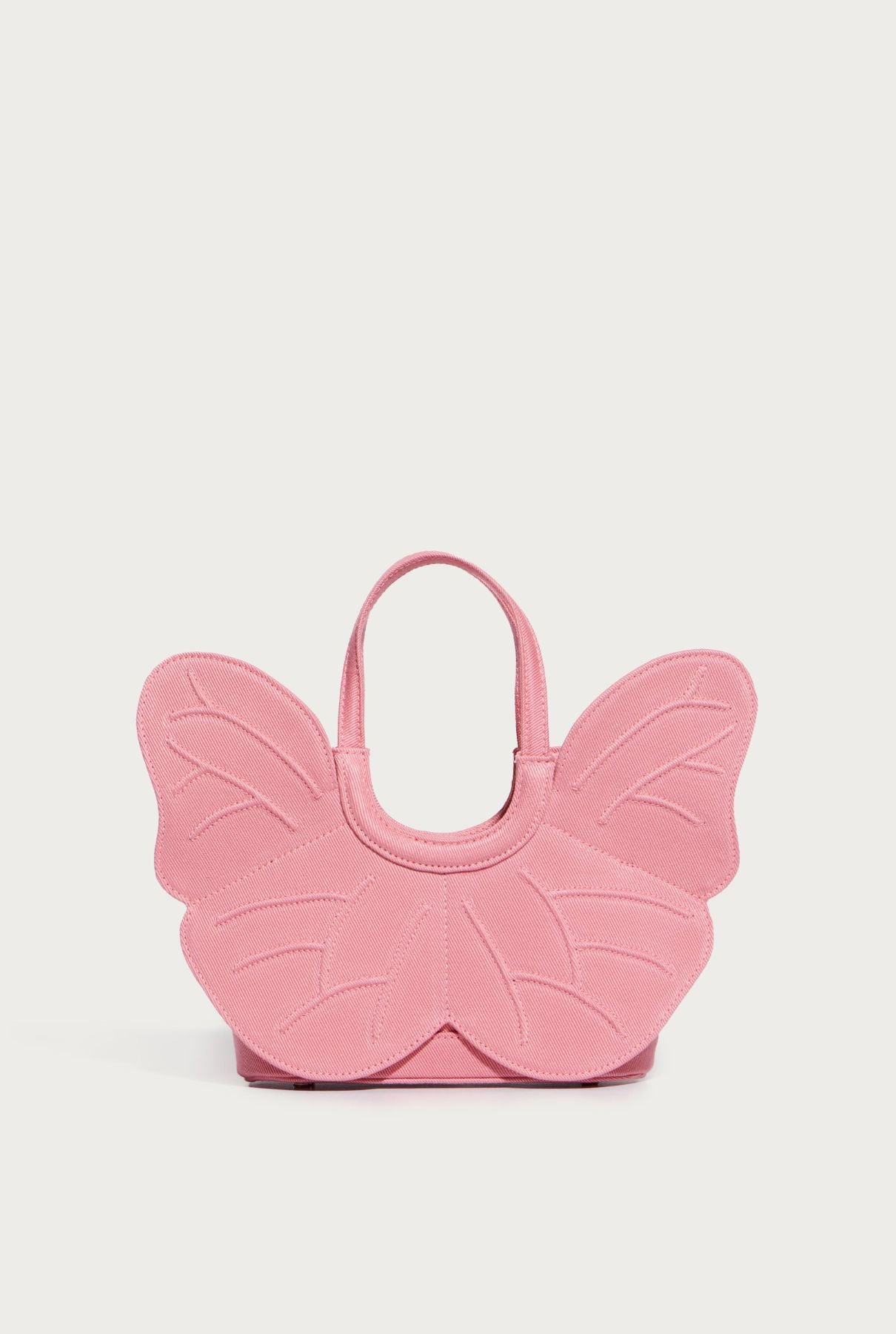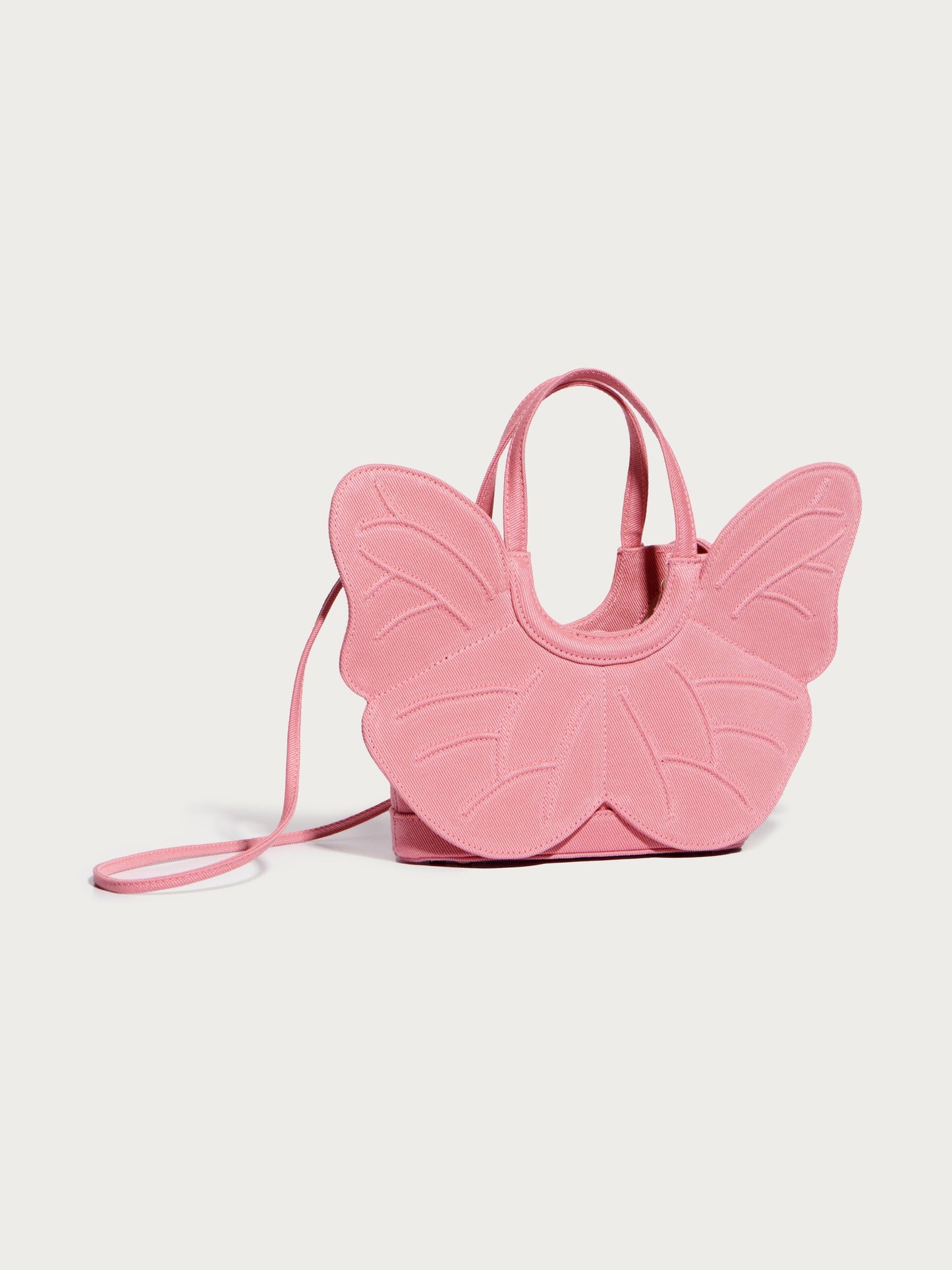Bolso con forma de mariposa en denim rosa. Asa para llevar en la mano y asa larga extraíble para llevar al hombro.