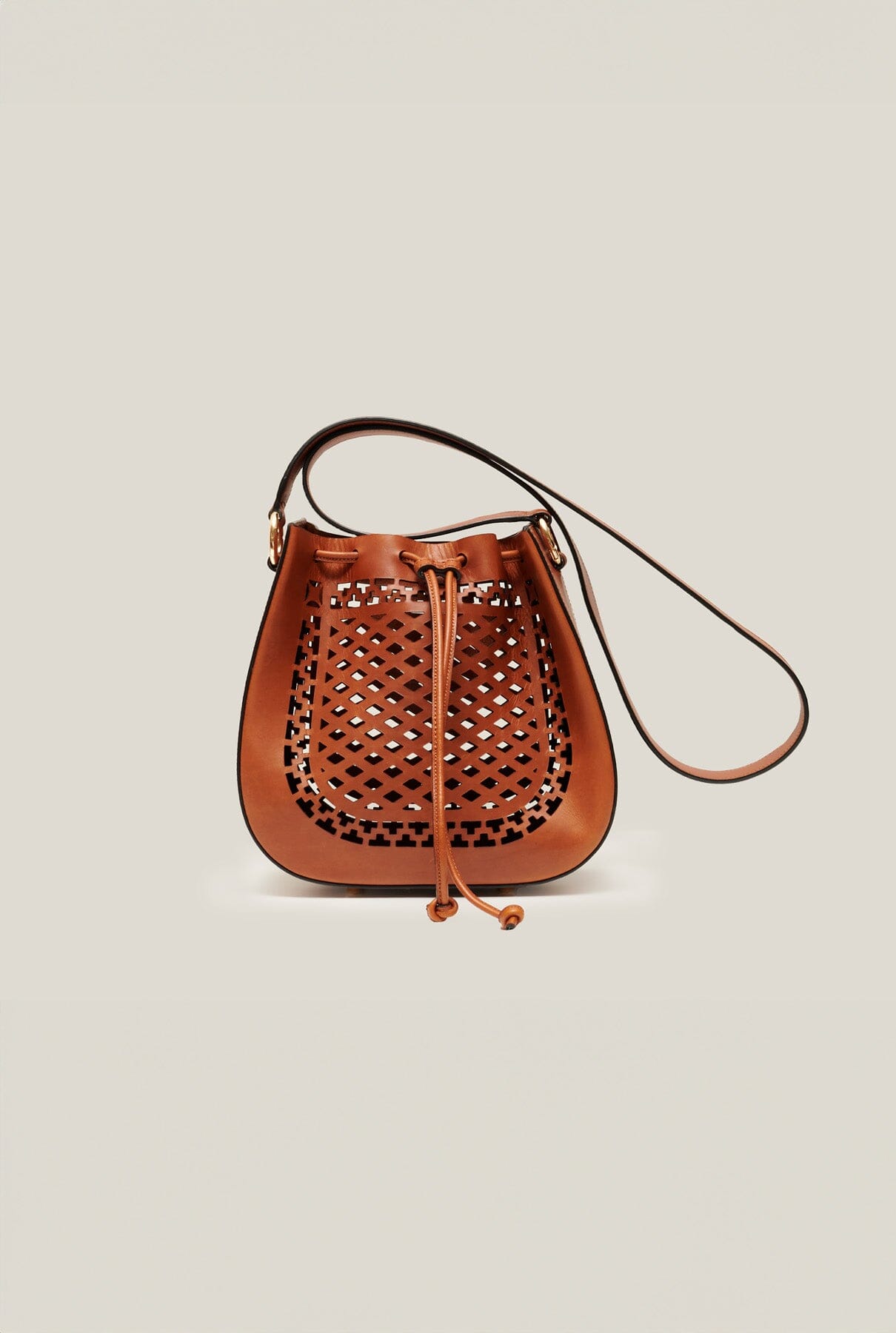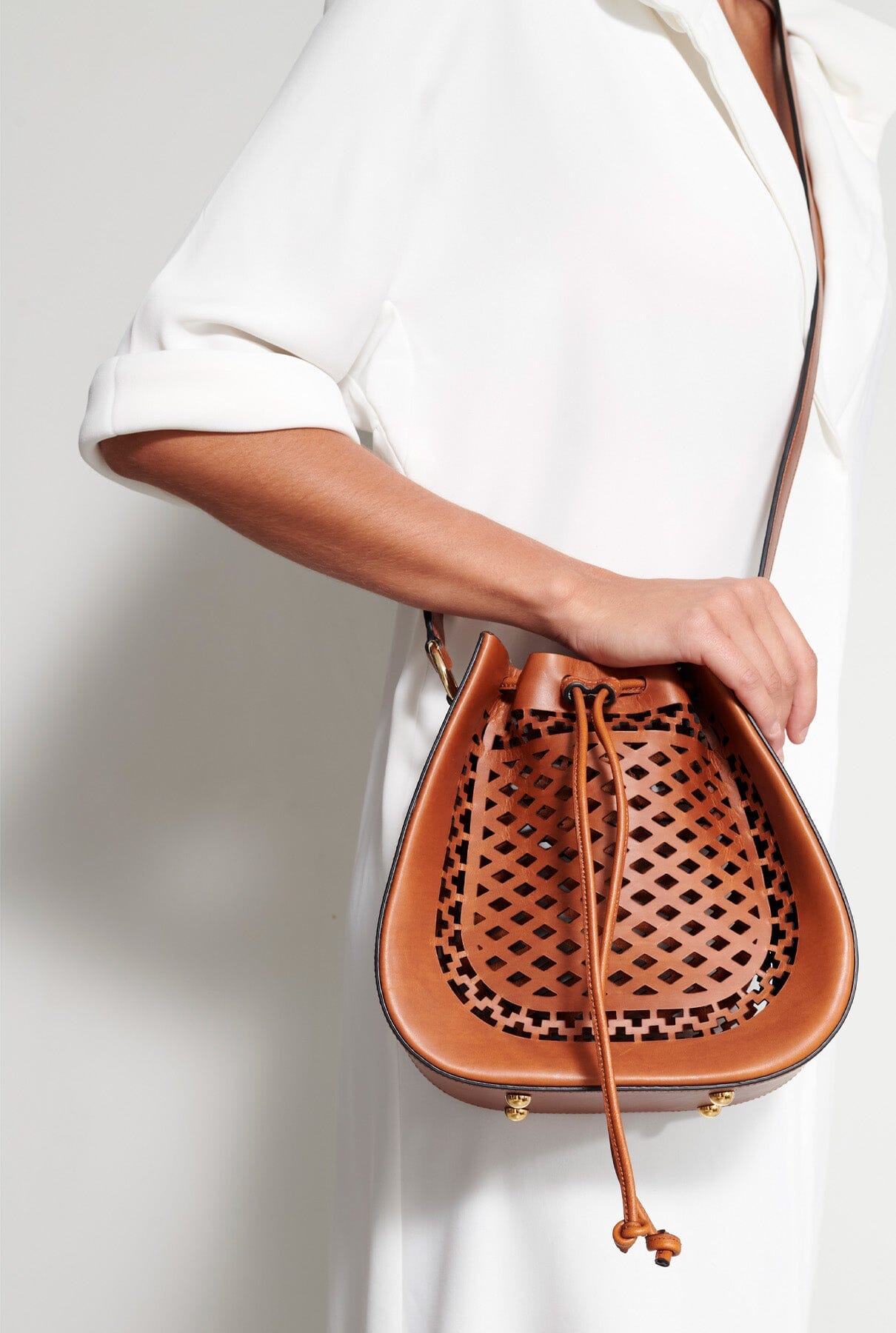 Su diseño está inspirado en el carruaje tirado por caballos 'Tonneau', que traducido del francés significa barril, y se llama así porque el espacio para sentarse tiene forma de barril, abierto solo en la parte superior. Los paneles que componen el 'Tonneau' están calados con el patrón que antiguamente tenían los pisos de los carruajes, y que seguimos reproduciendo en nuestro taller. Un bolso práctico, cómodo y fácil para la mujer urbana en movimiento.
