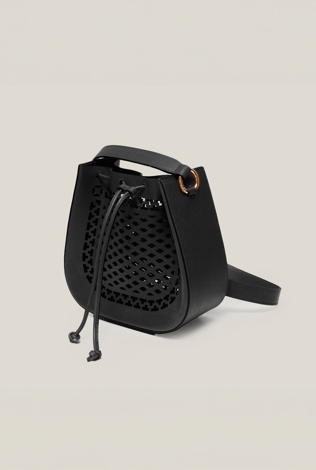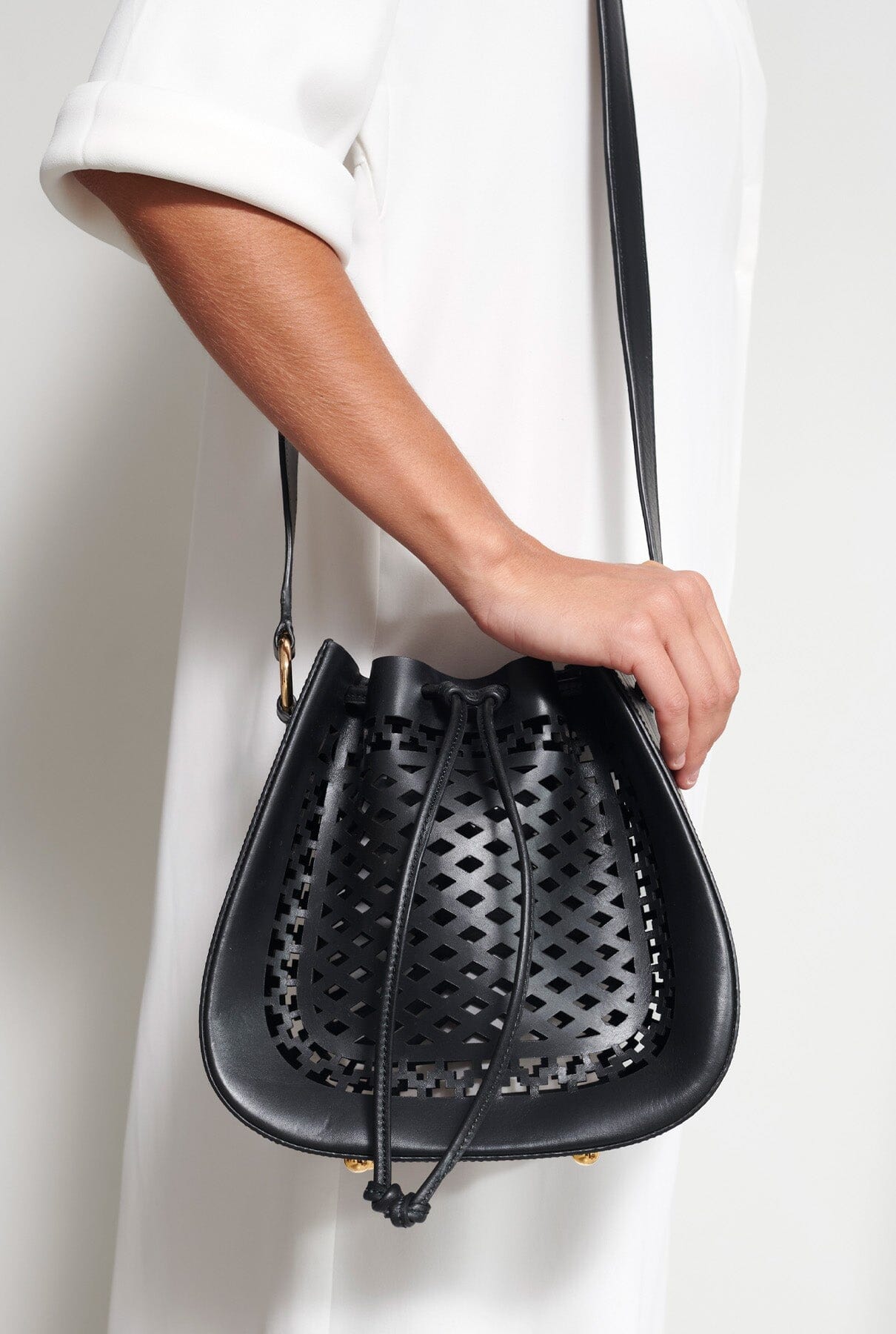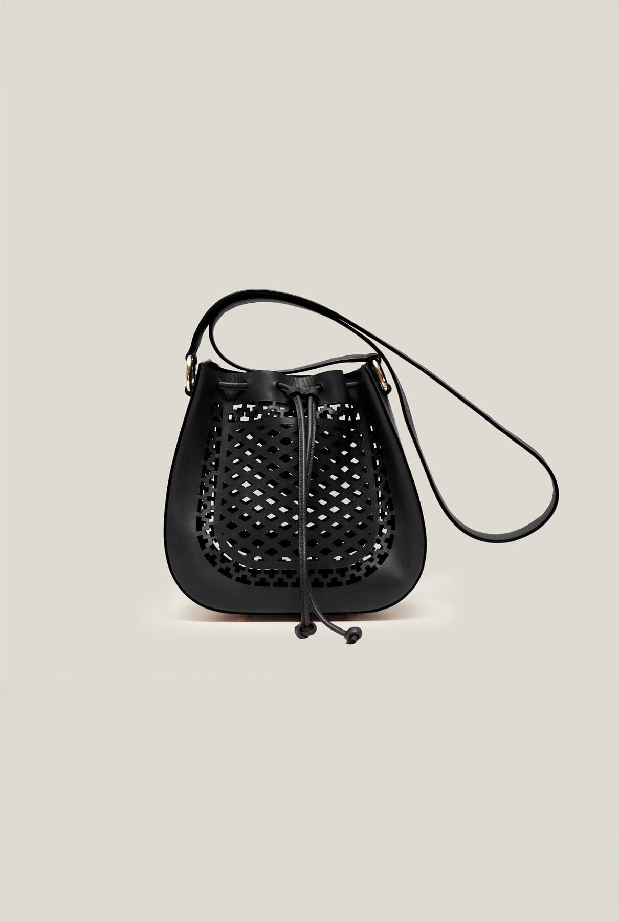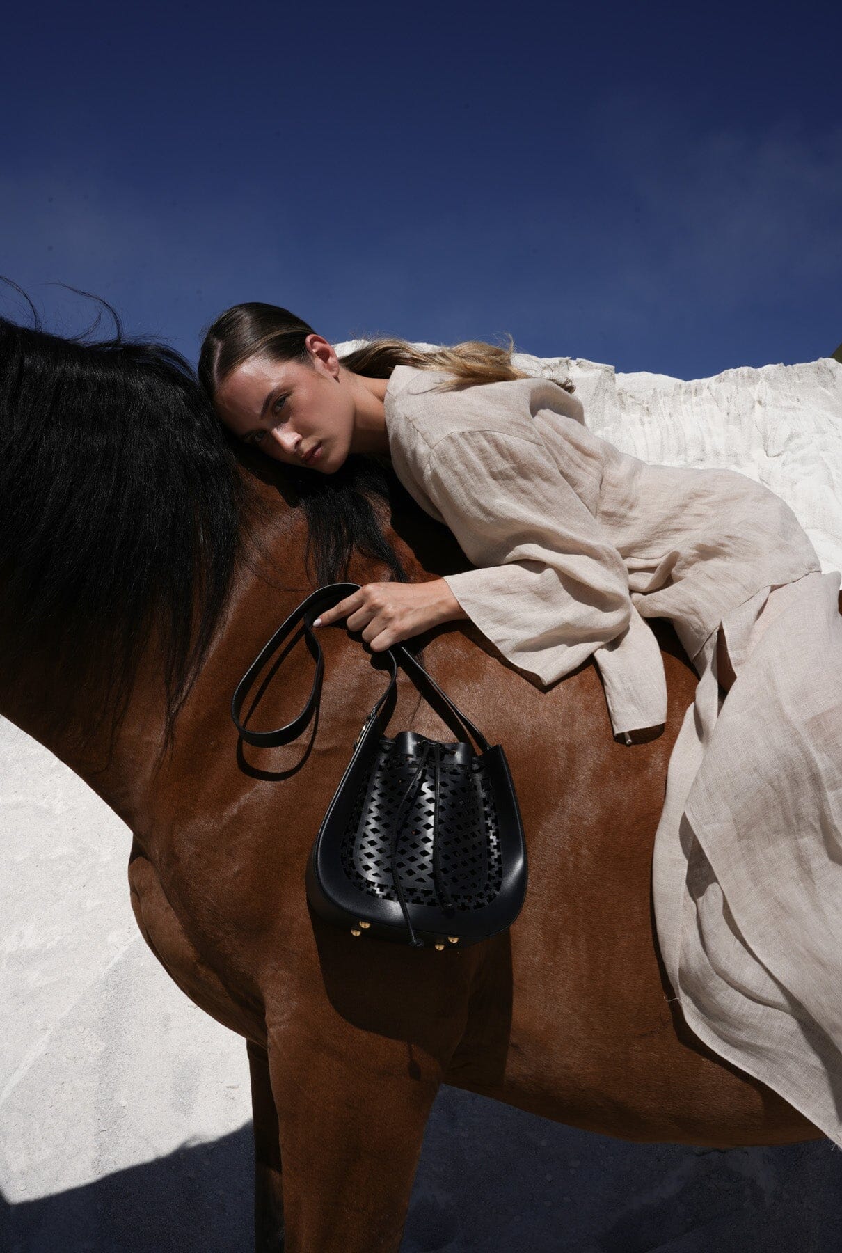 Su diseño está inspirado en el carruaje tirado por caballos 'Tonneau', que traducido del francés significa barril, y se llama así porque el espacio para sentarse tiene forma de barril, abierto solo en la parte superior. Los paneles que componen el 'Tonneau' están calados con el patrón que antiguamente tenían los pisos de los carruajes, y que seguimos reproduciendo en nuestro taller. Un bolso práctico, cómodo y fácil para la mujer urbana en movimiento.