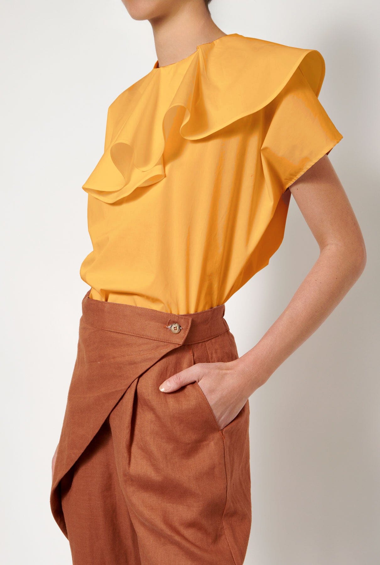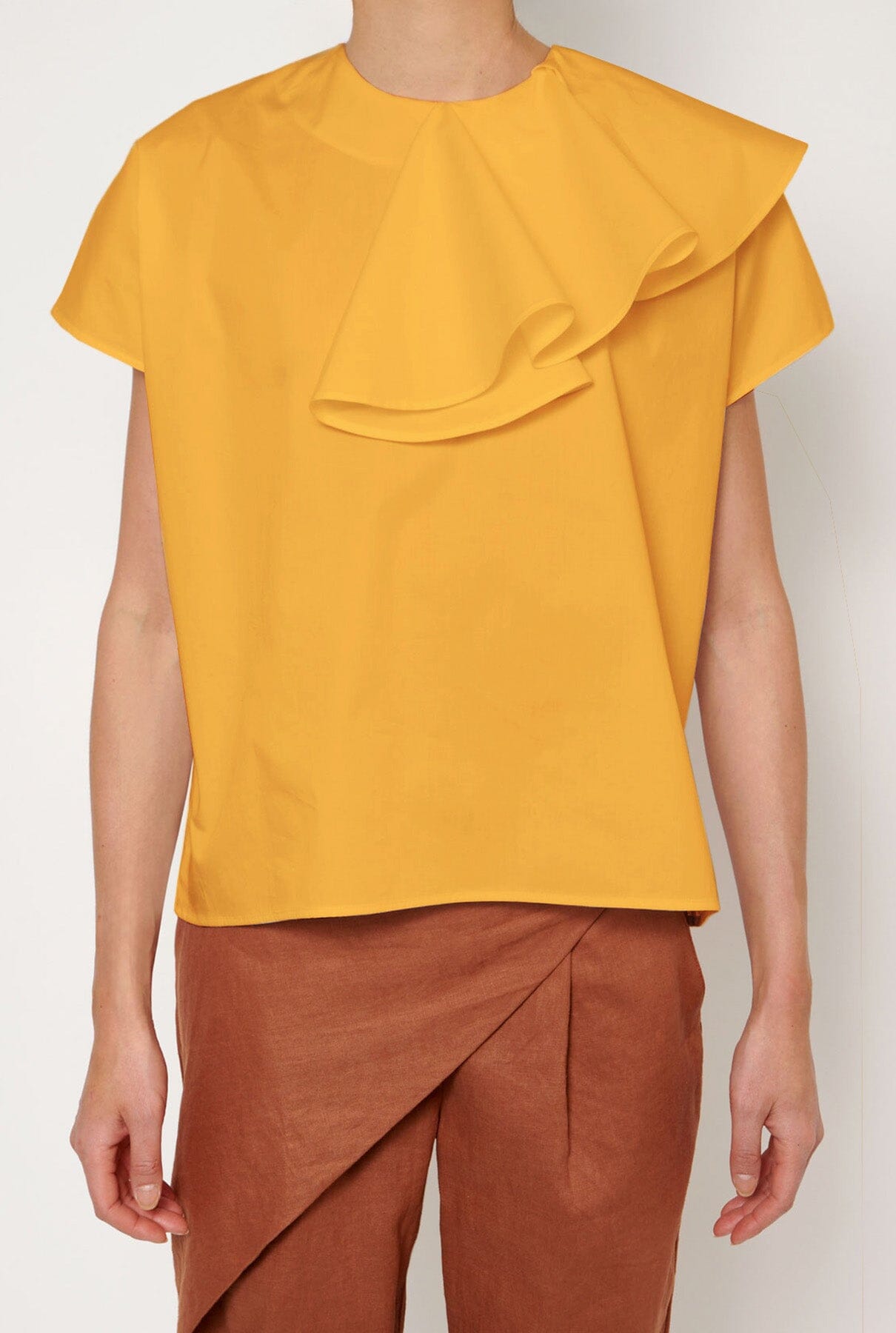 Camisa de popelina de algodón de manga corta con volante en el cuello.