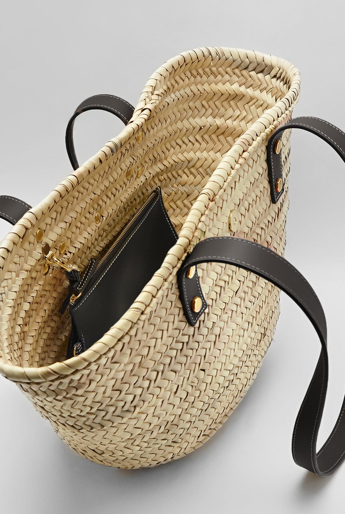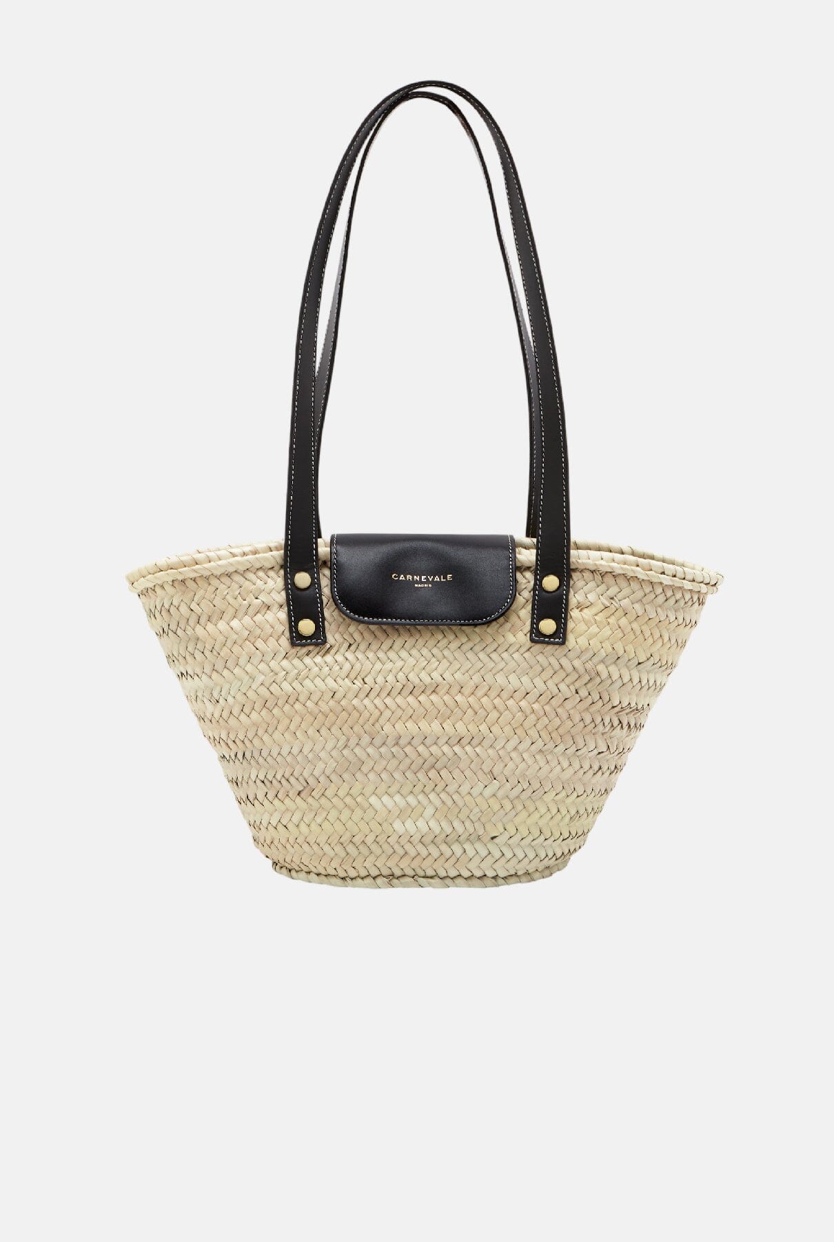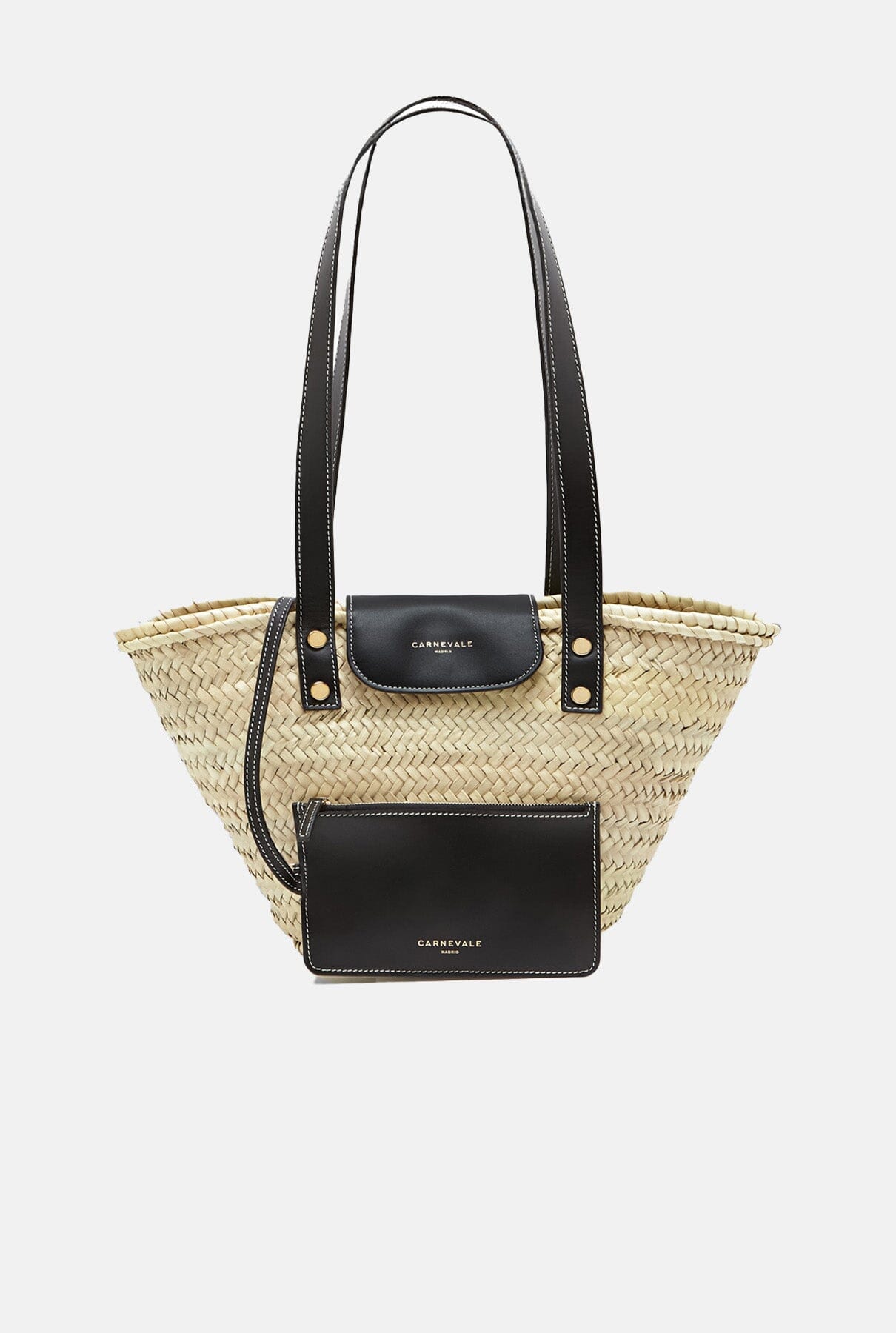 Bolso Cesta elaborado artesanalmente con hojas de palma y decorado con asas y solapa de piel de vacuno lisa de color marrón, adornado con el logo de Carnevale grabado en oro. Contiene una bolsa de piel extraíble en su interior. El cierre de la solapa es magnético. Presenta acabados metálicos en tono dorado. La compra incluye una bolsa de algodón orgánico.
