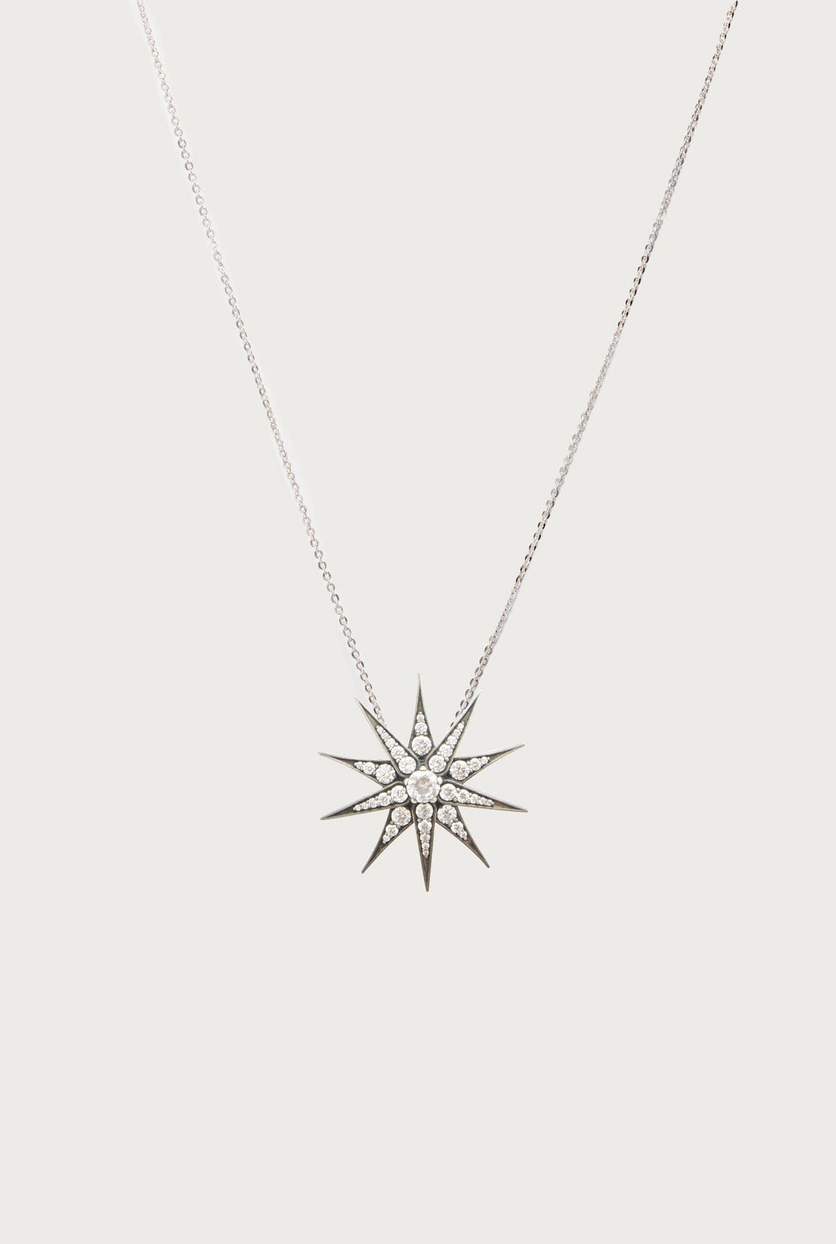 Collar de la colección 'Stars', tamaño pequeño. Plata y circonitas. Cadena de plata de 40cm. Colgante en forma de estrella de diez puntas de 2,5cm (pequeña) y 4,5cm (grande) de ancho, repleto de circonitas.