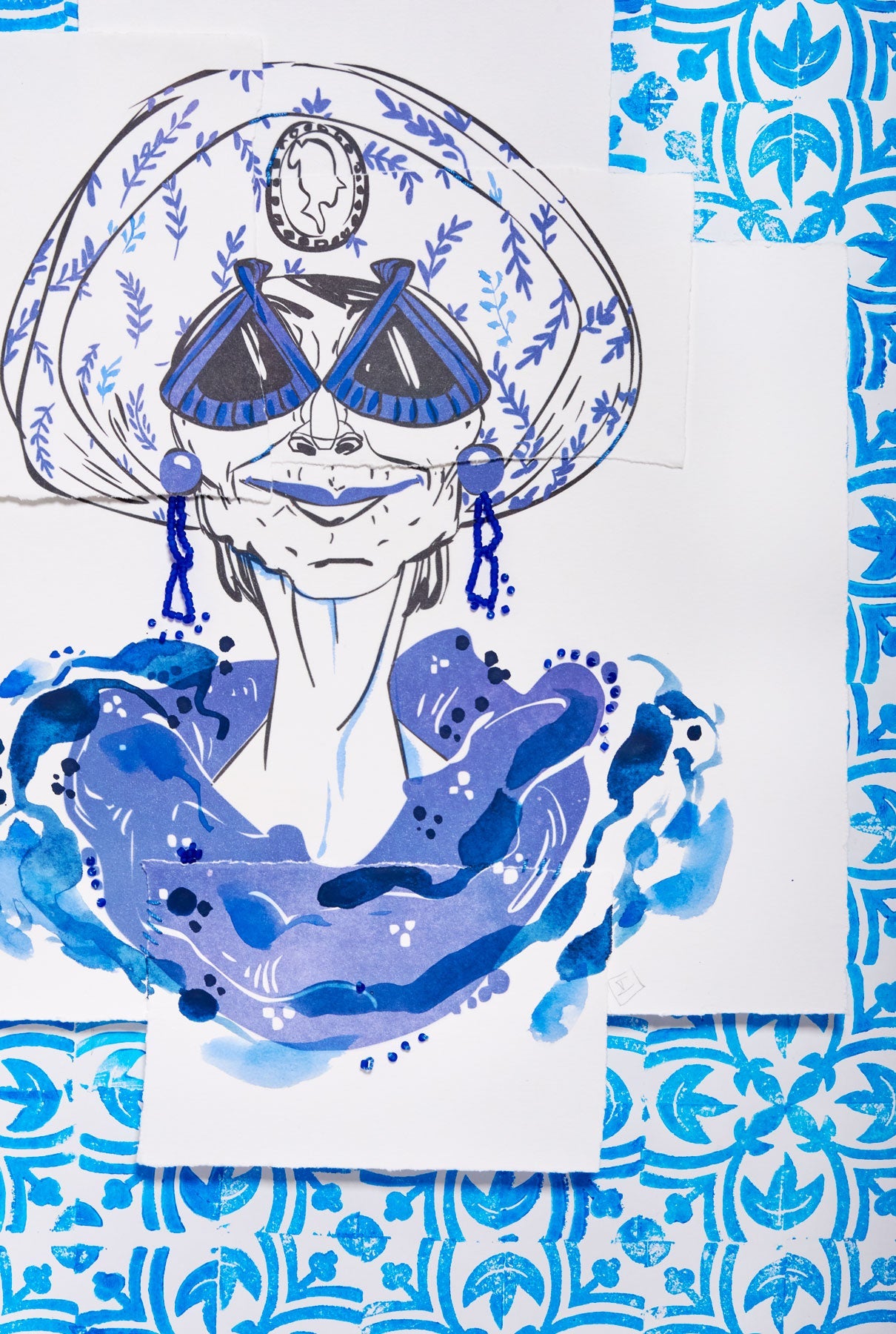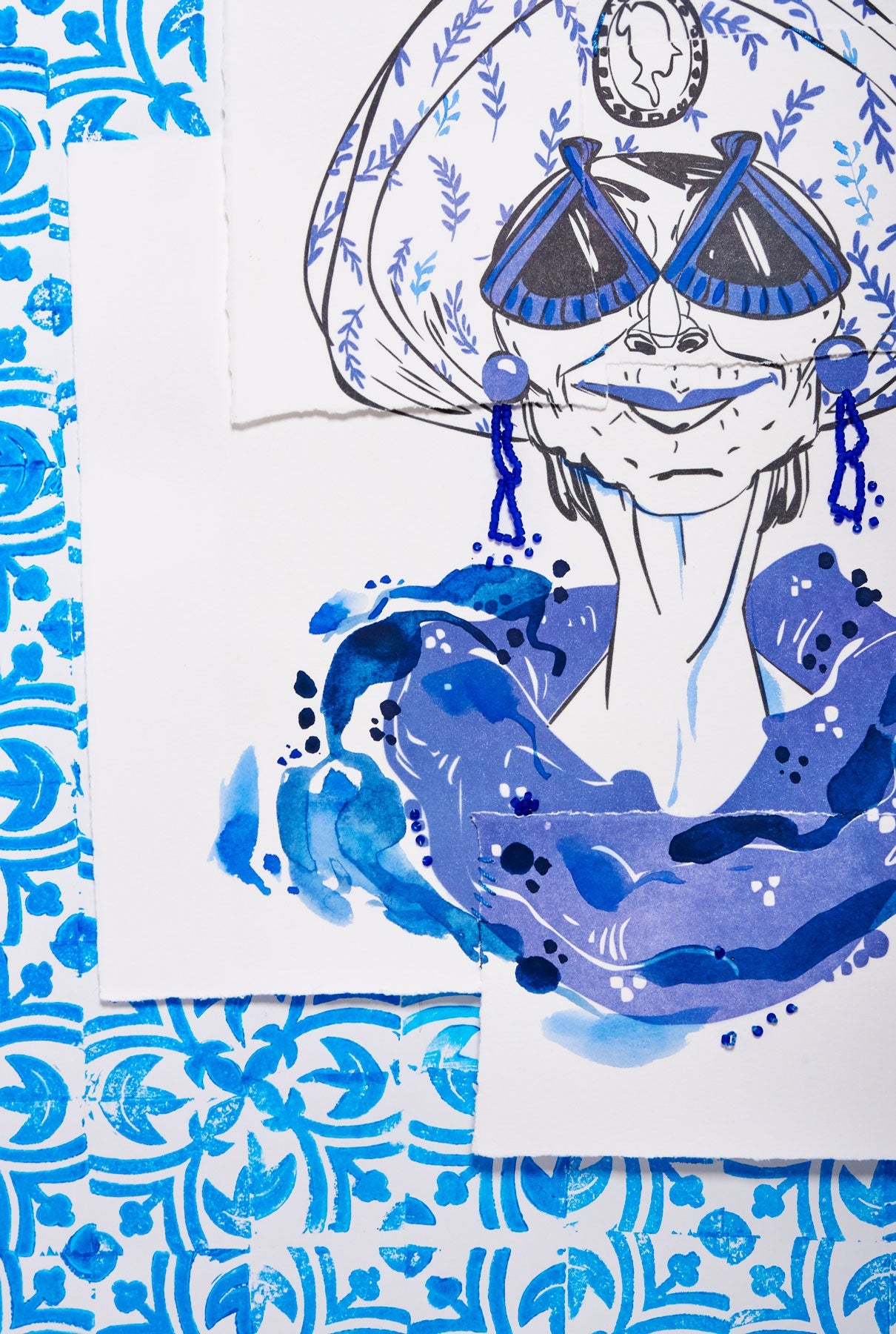 Desde el más moderno dibujo digital hasta el grabado, ya sea sobre papel o tela, que luego son cosidos e intervenidos con pinturas y abalorios.