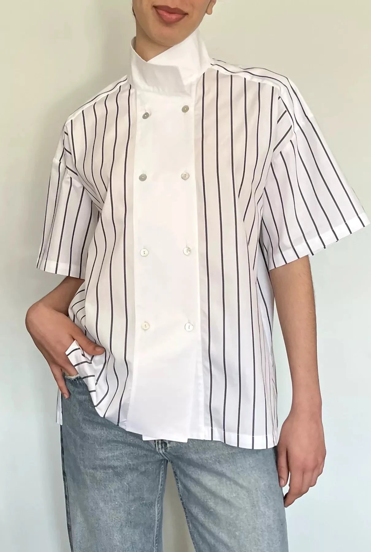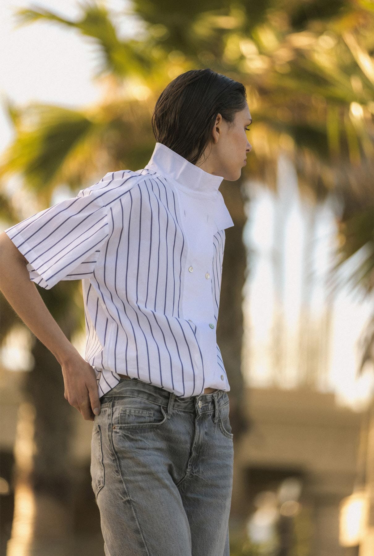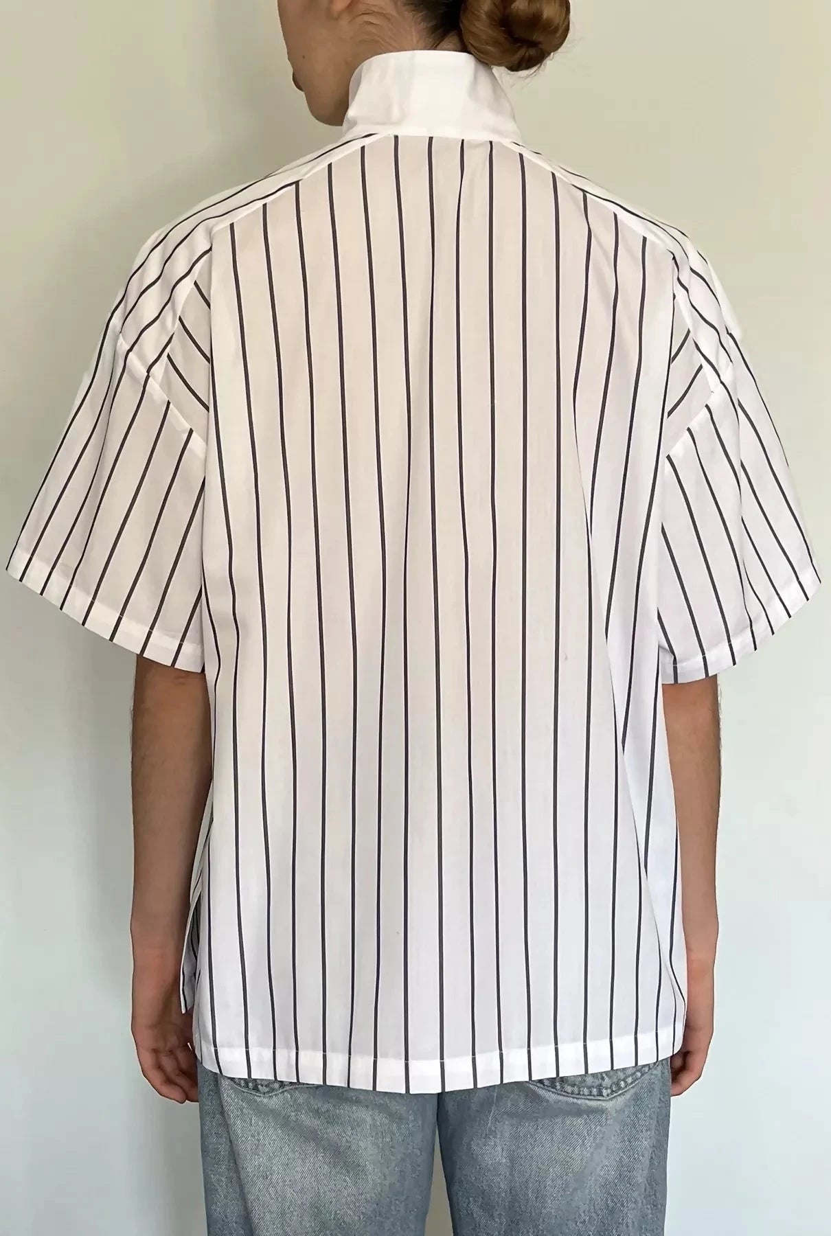 Camisa de manga corta con cuello chimenea y cruzado central. Mangas caídas.