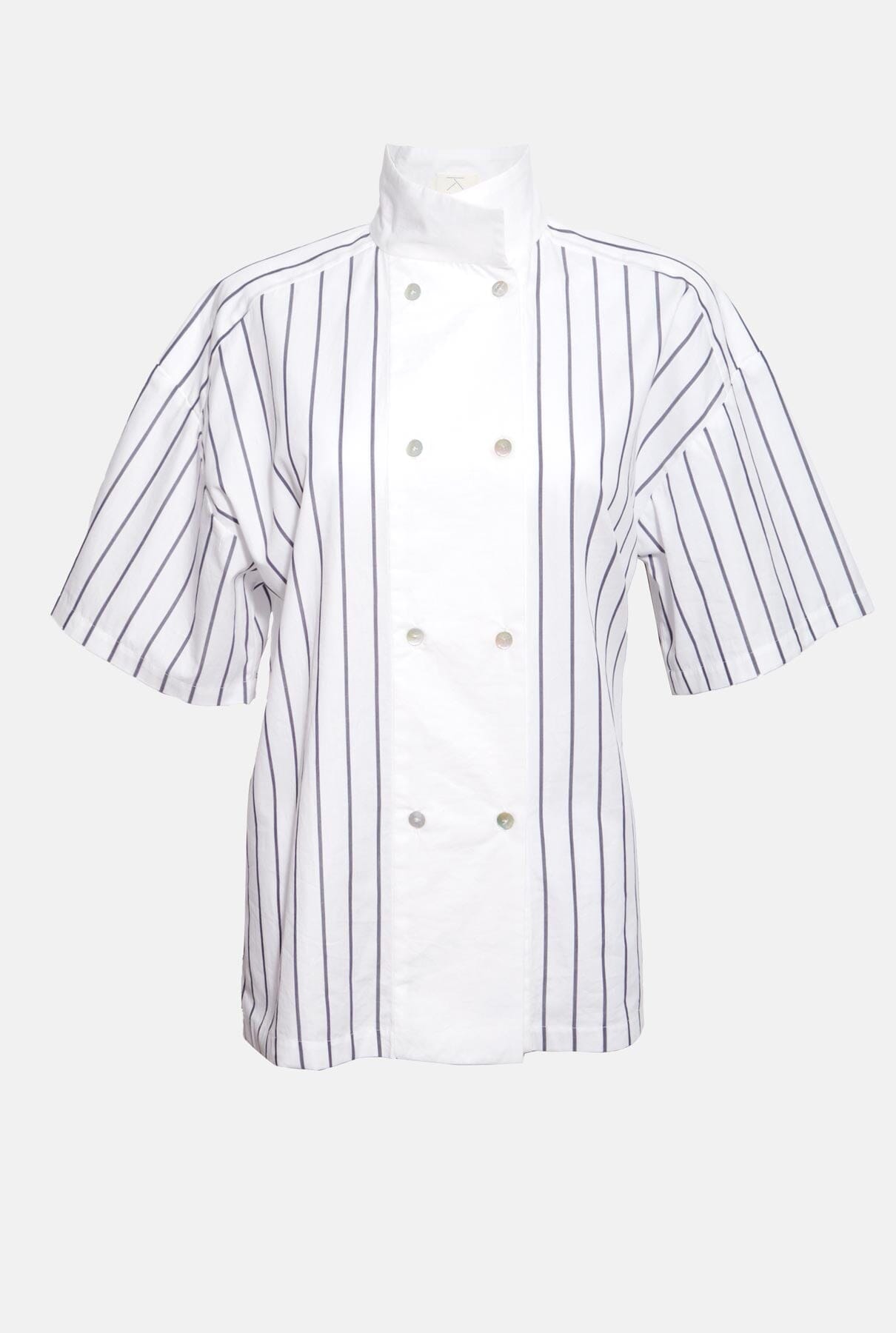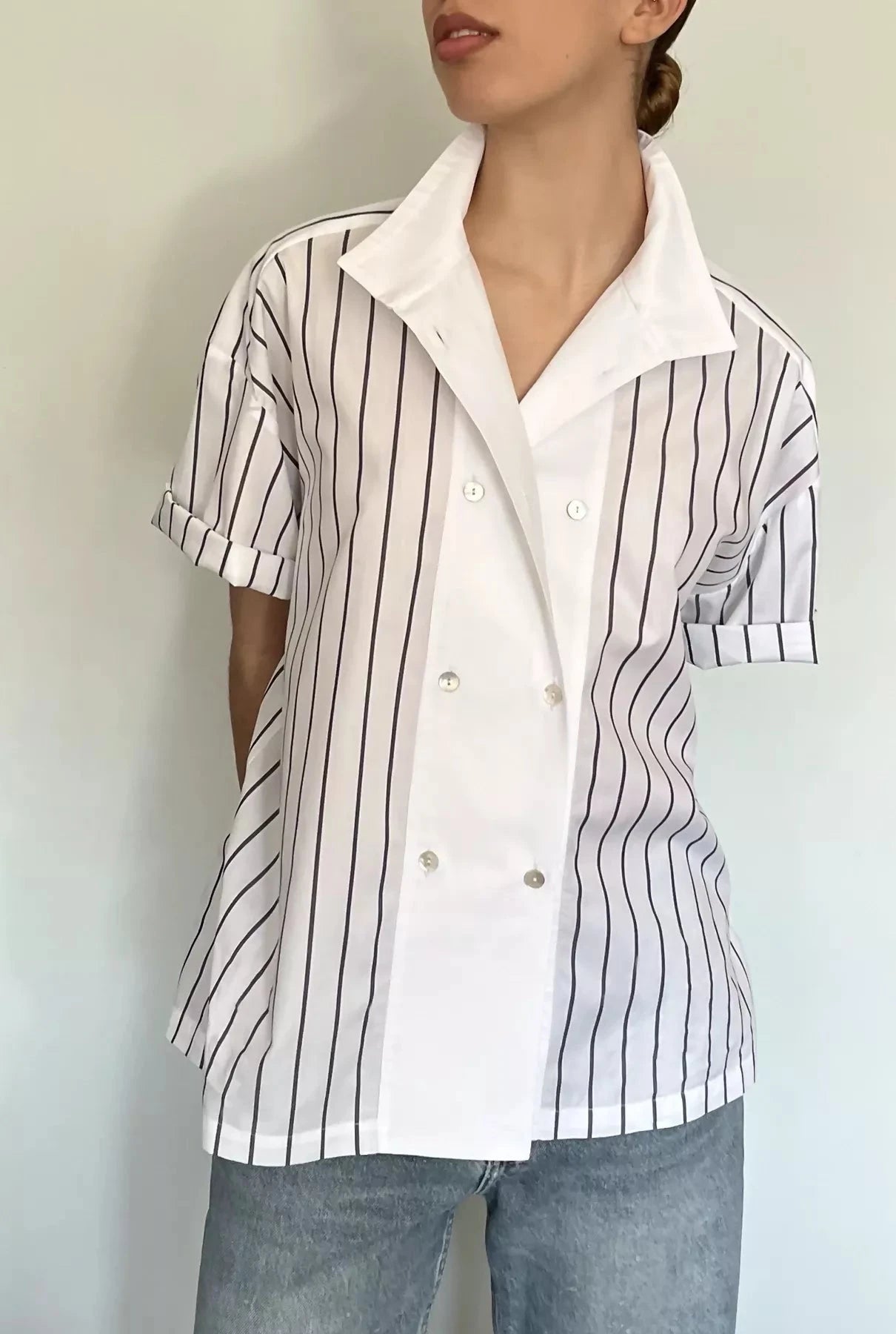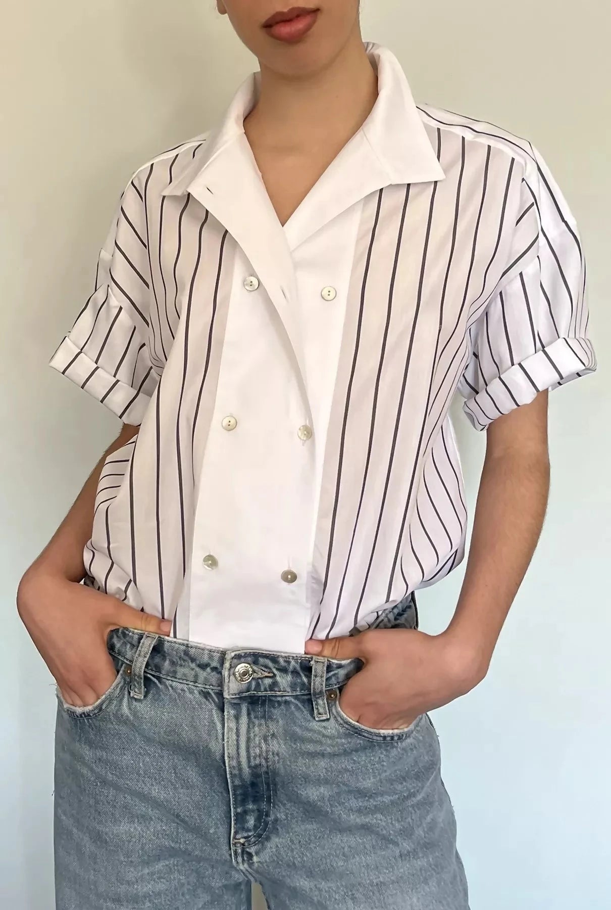Camisa de manga corta con cuello chimenea y cruzado central. Mangas caídas.