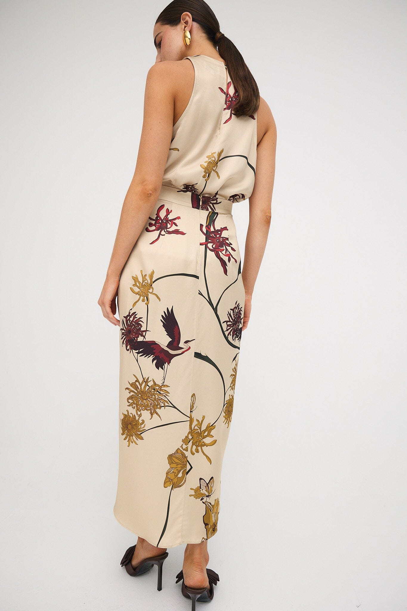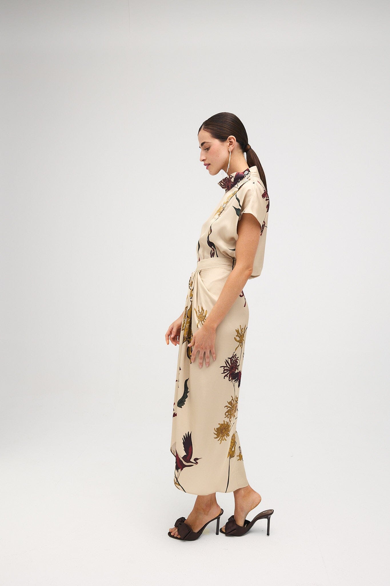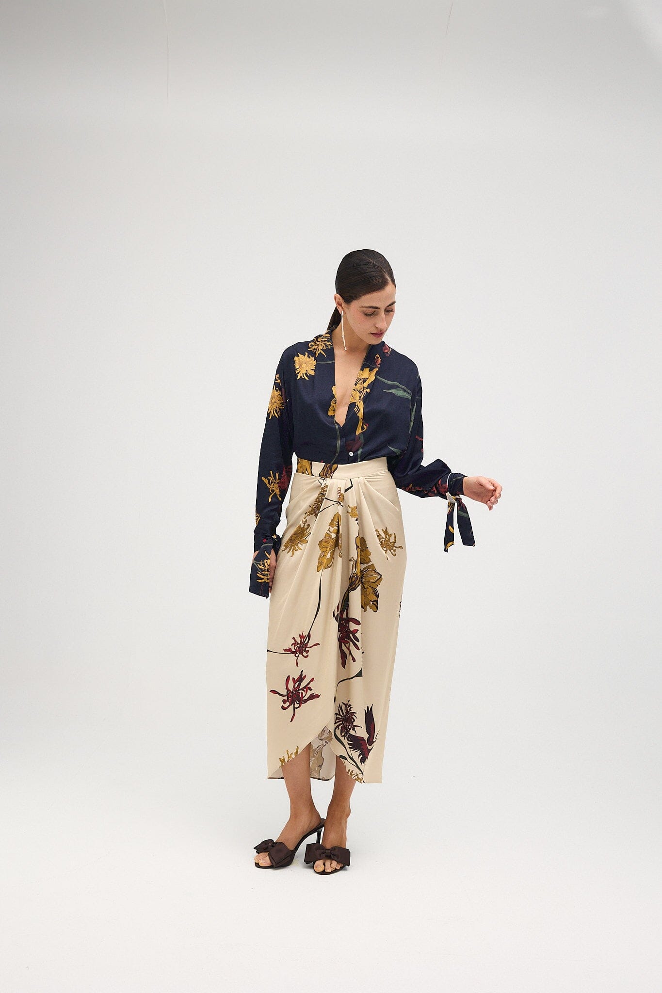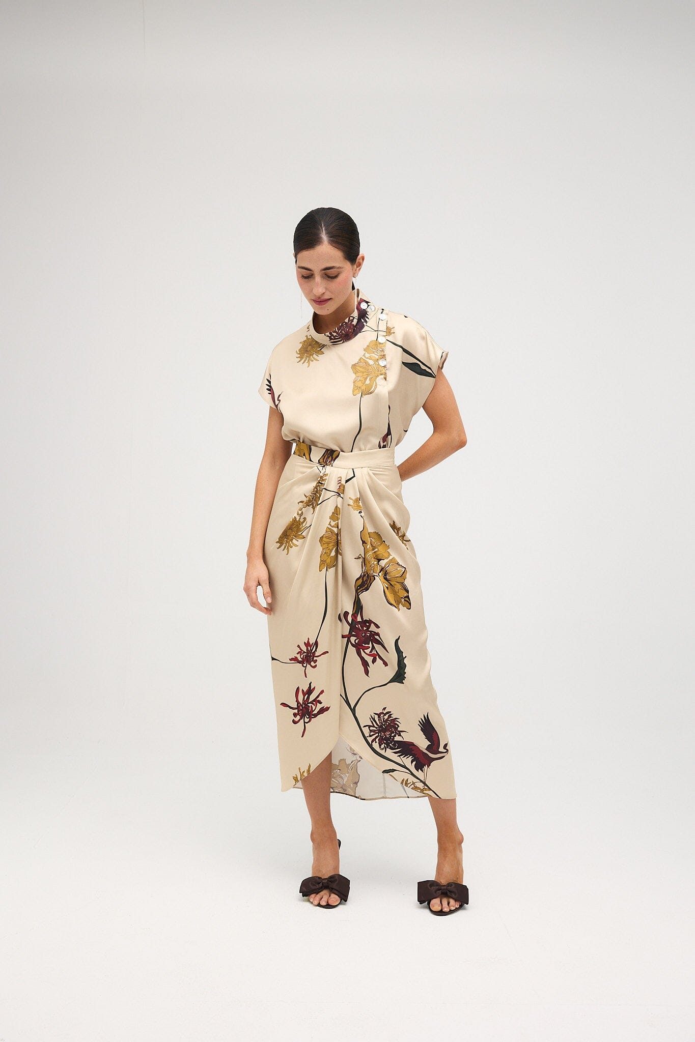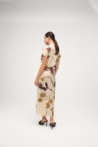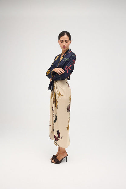 Falda midi drapeada en el centro delantero donde se cruza, dejando una abertura que permite entrever las piernas. Está cortada al bies, lo que favorece el ajuste y la adaptación al cuerpo. Cierra con cremallera en el centro de la espalda.