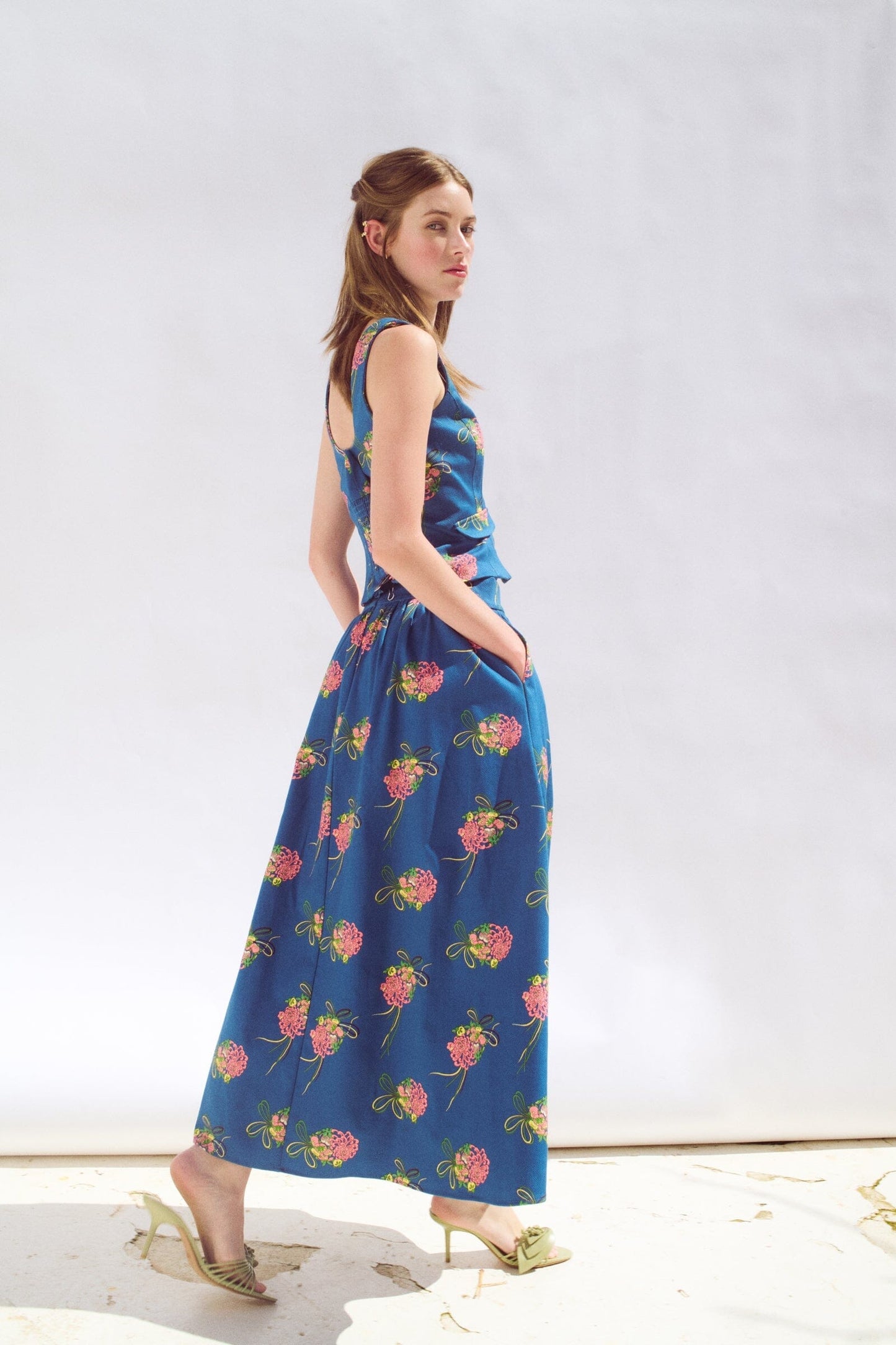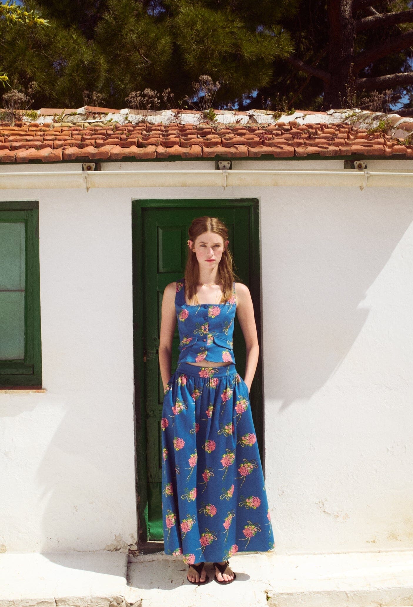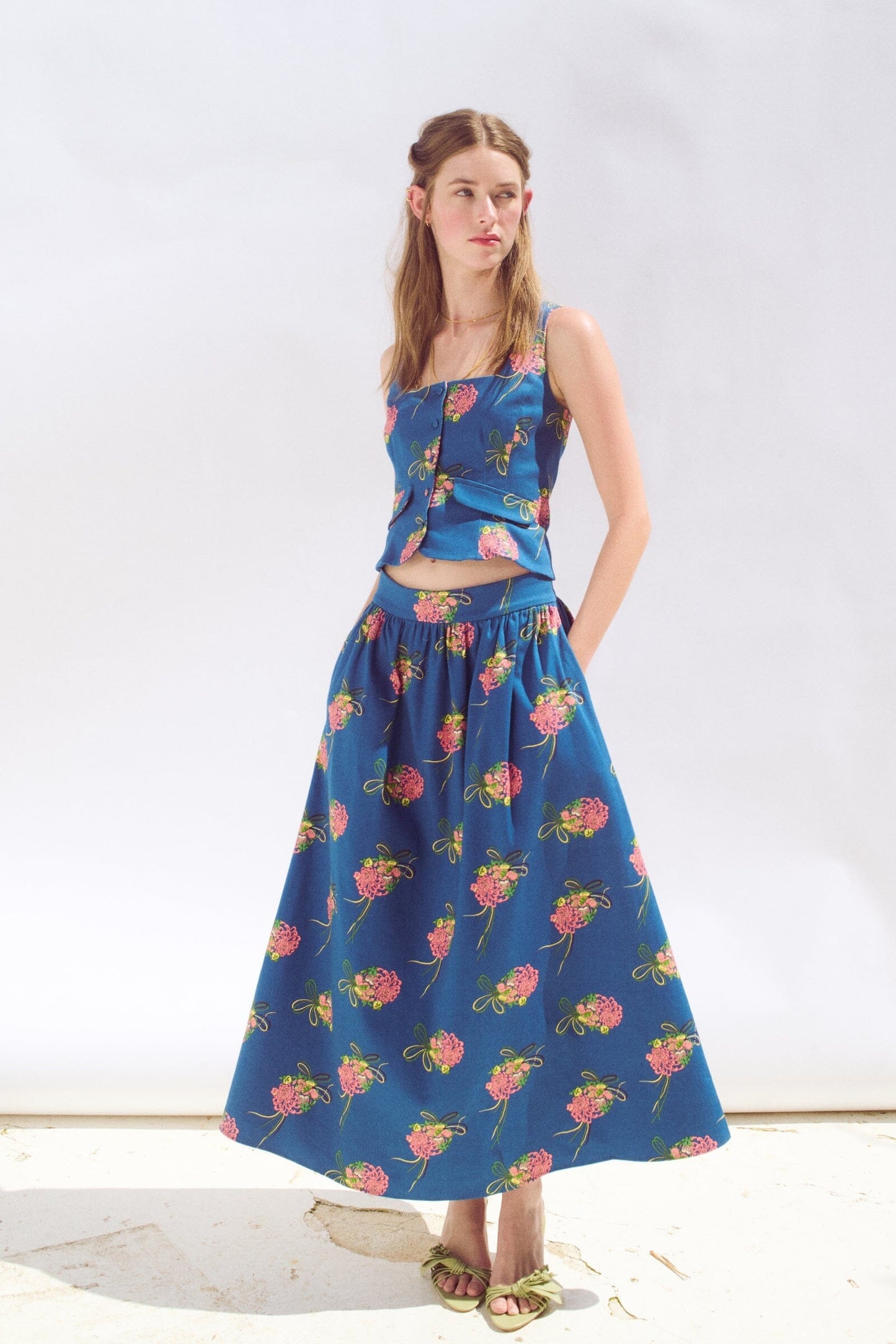 Falda larga de tiro alto con cinturilla ancha y frunces que aportan volumen.