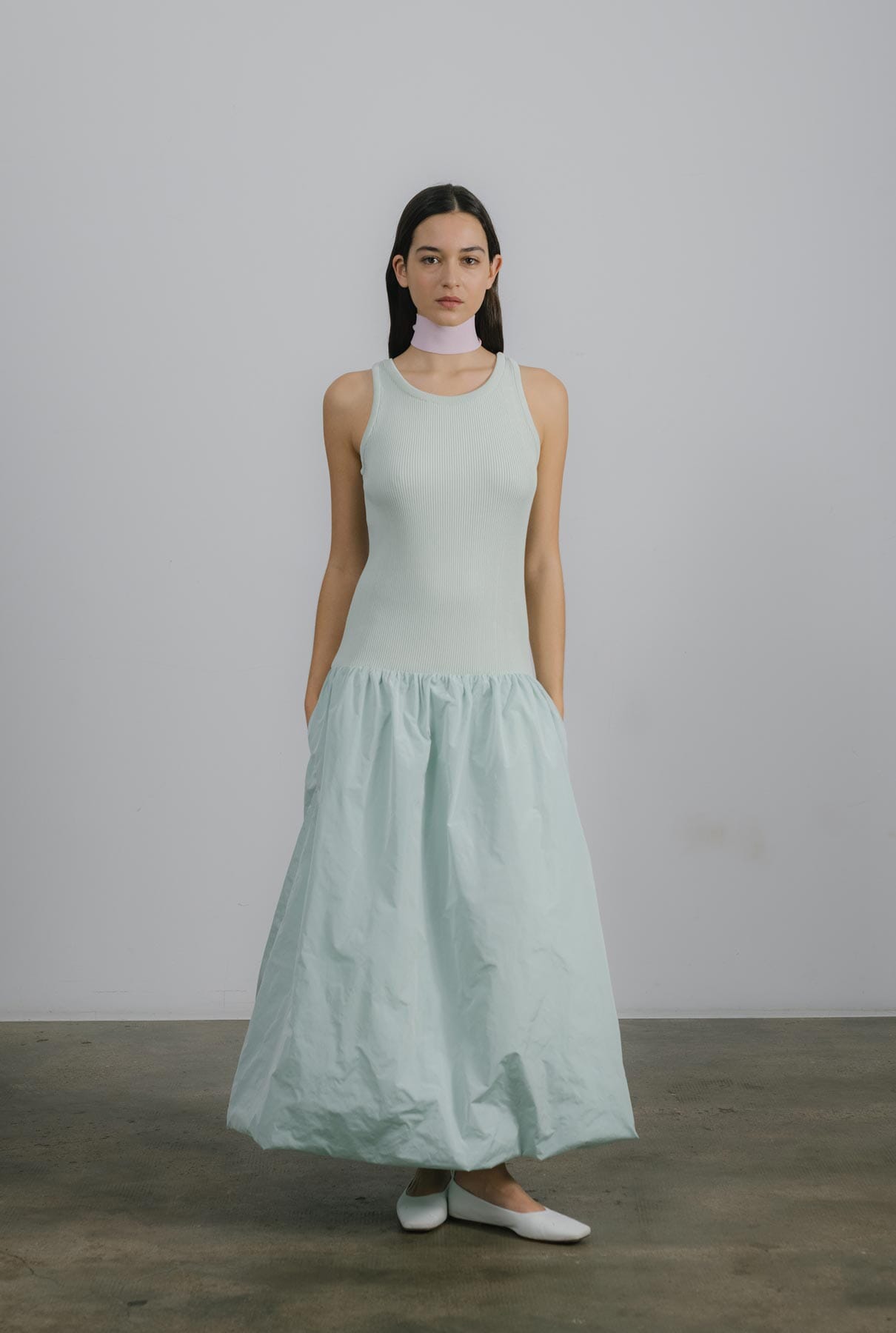 Una prenda versátil para añadir a tu colección cápsula como minivestido abullonado o falda midi abullonada, ideal para el día y la noche esta temporada. Incluye un top de punto y una fina falda de popelina con un elegante diseño de globo.