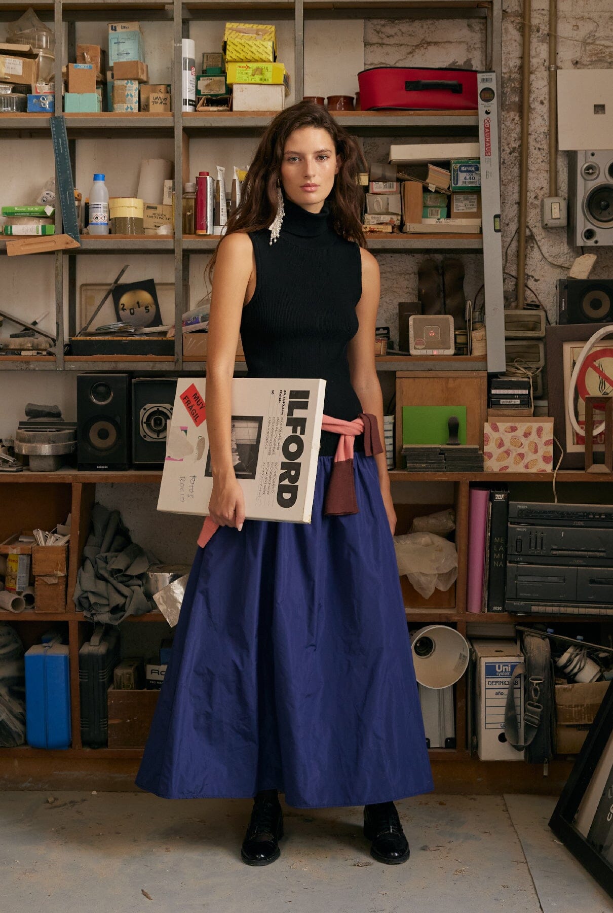 El vestido bicolor Frida da testimonio de la belleza de la sencillez. Está confeccionado con un top de punto acanalado sin mangas con cuello vuelto y una falda de tafetán de algodón ligeramente fruncida para una gran libertad de movimiento. La cintura baja resalta la forma de tu cuerpo.