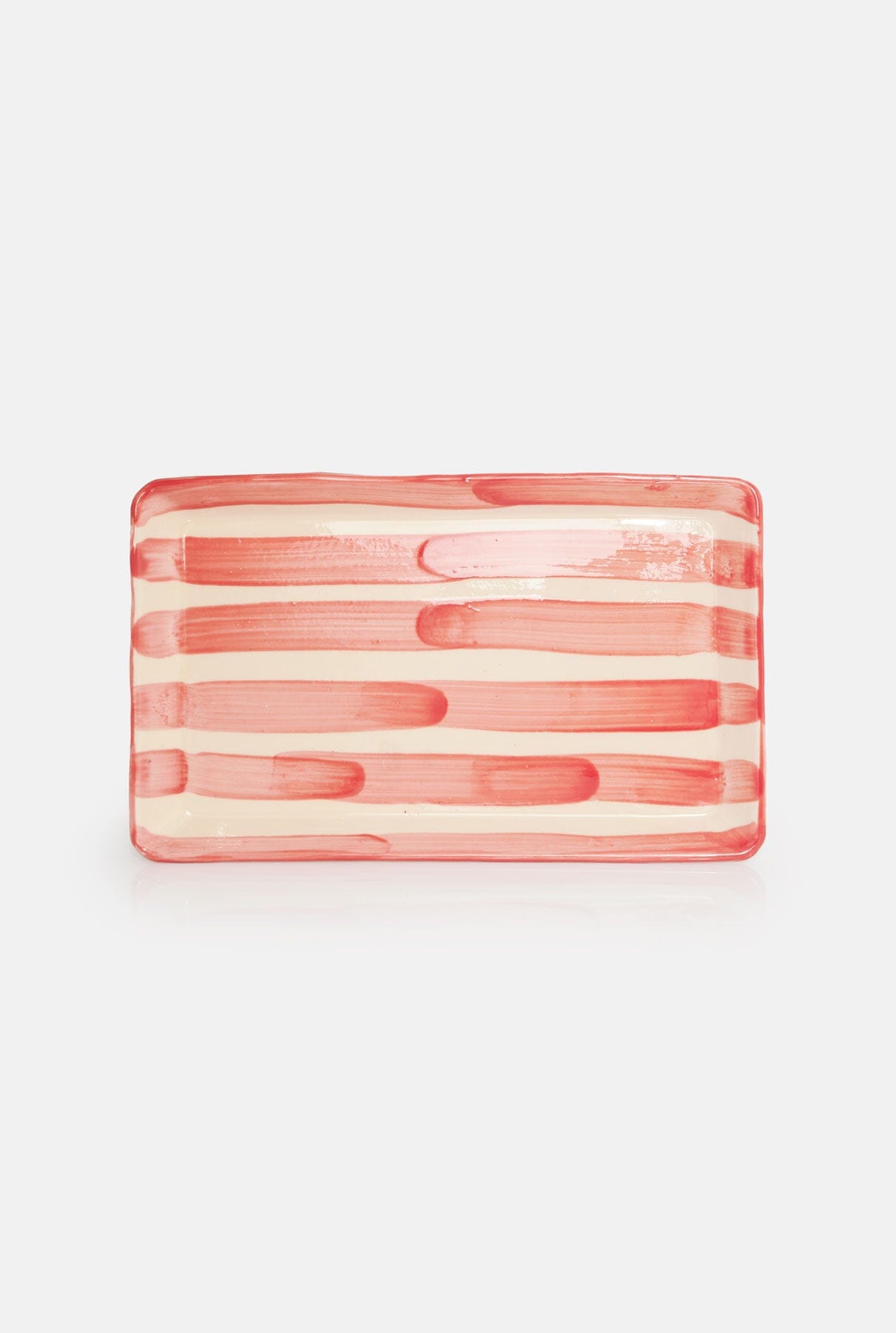 1 bandeja de cerámica de la colección rayas rojas. Totalmente hechos a mano, por lo que son únicos, no hay dos iguales y pueden tener algunas irregularidades que los hacen aún más especiales.