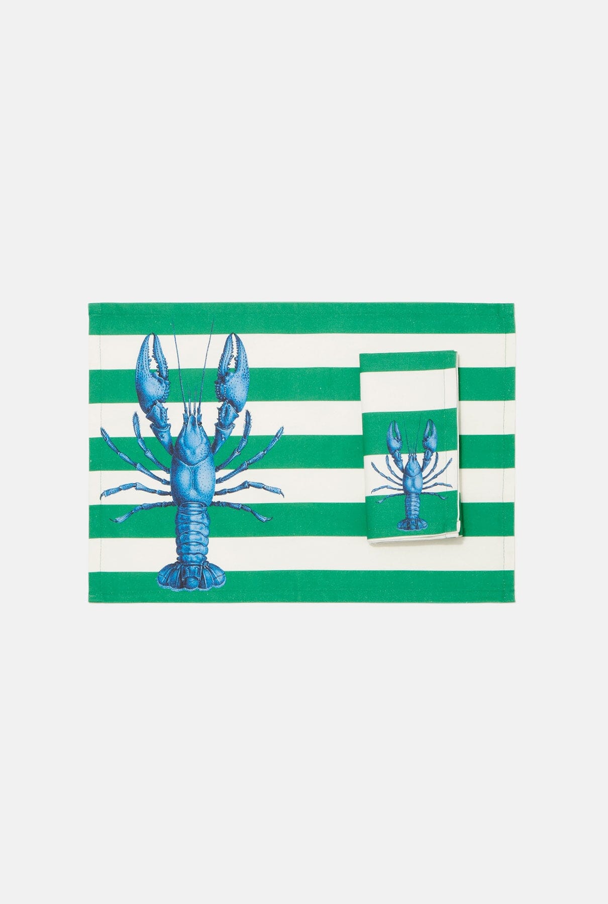 Pack de dos manteles individuales y dos servilletas de la colección Bogavante azul con rayas verdes y blancas. 100% algodón orgánico y fabricado en España.