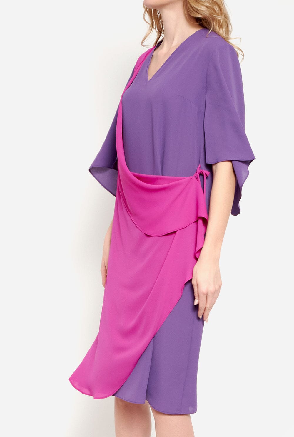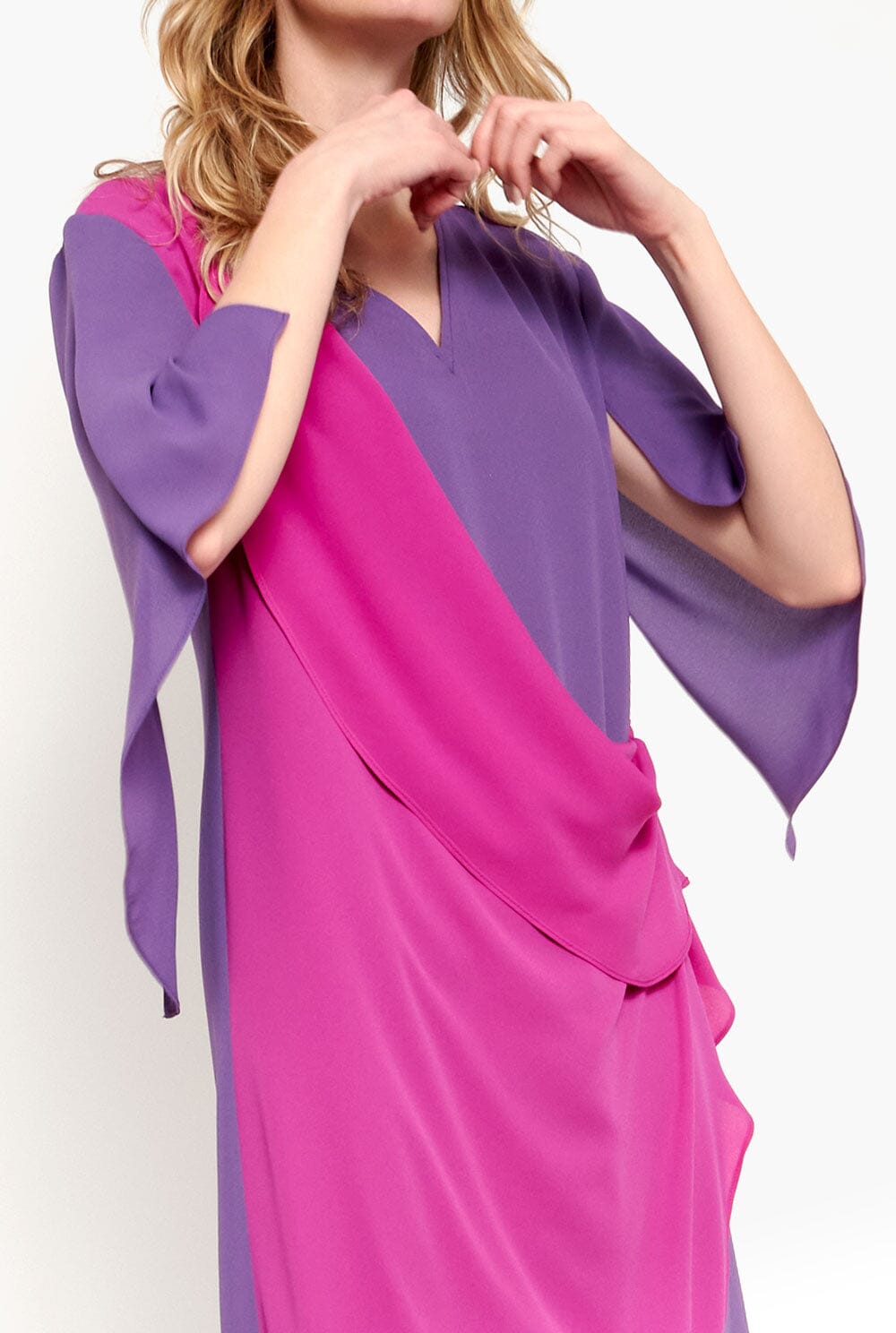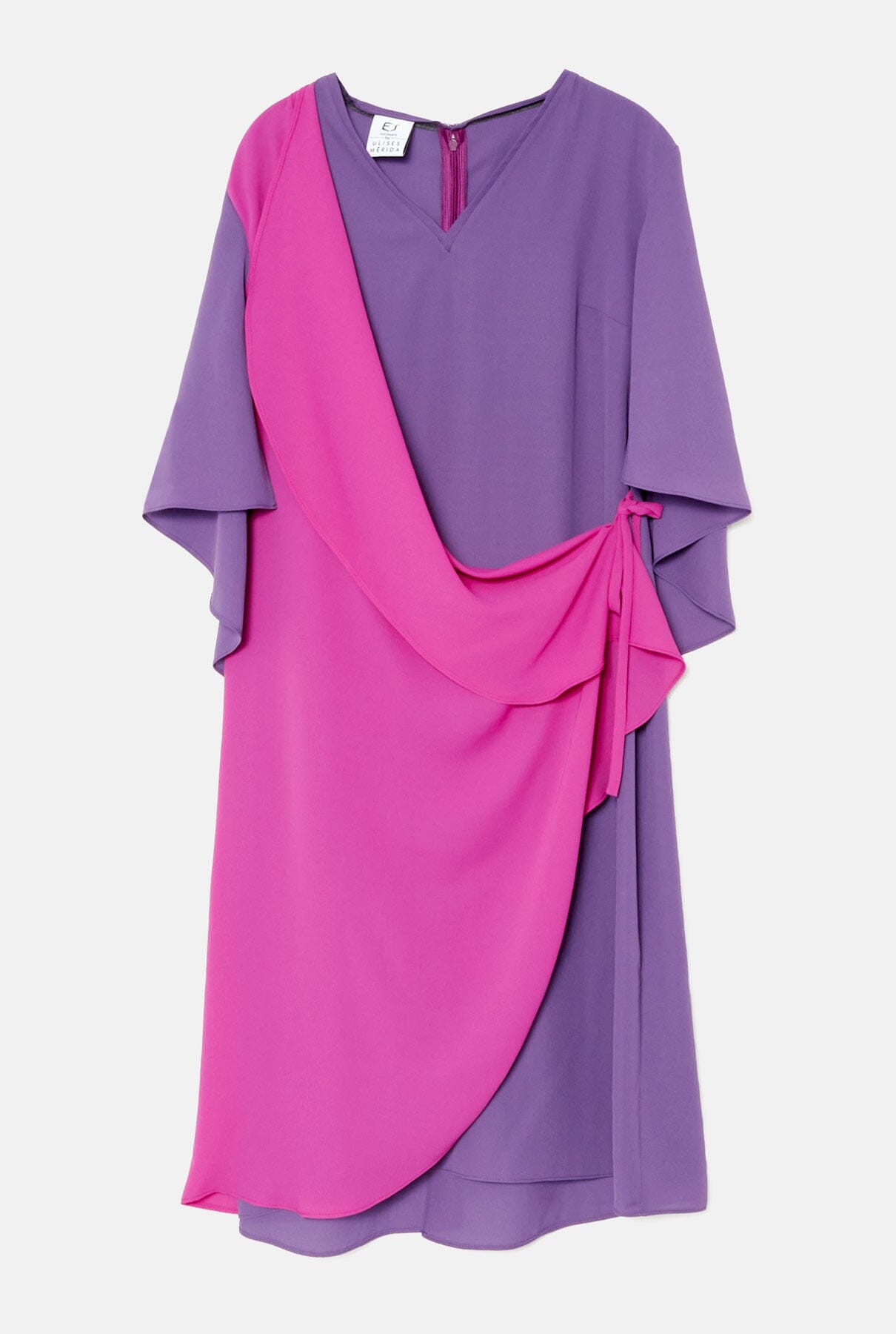 Vestido raso bicolor. Manga del cabo. Cremallera trasera invisible.