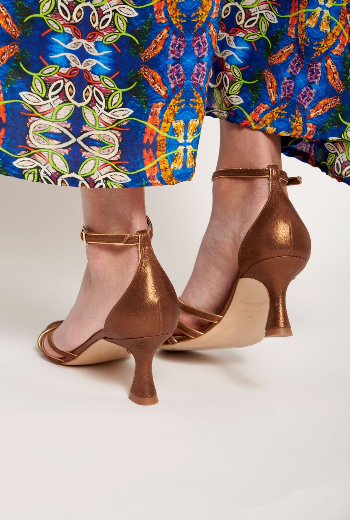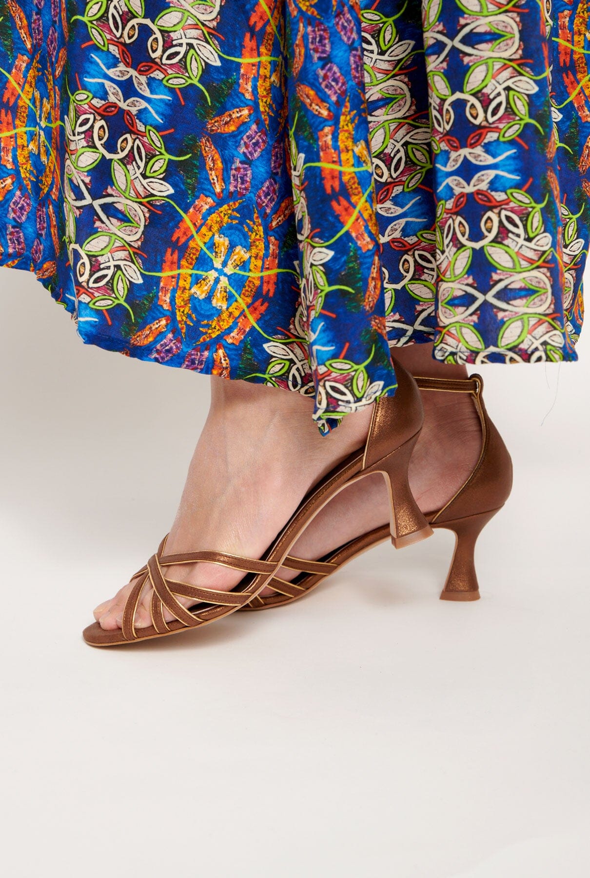 Sandalias de tiras metalizadas color bronce diseñadas para novias e invitadas, hechas a mano 100% en España. Tacón trapecio bajo, cómodo y estable. Plantilla acolchada para mayor comodidad.