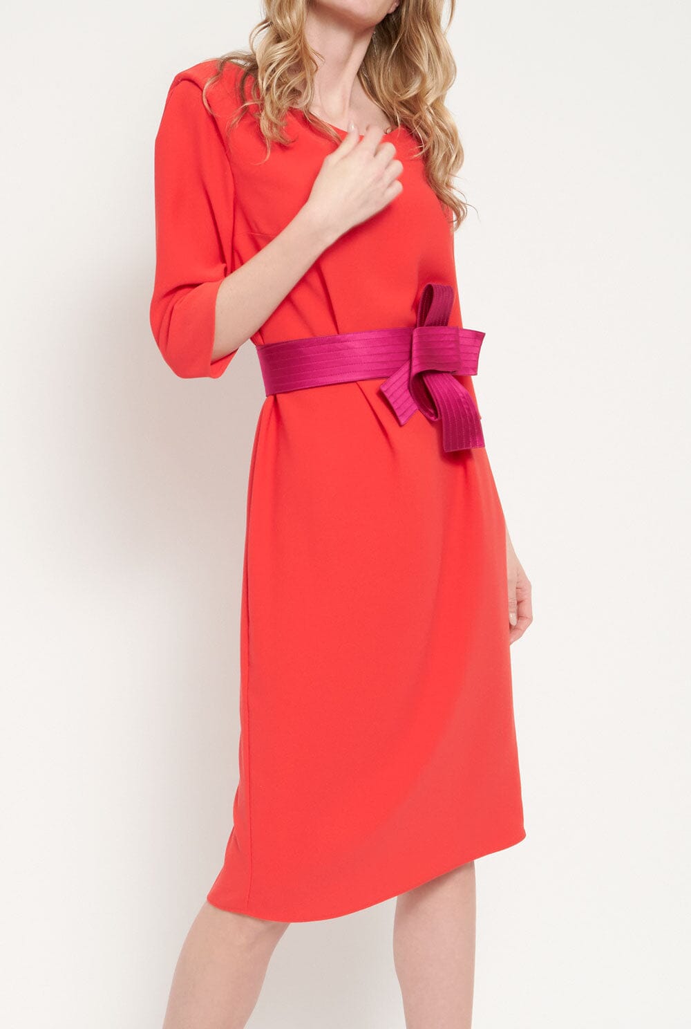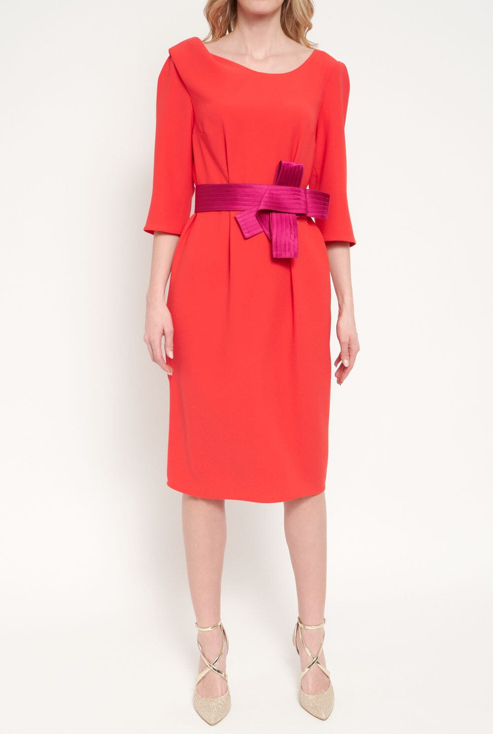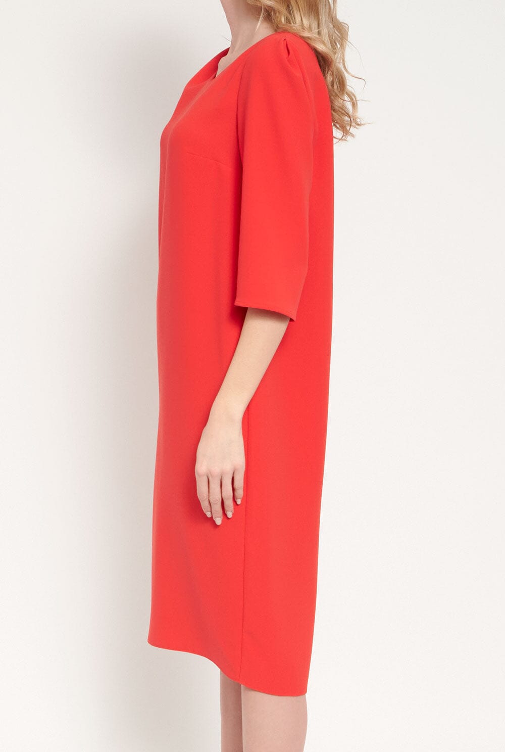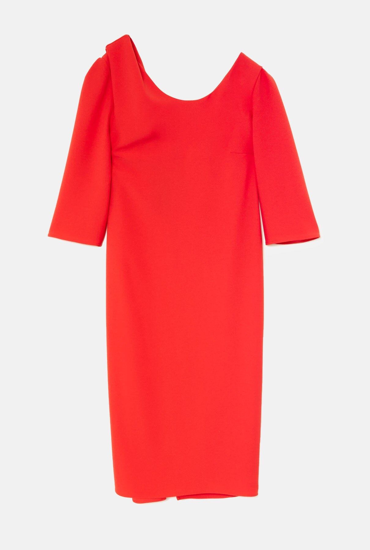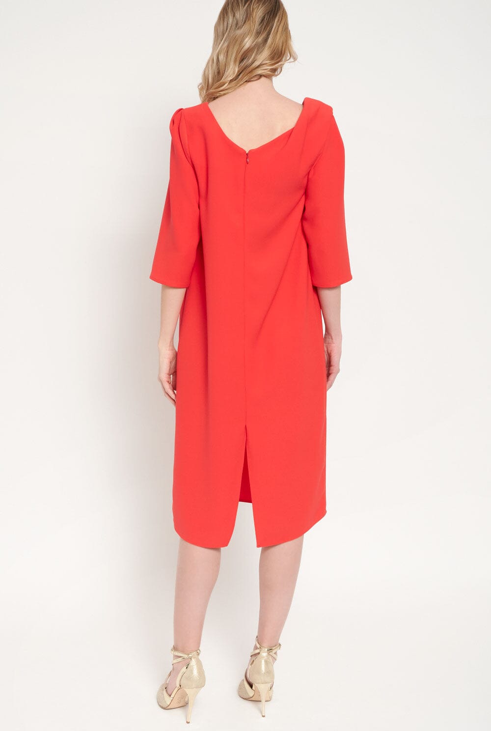 Vestido de crepé, media manga y largo midi. Cuello asimétrico. Cremallera trasera invisible.