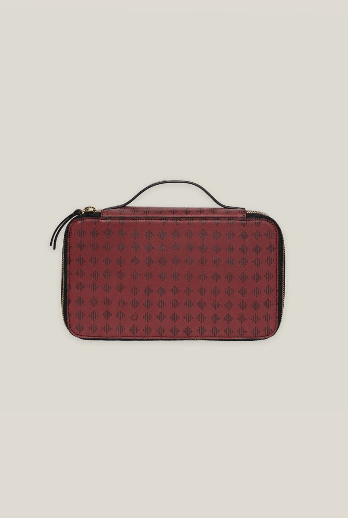 Realizado en suave piel de becerro. Estampado con nuestro estampado "linóleo" alternando el nombre de la casa "Dorantes" y una reproducción de una estampa de los interiores de antiguos carruajes. Disponible en negro avellana y rojo - negro.