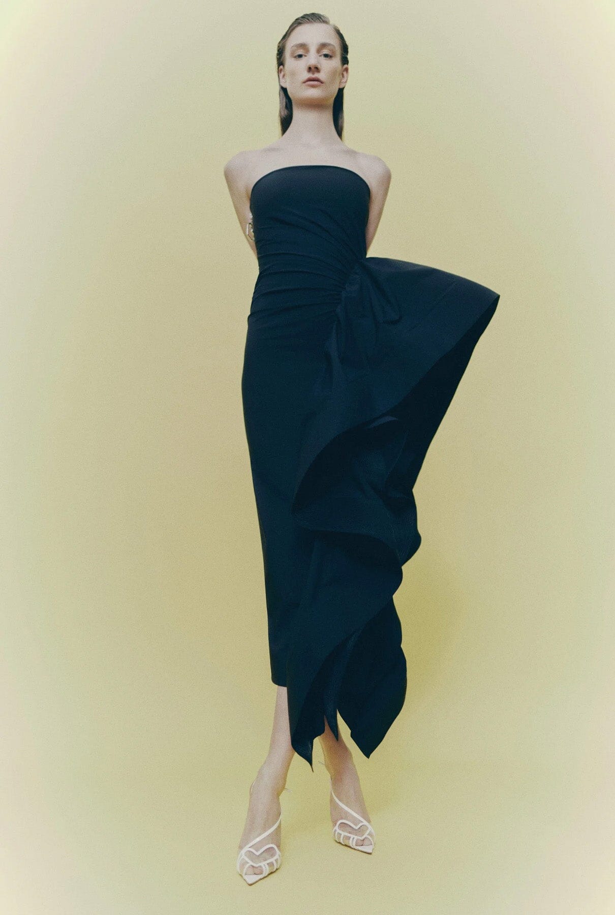 Vestido elástico hasta el tobillo, con escote palabra de honor, pequeño fruncido en un lateral que da paso a un doble volante en forma de U que adorna delantero y espalda, el maxi volante esconde una abertura lateral. El vestido se cierra con una cremallera metálica del corazón de Juan Vidal en el lado opuesto, ya que delante y detrás son iguales. Se puede realizar en todos los colores del mismo tejido disponibles en la web.