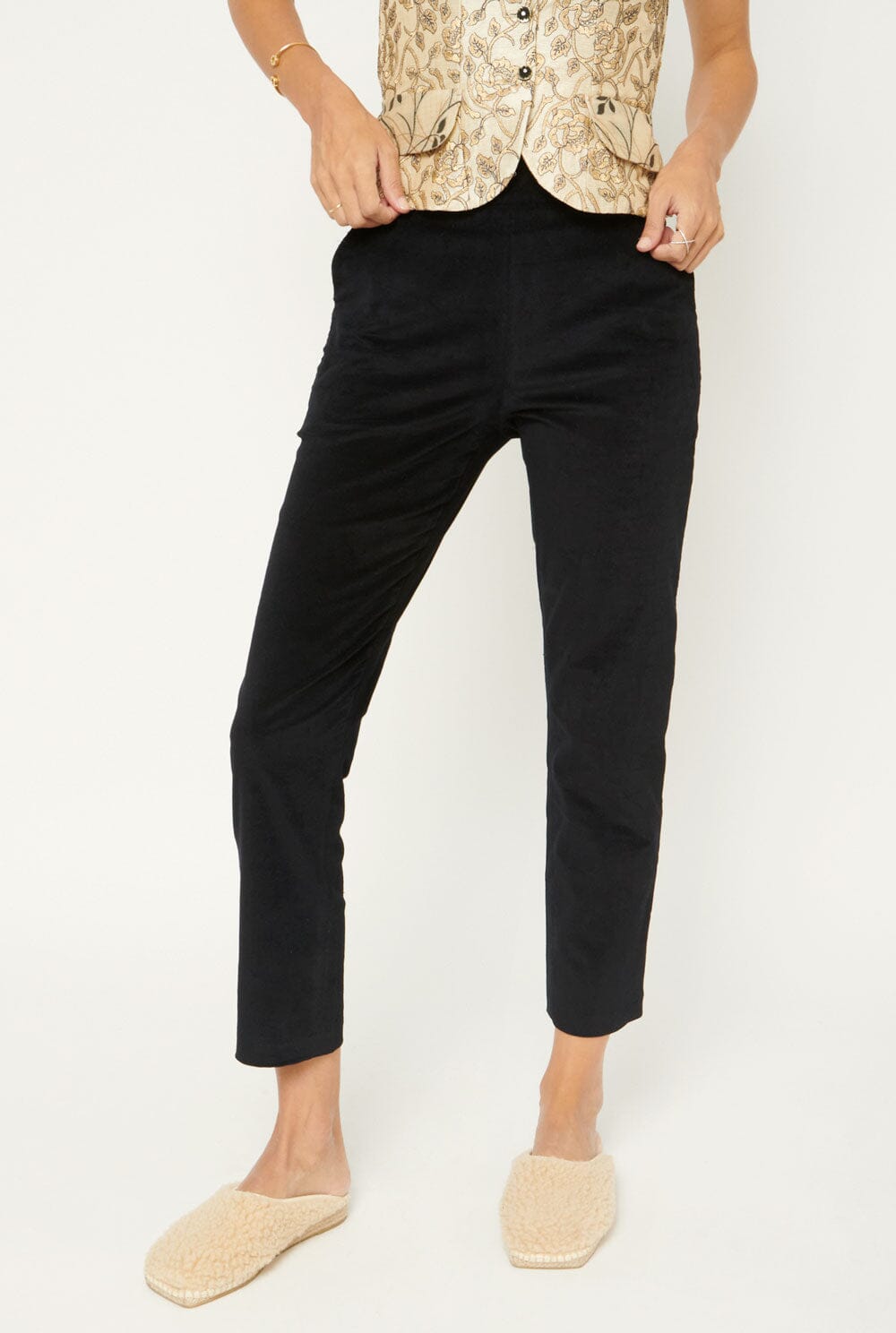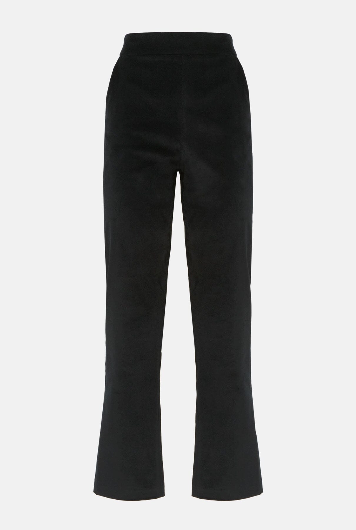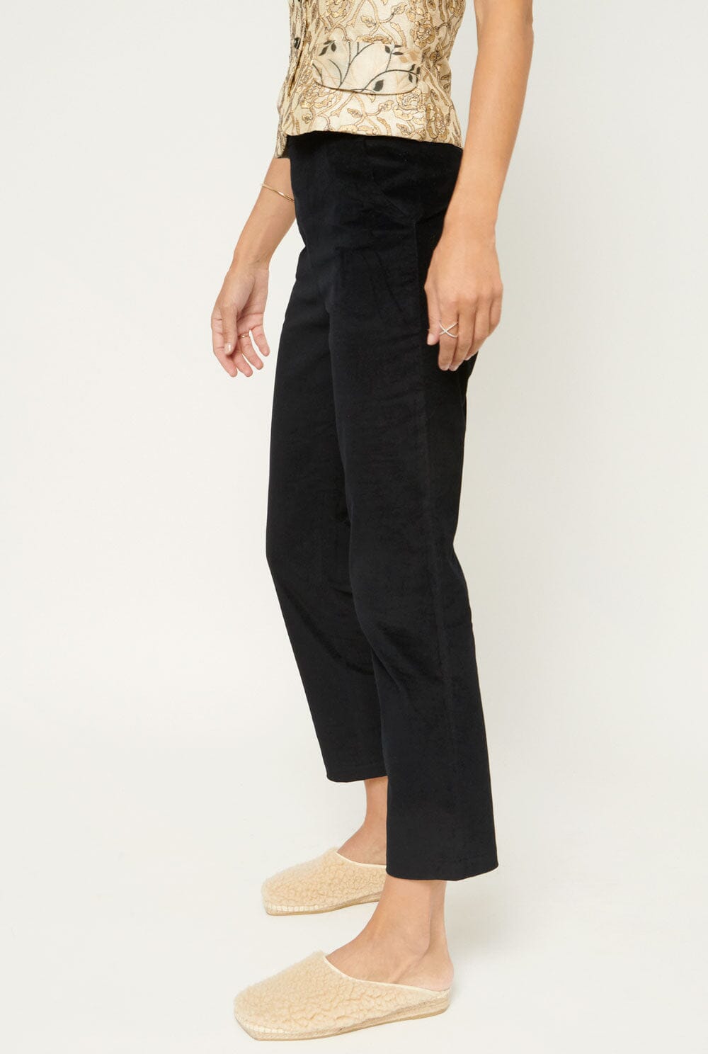 Pantalón de terciopelo negro con cierre de cremallera trasera.