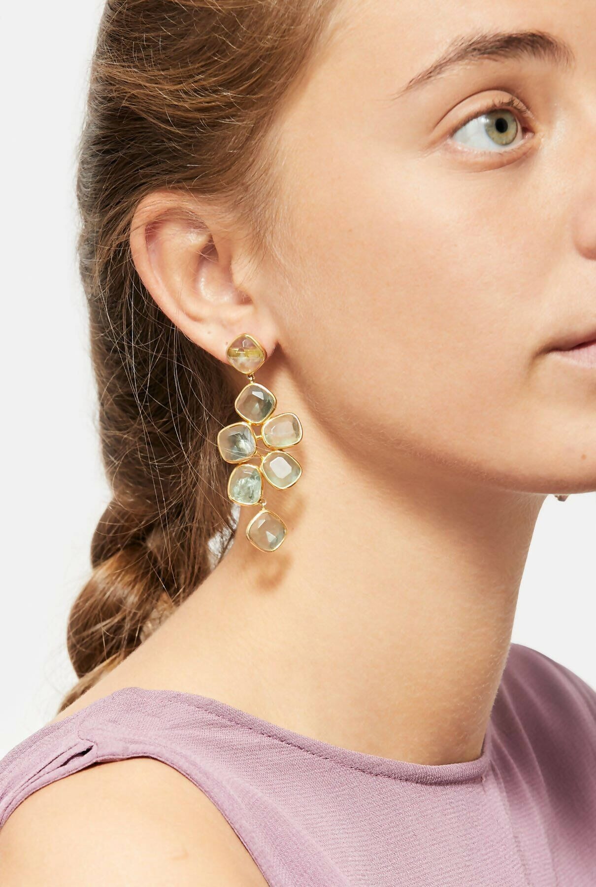 Pendientes Hydra bañados en oro con fluorita. Corte irregular tallado a mano. Diseñado por Coolook.