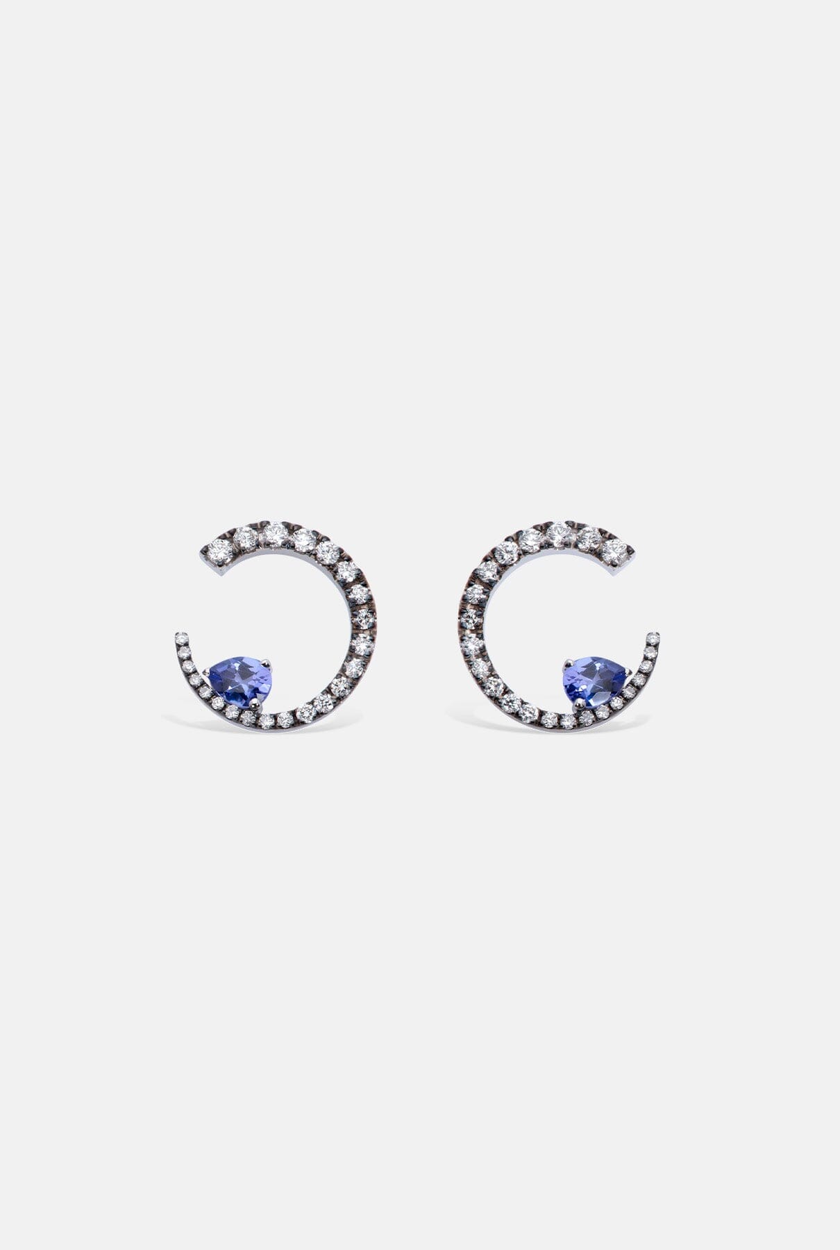 Pendientes de oro blanco de 18 kt con baño de rodio negro, diamantes (0,60 ct) y tanzanitas (0,60 ct). Diámetro exterior: 16 mm.